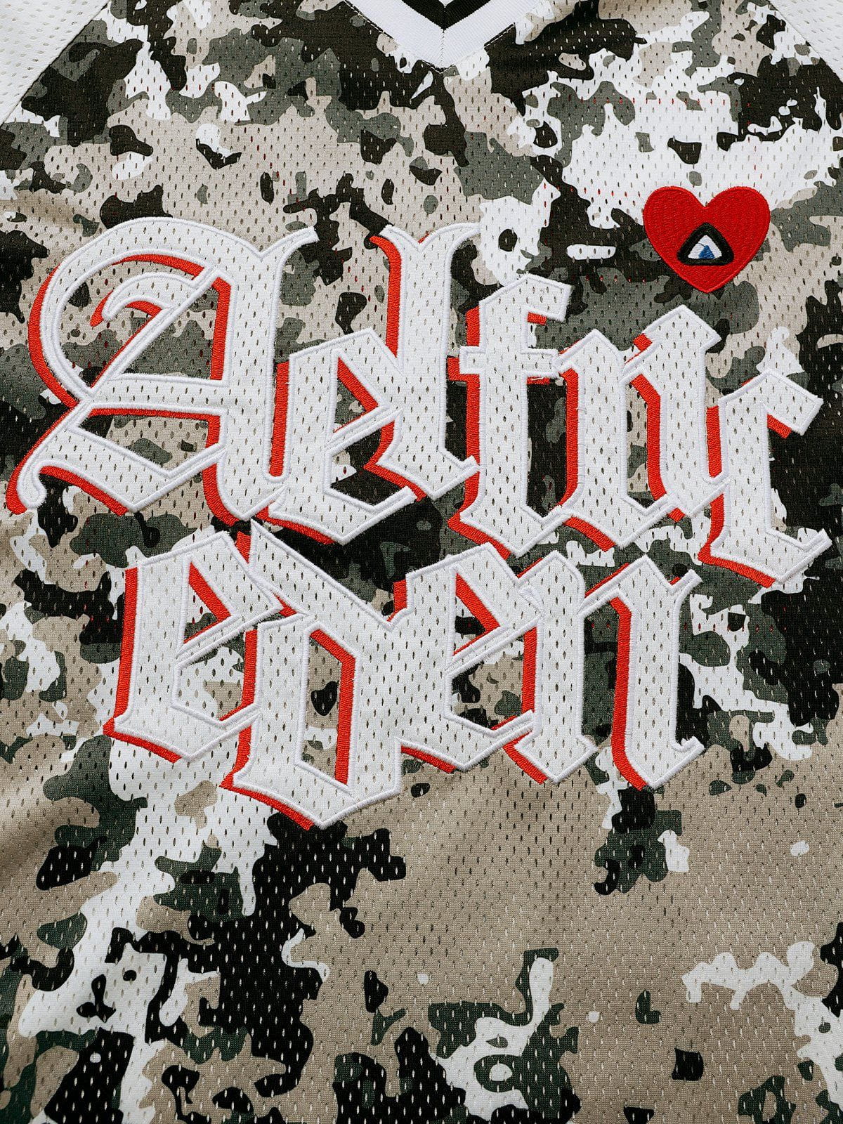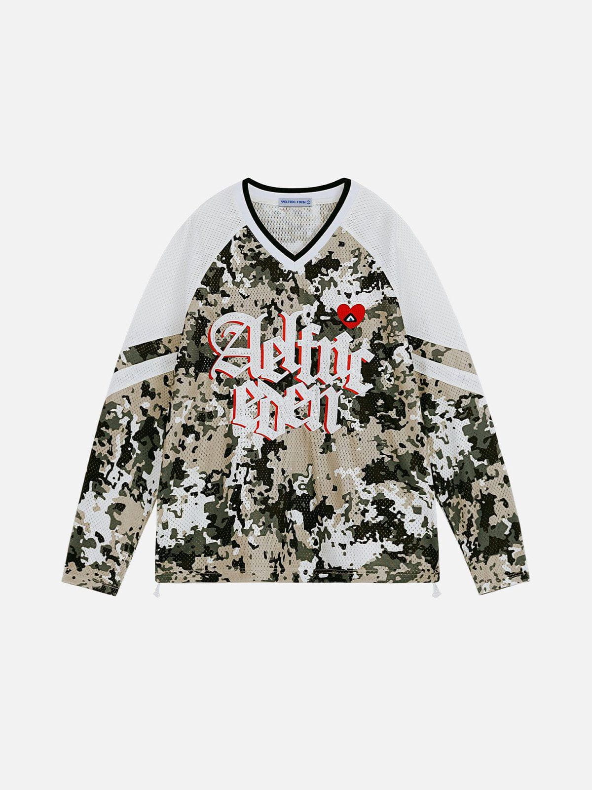 The Aelfric Eden Camouflage Patchwork Sweatshirt features a blend of camo and contrasting panels. with intricate embroidery and breathable fabric. offering both style and comfort.