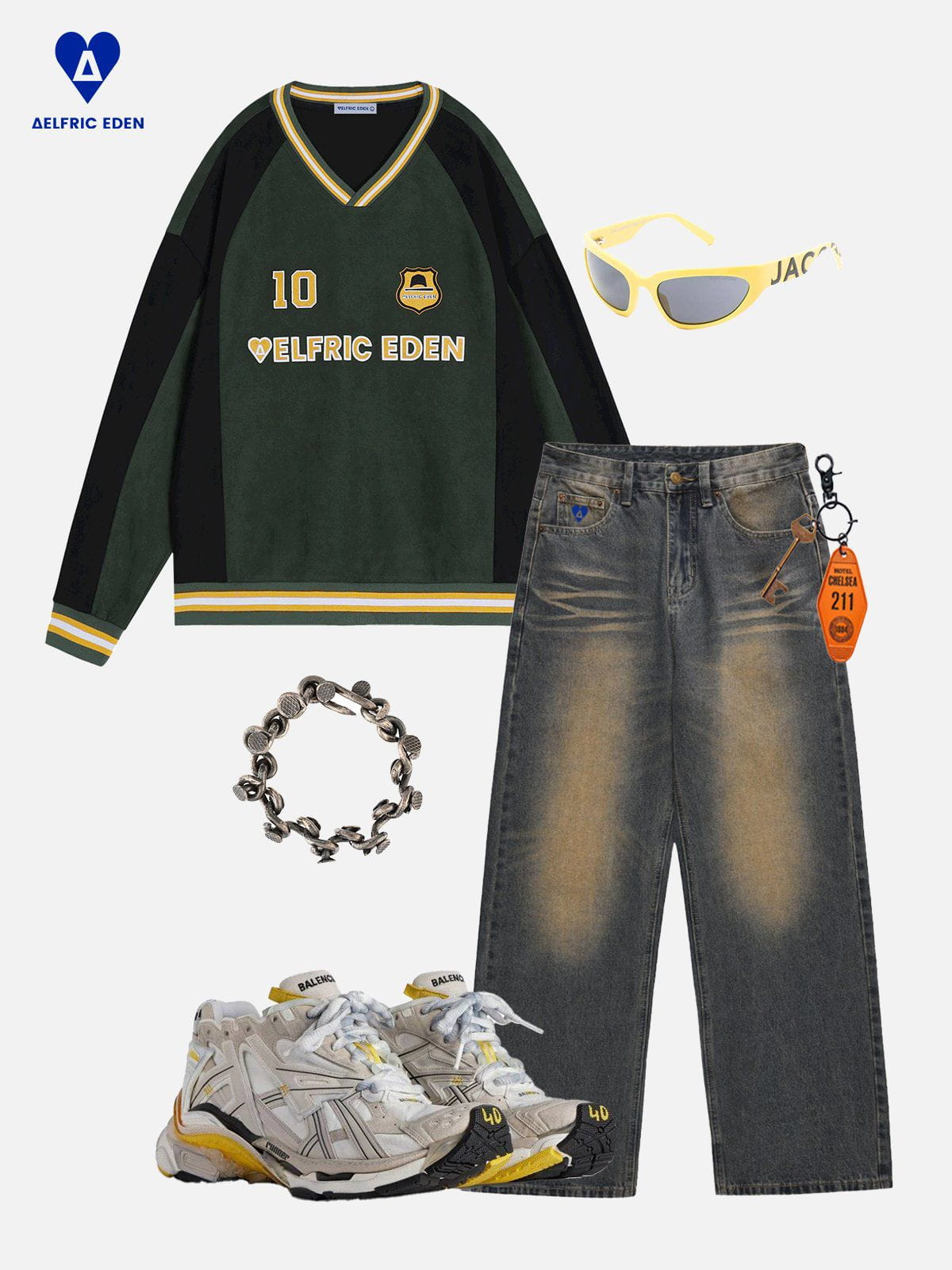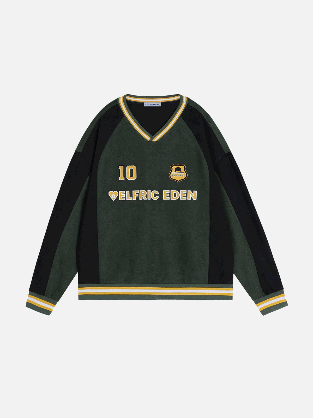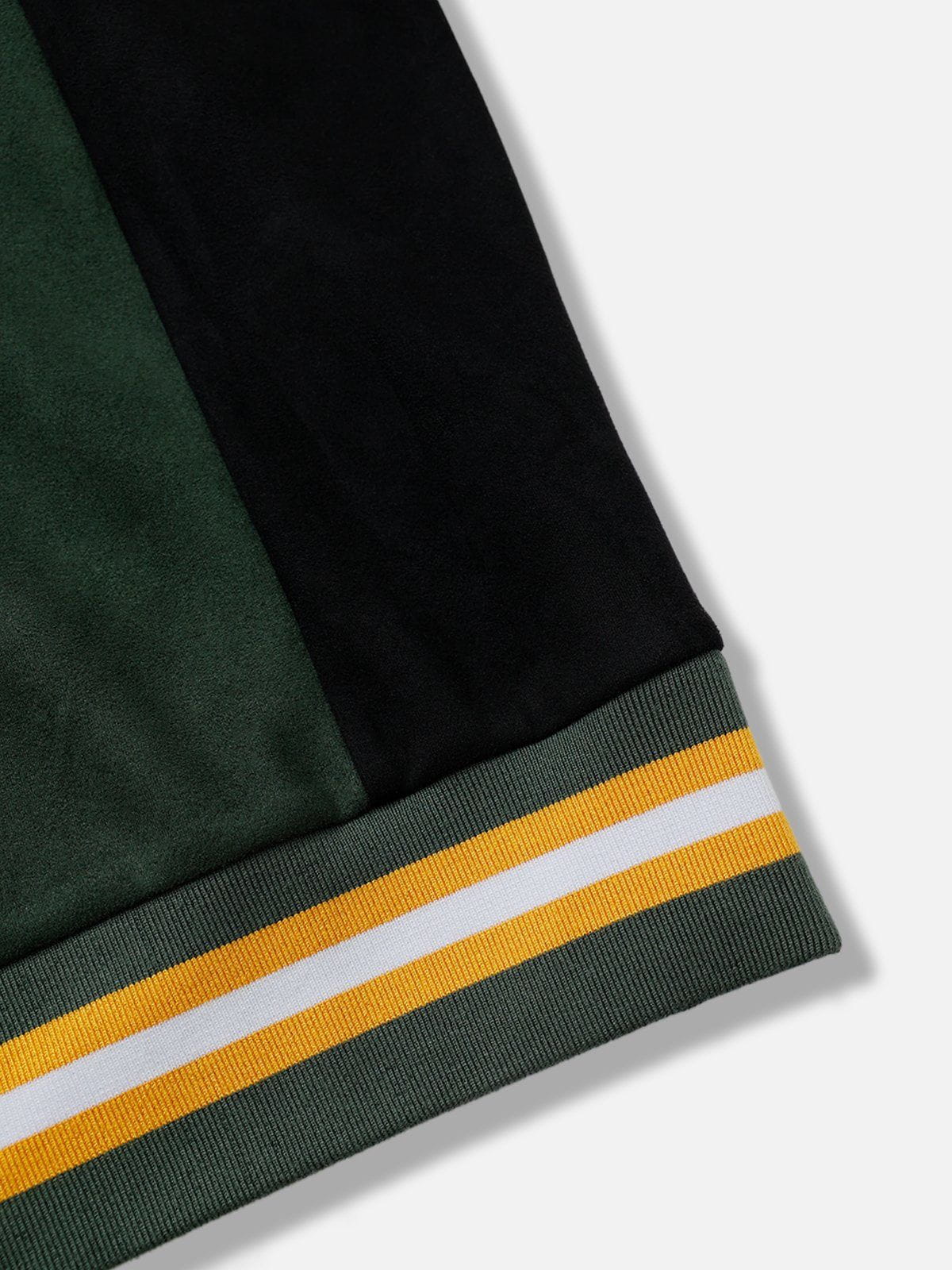 This sweatshirt features a bold color-blocking design with contrasting green and black tones. complemented by embroidered details for added texture and style. Crafted from soft suede fabric. it offers a luxurious feel and a relaxed fit.