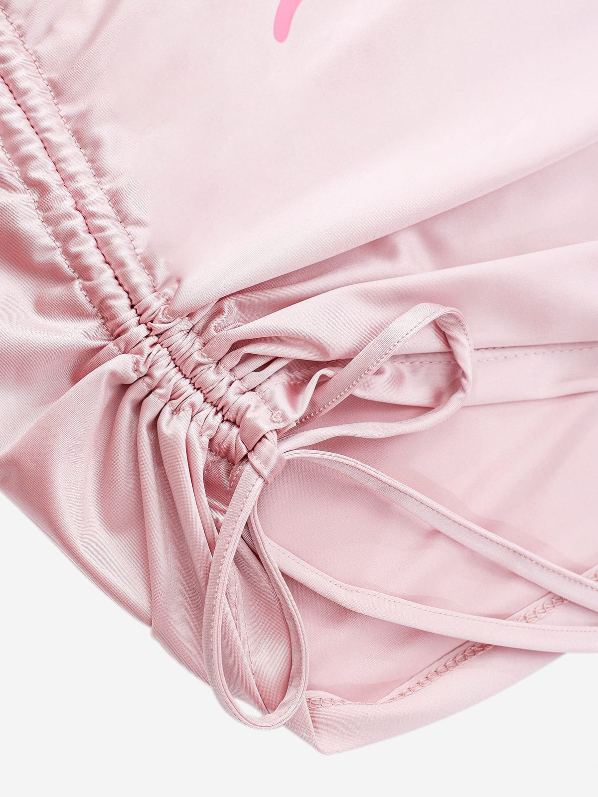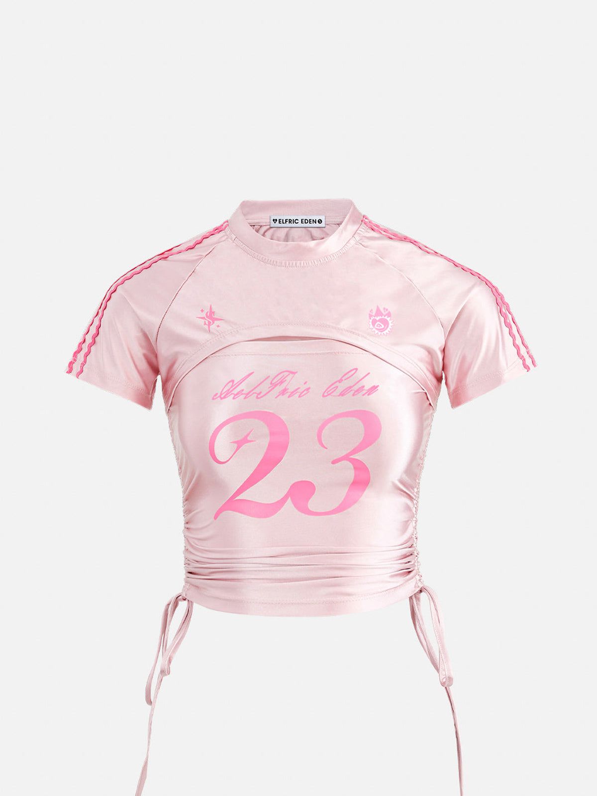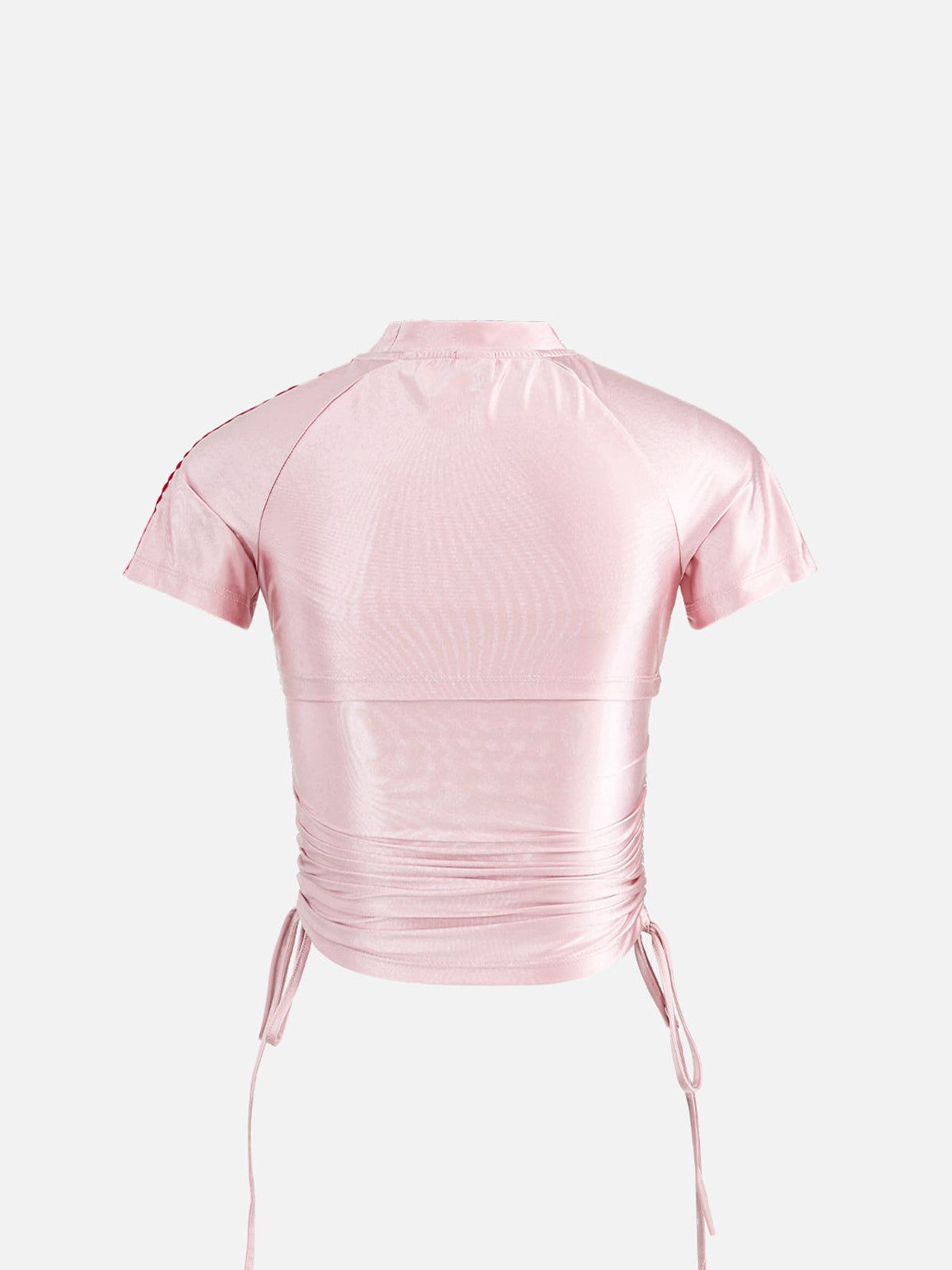 The Tee in pink sheen resembles a mist in a dream. emanating a vibe of agility and strength. This wrinkle-textured tee is all about flexibility ?? designed with a convertible silhouette. it can be worn two ways to match your mood or outfit. An adjustable drawstring adds customizable shape. letting you cinch it tighter or wear it loose and flowy.