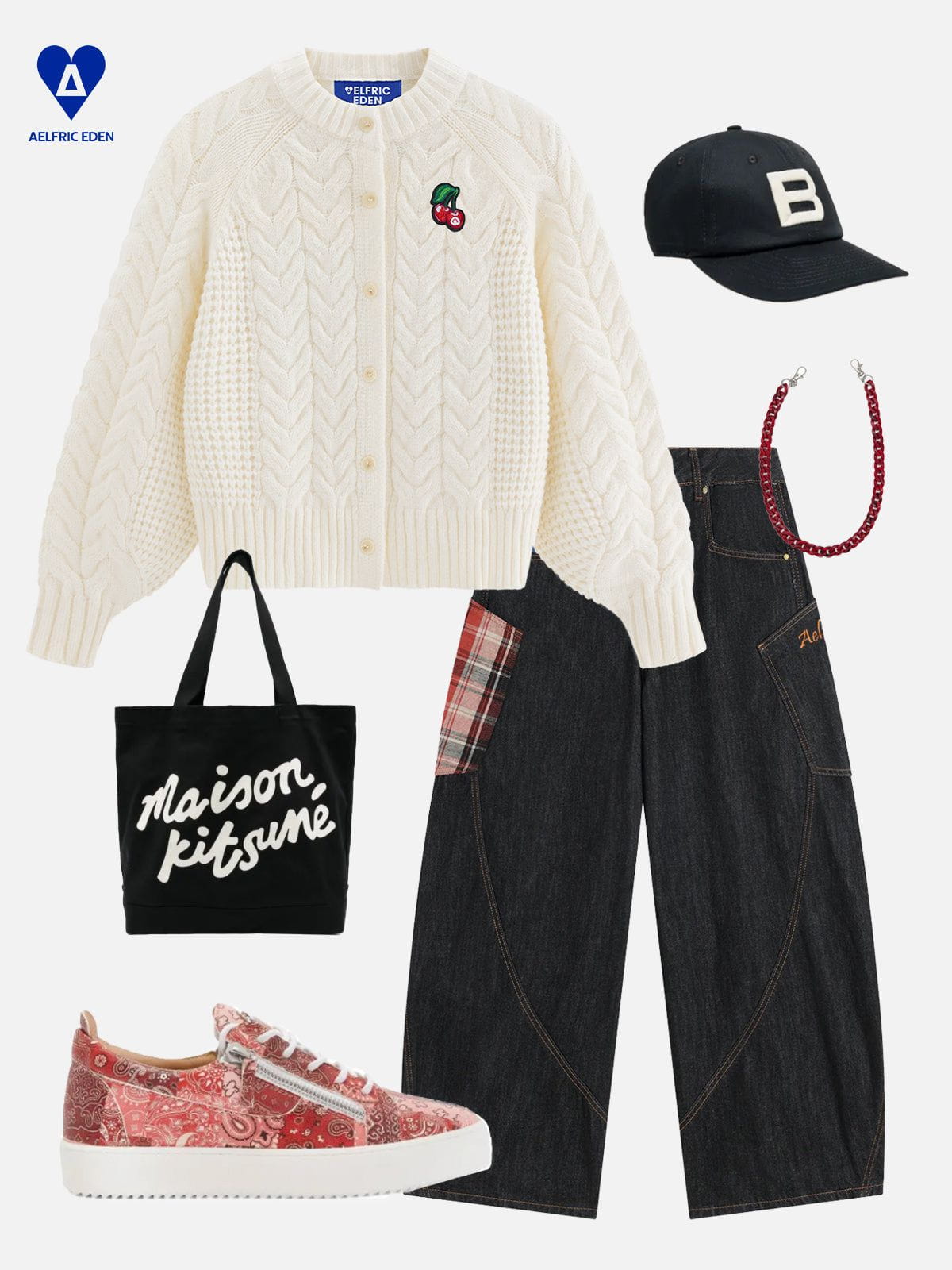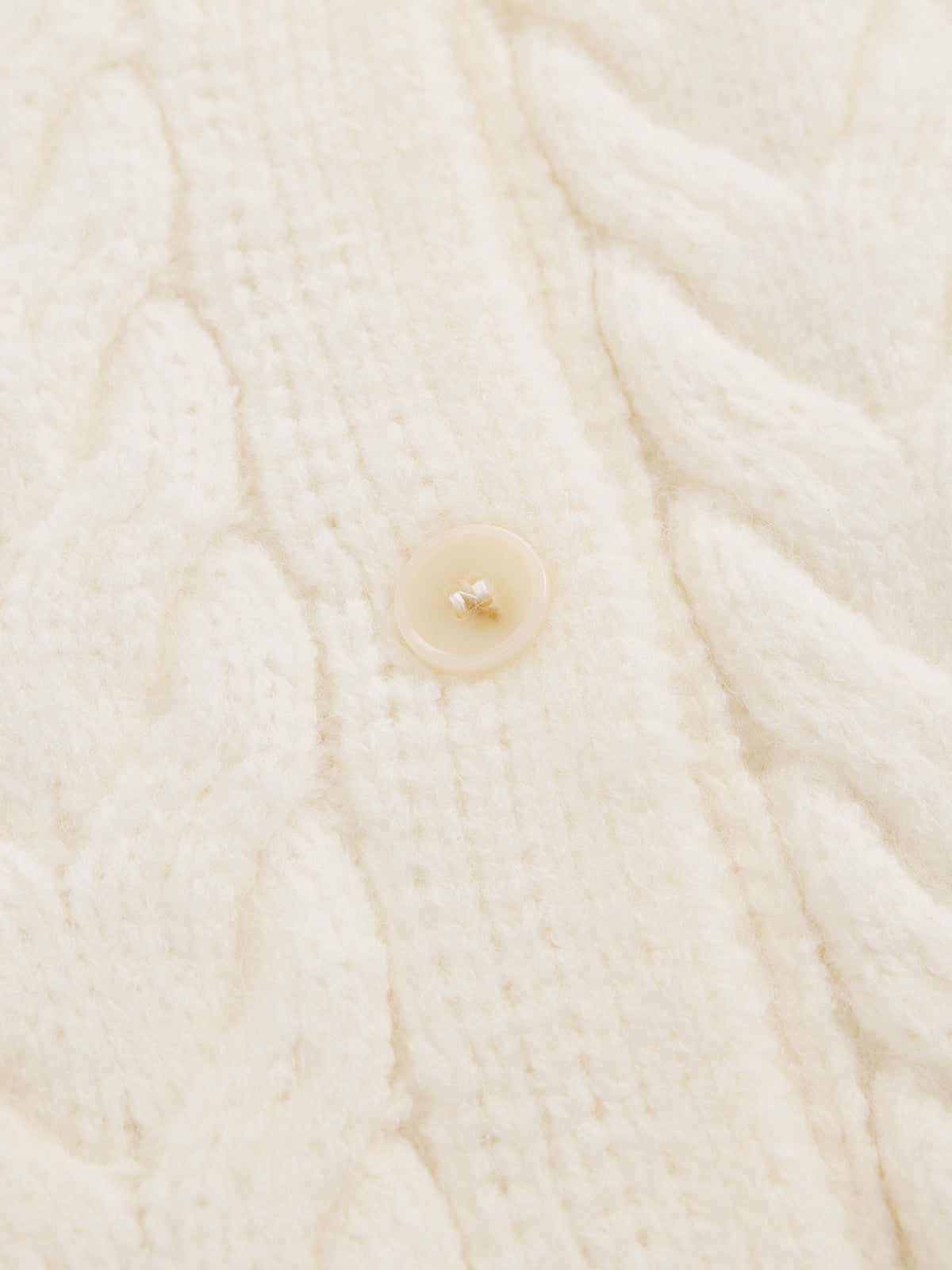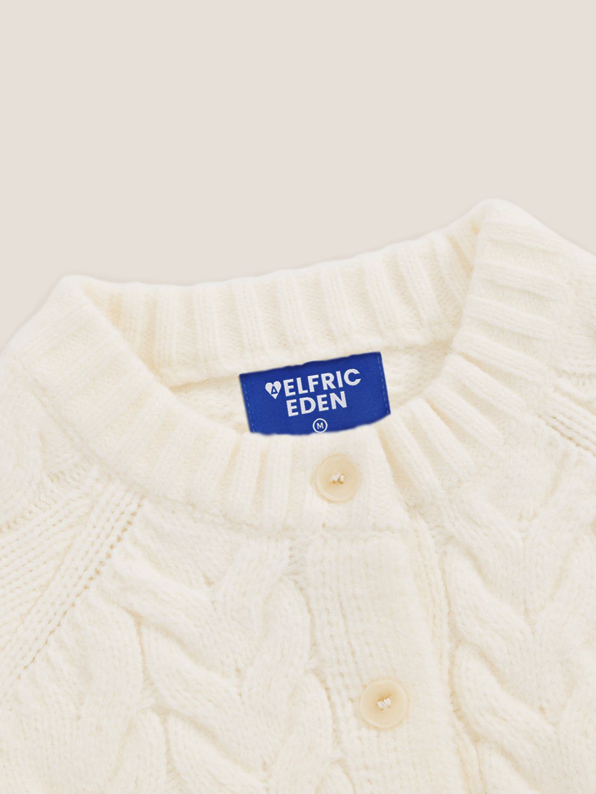 This classic white cable-knit cardigan is crafted from soft. cozy yarn in a relaxed silhouette that layers effortlessly. The standout detail? A bold red heart logo embroidered on the chest and finished with neutral almond-toned buttons for a warm contrastadding a touch of charm and personality. ?