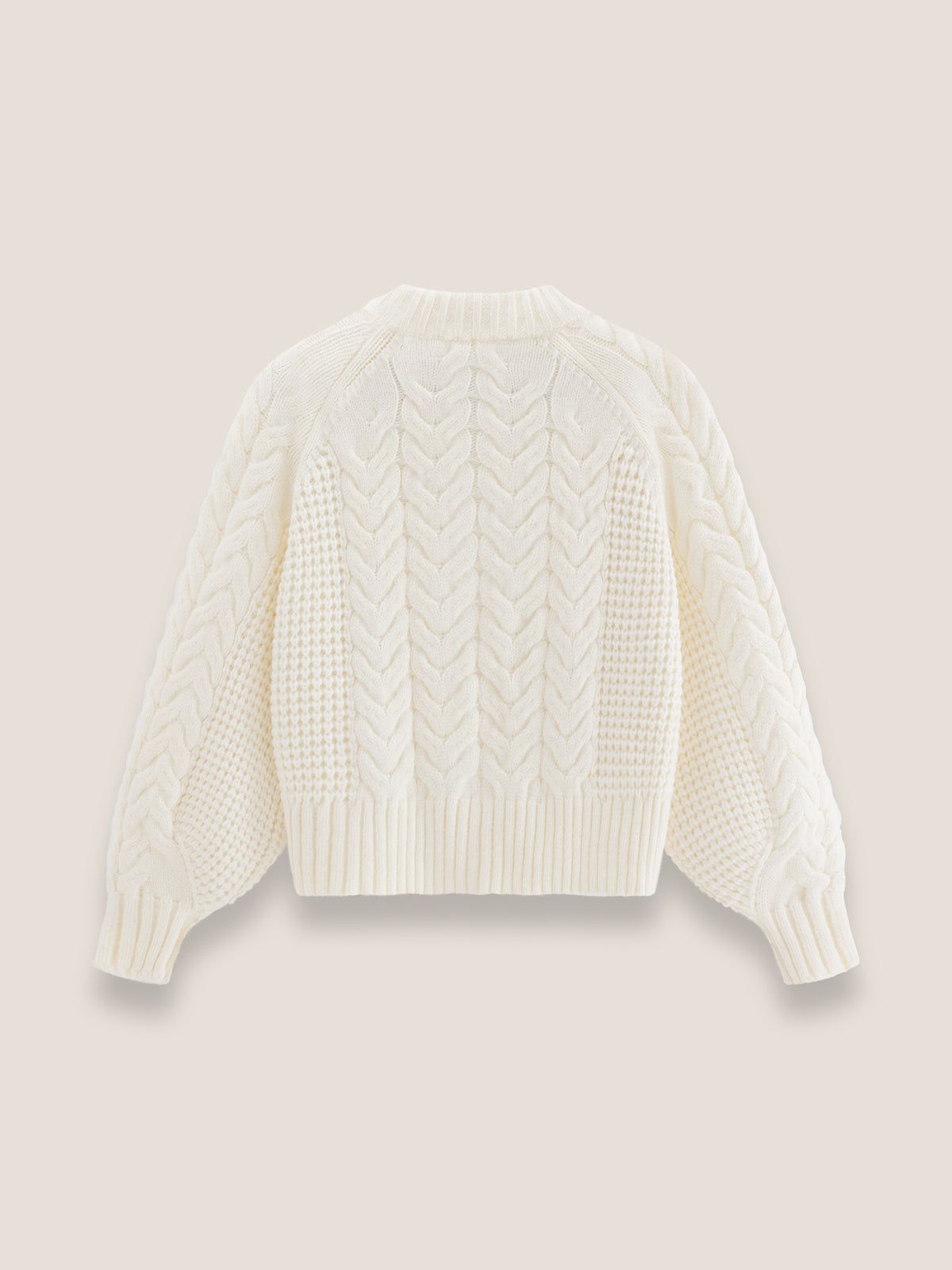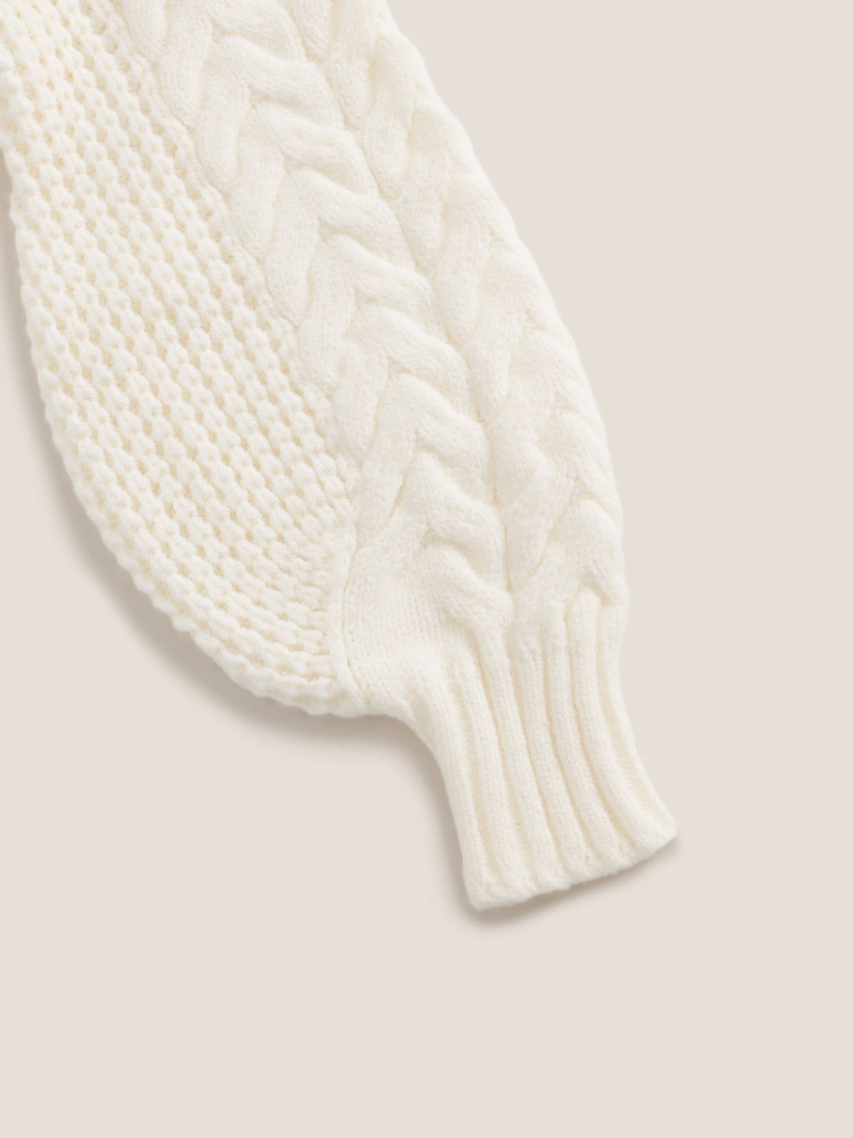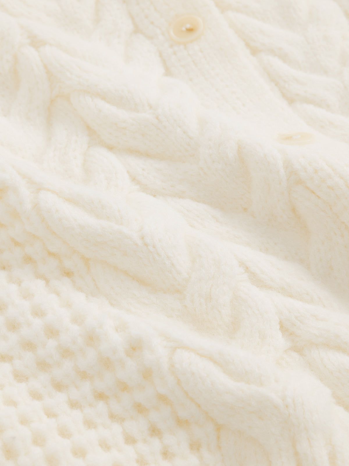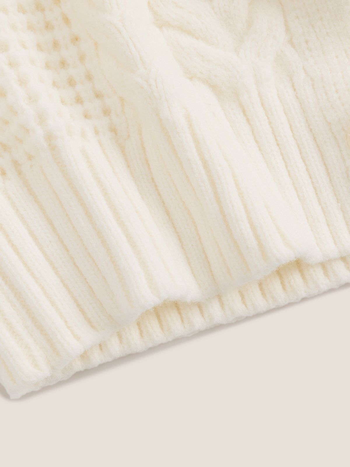 This classic white cable-knit cardigan is crafted from soft. cozy yarn in a relaxed silhouette that layers effortlessly. The standout detail? A bold red heart logo embroidered on the chest and finished with neutral almond-toned buttons for a warm contrastadding a touch of charm and personality. ?