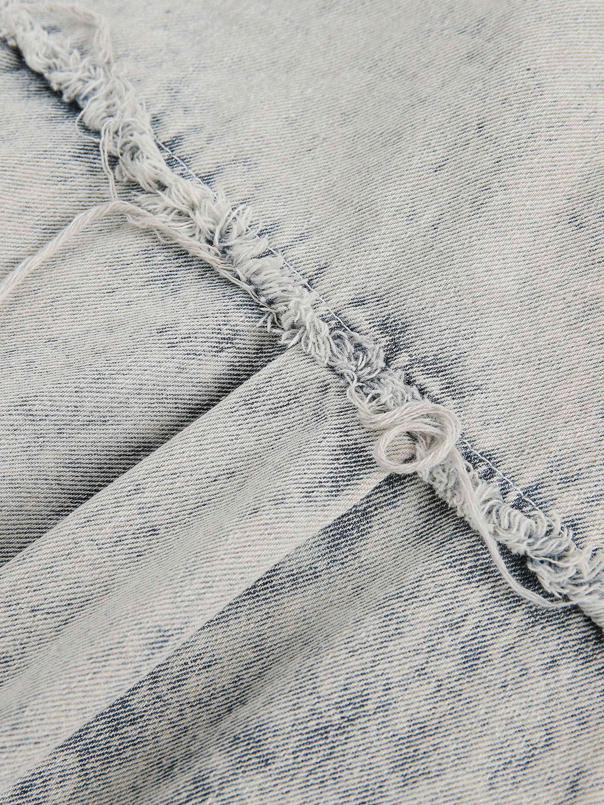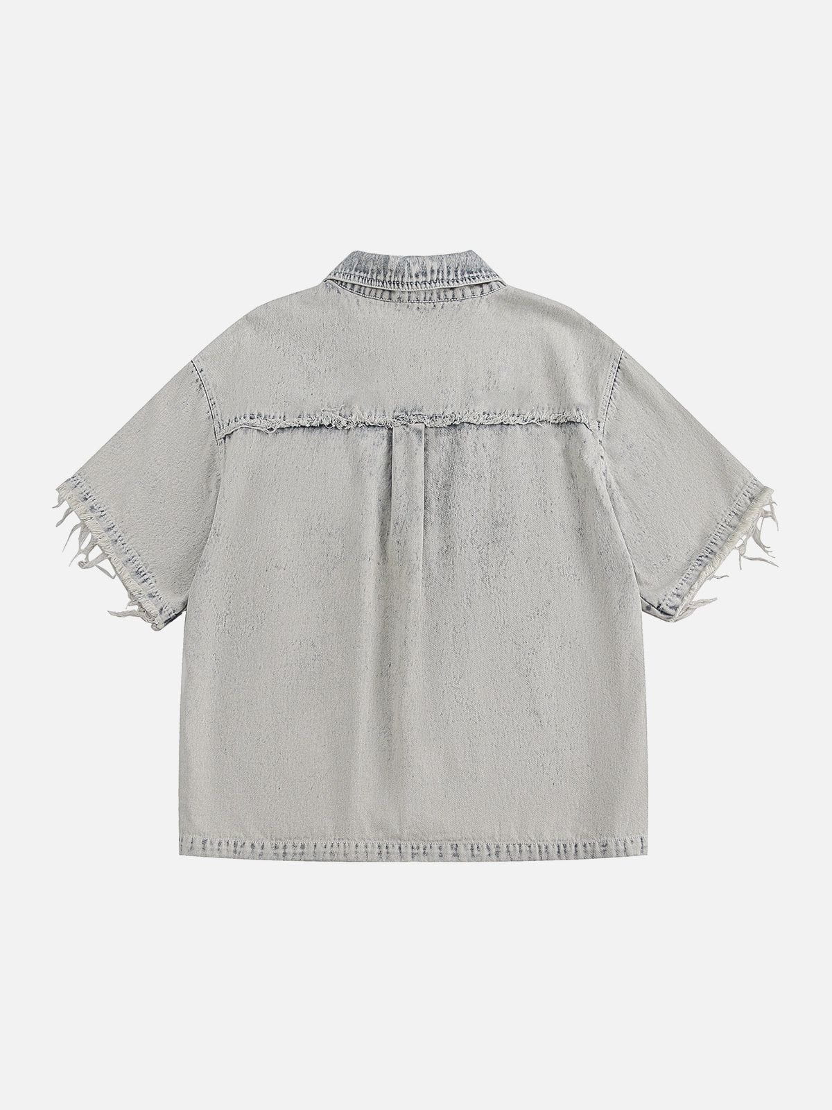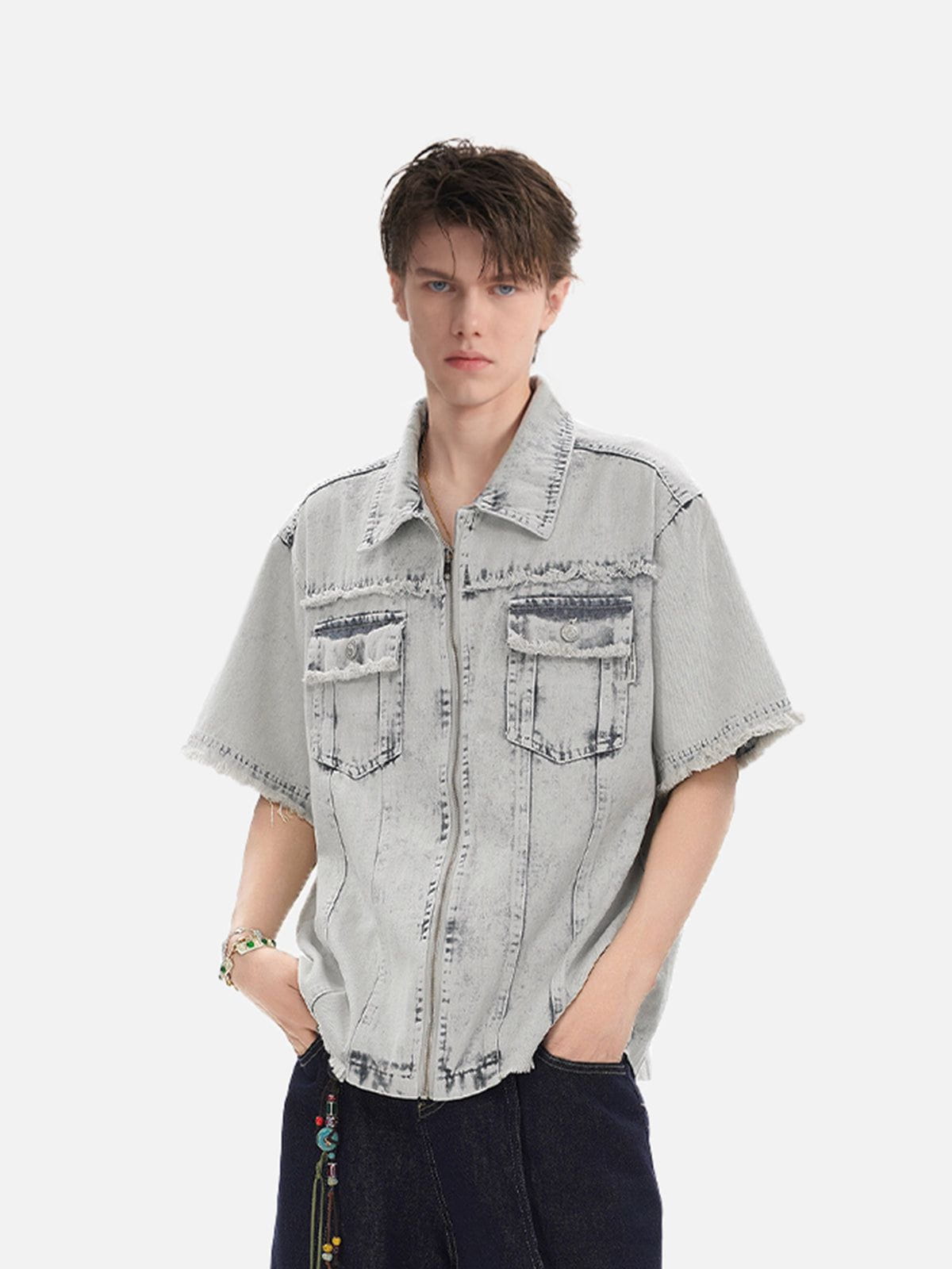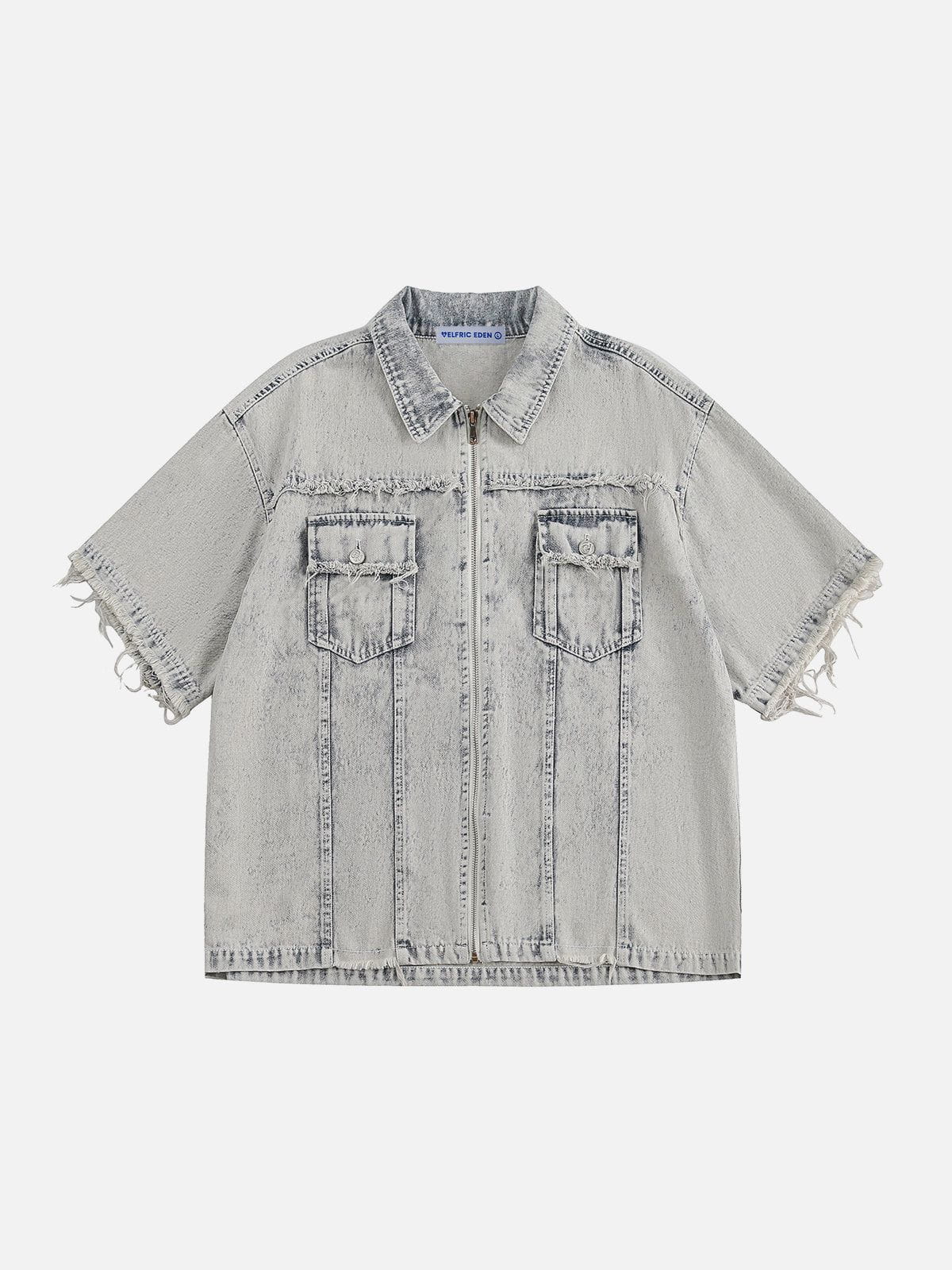 Fringe-trimmed sleeves and a washed-out finish give this denim shirt a worn-in. retro feel. The short sleeve design and zip closure make it a versatile layering piece for casual days with character.