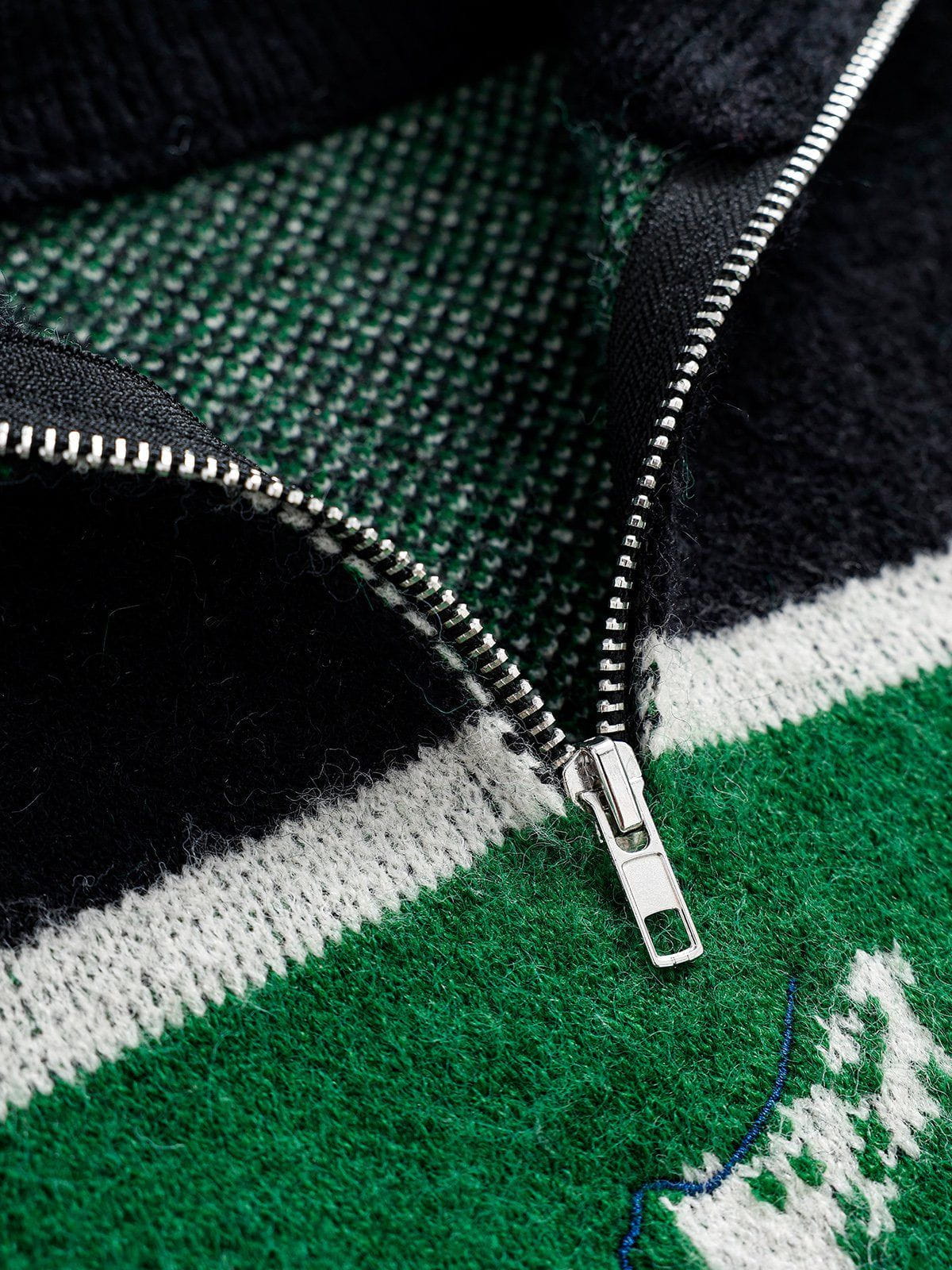 Bold and Unique with our Half Zip Sweater! Featuring a striking black and green color-block design. this sweater brings effortless edge to your look. The jacquard brand pattern on the chest adds a signature touch. making it a perfect fusion of style and individuality. true to Aelfric Eden’s bold spirit.