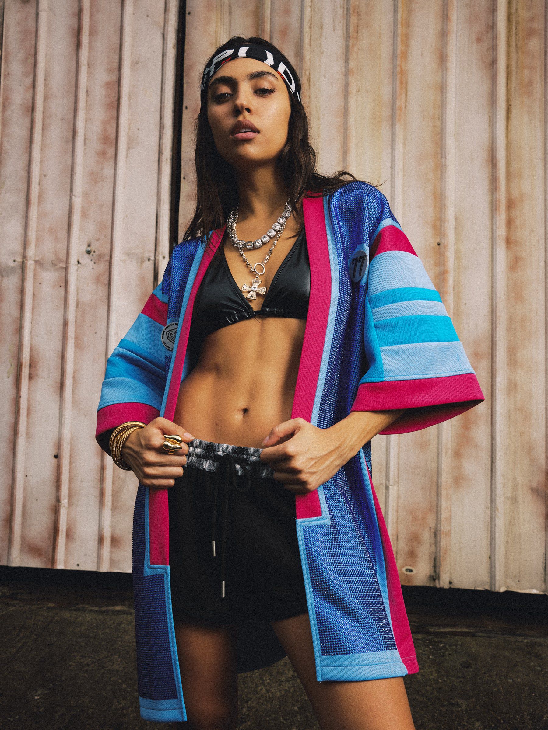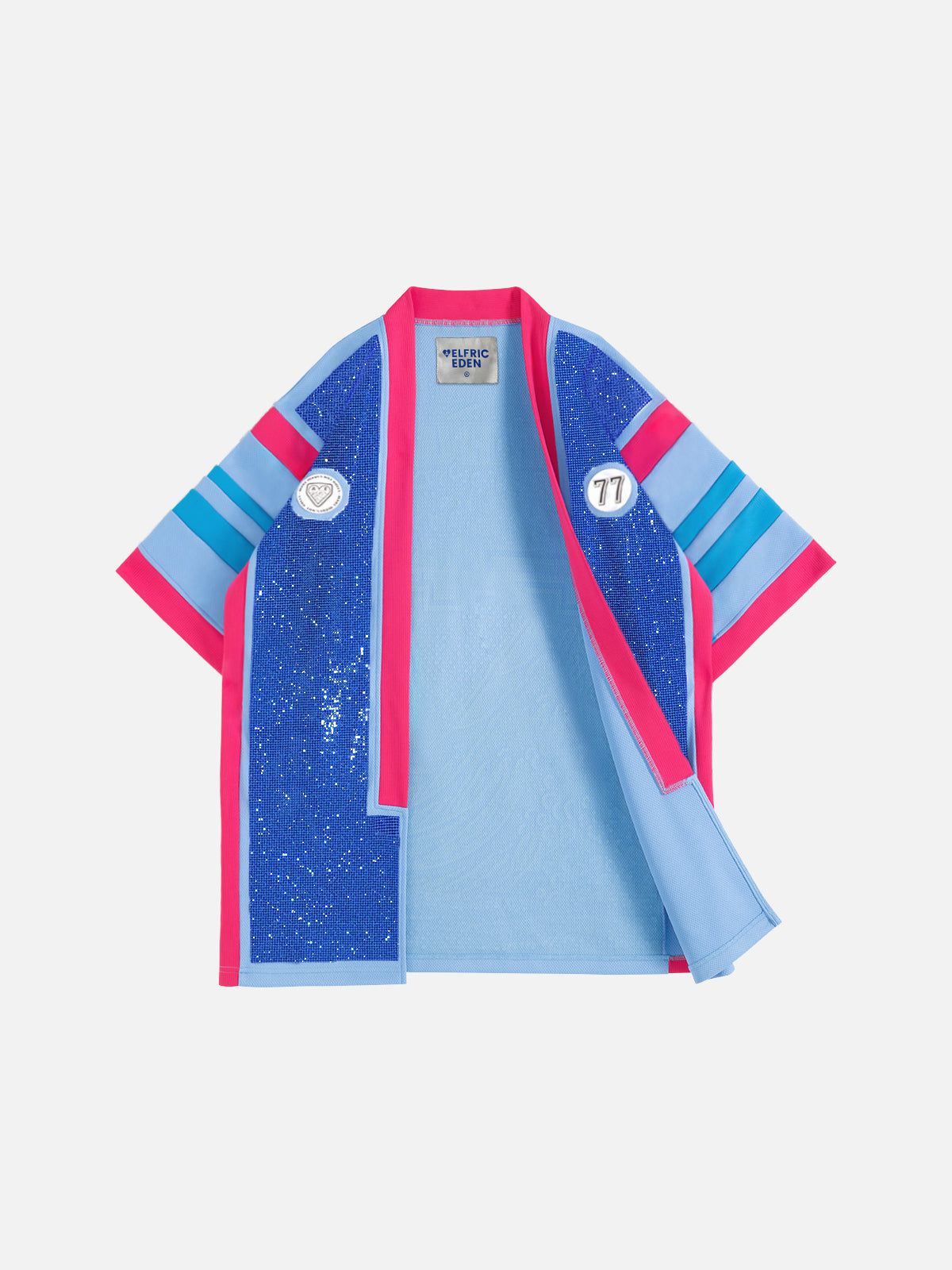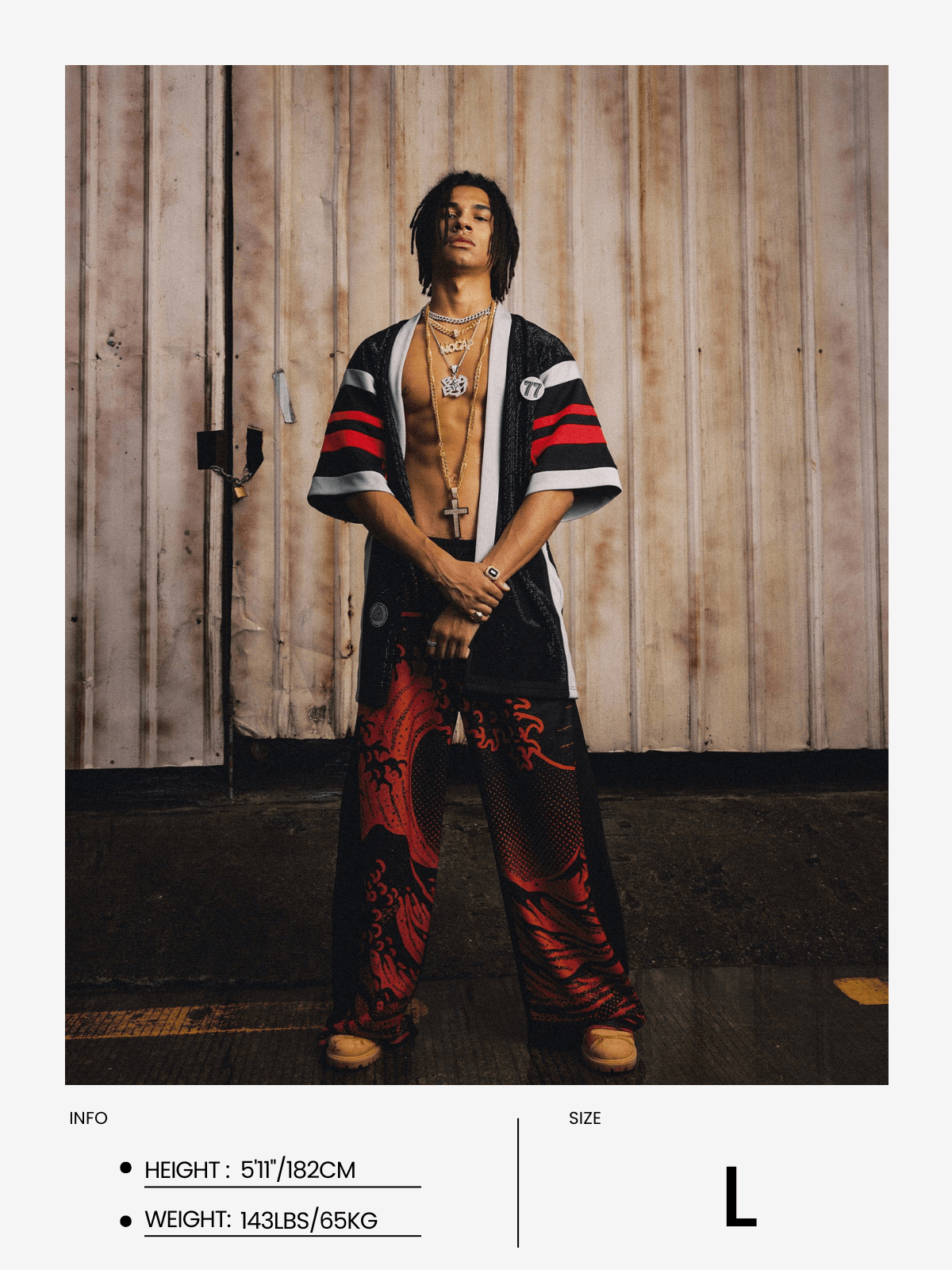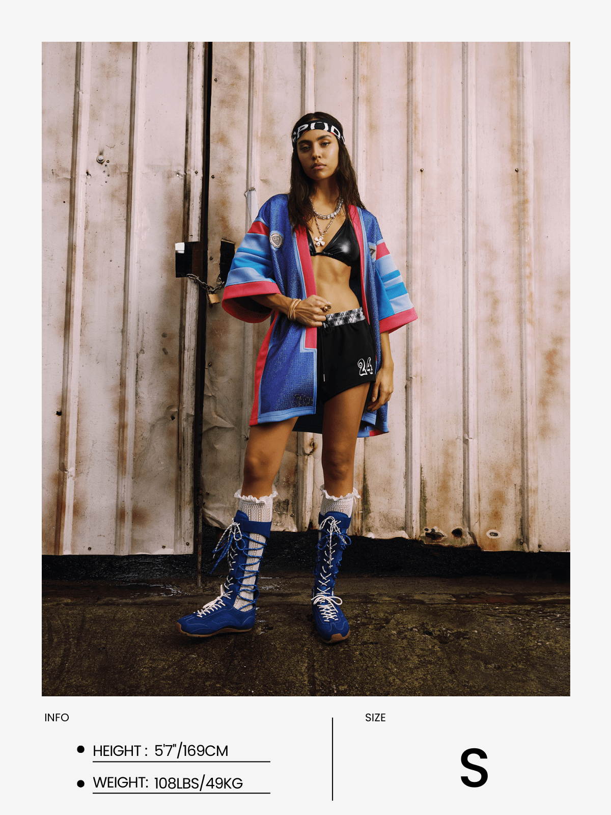 This oversized robe channels the bold. flowing silhouette of a classic kimono. elevated with an all-over Ukiyo-e print a?? vivid. emotional. and unmistakably Japanese. Hand-applied rhinestones in 40256 add dimension and shine. catching the light with every movement. A limited-edition piece that feels more like wearable art than outerwear.
