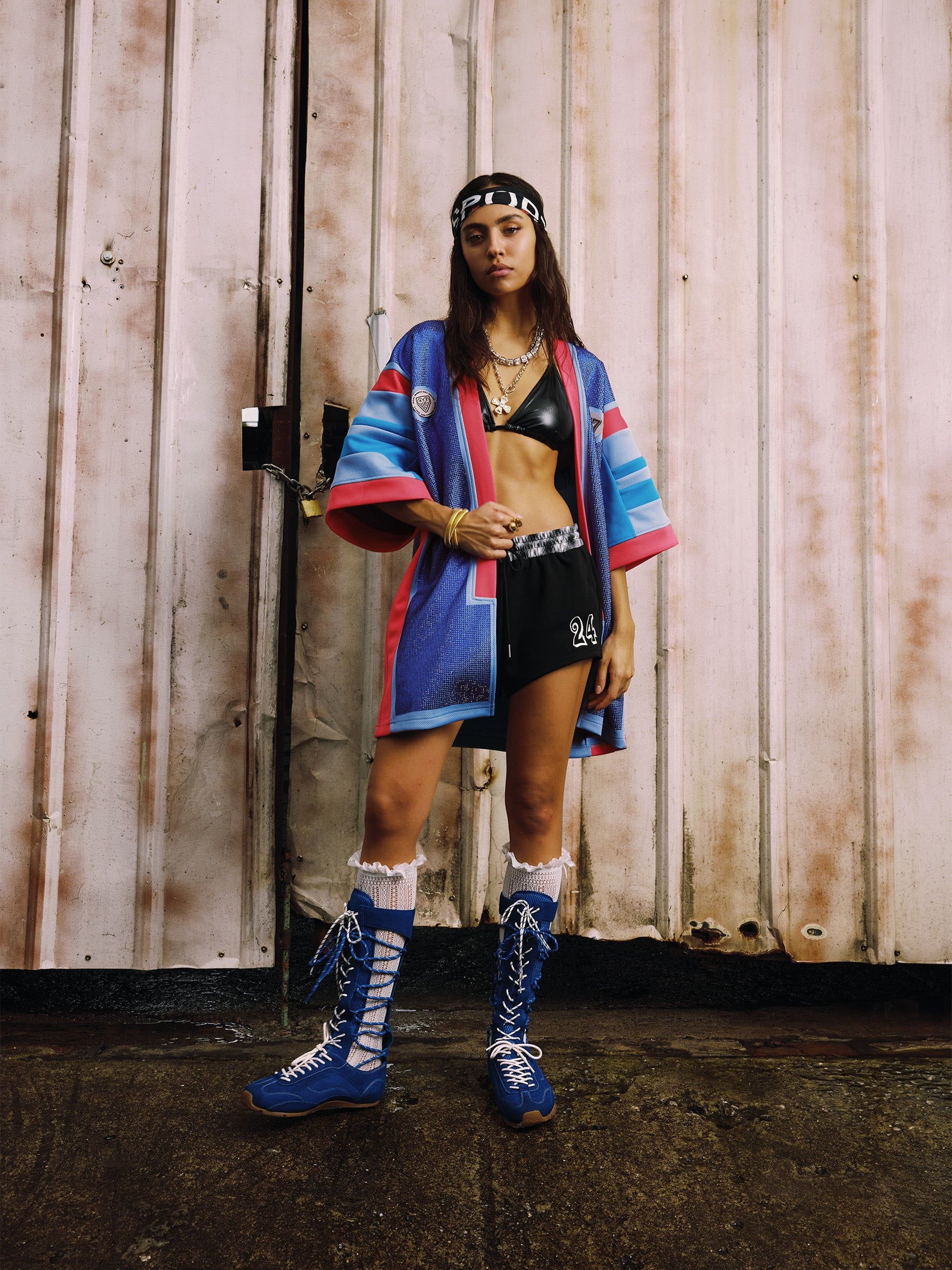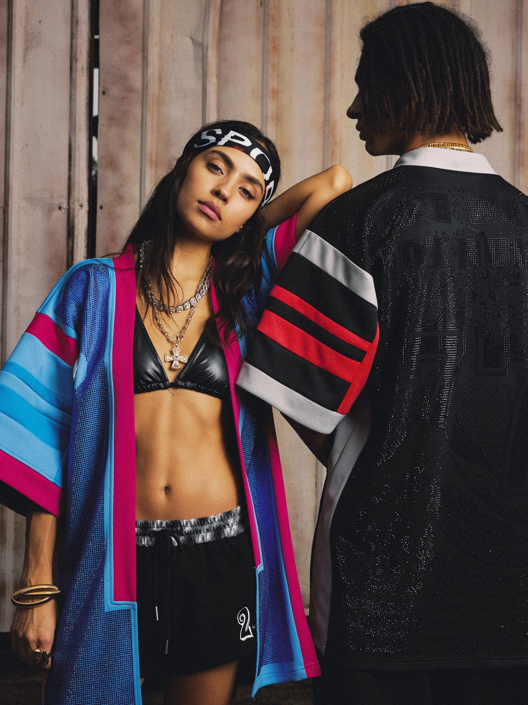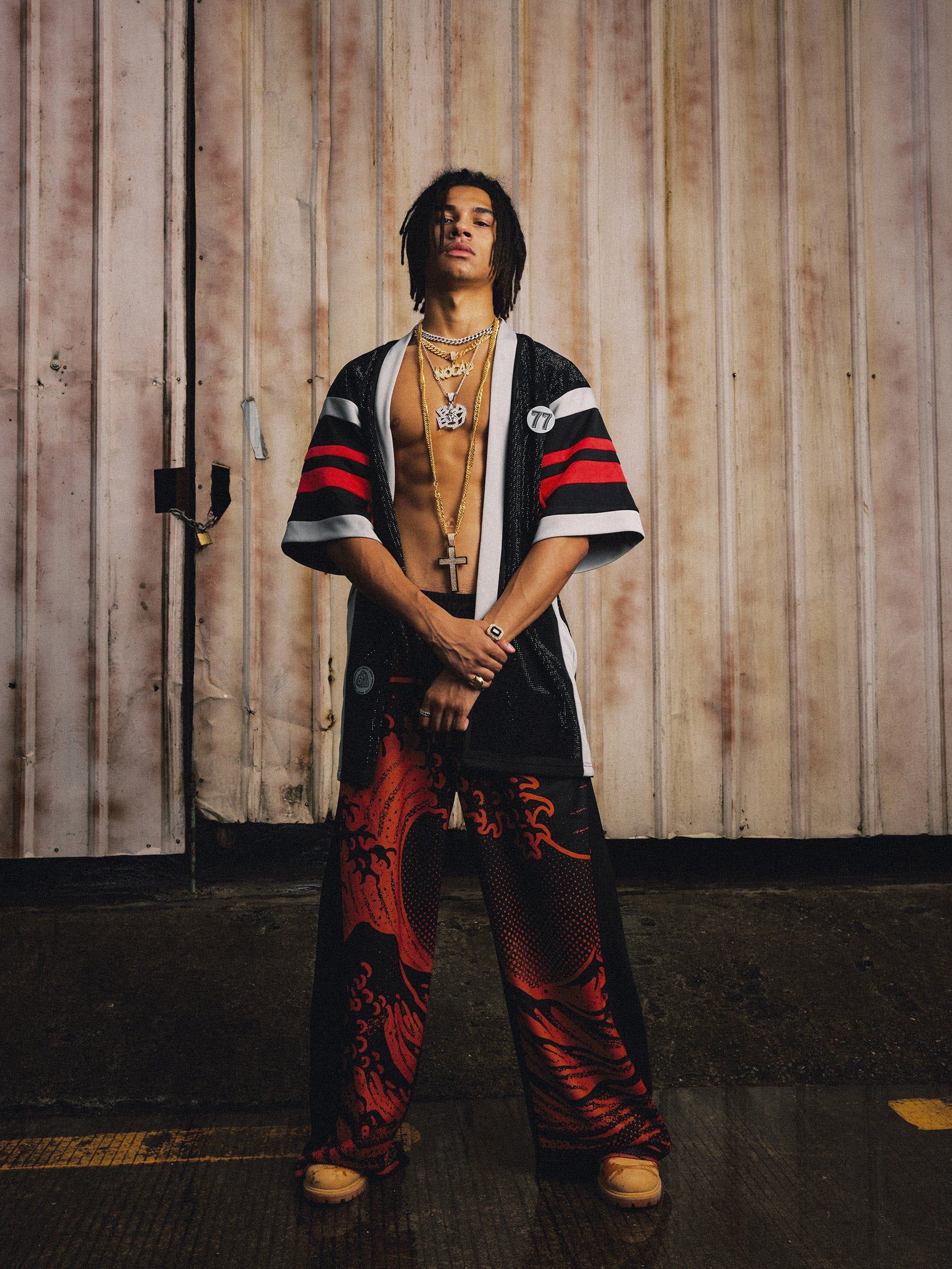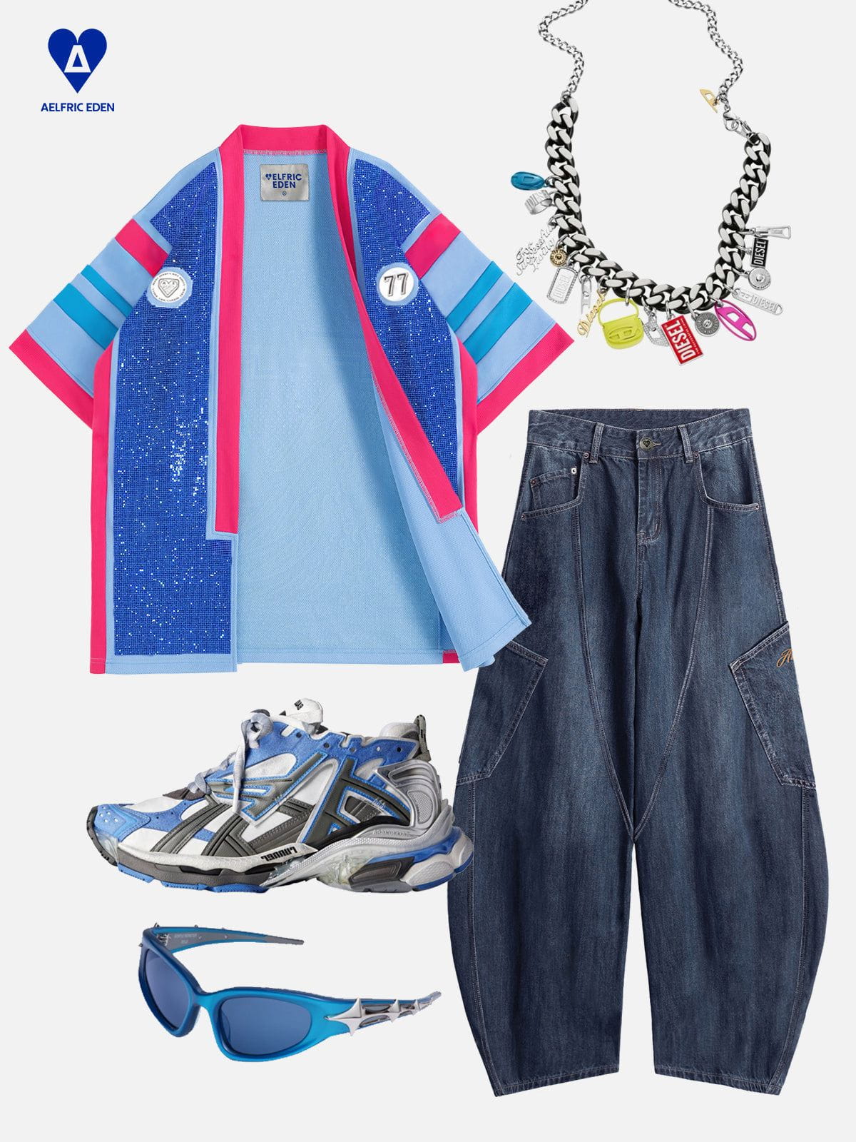This oversized robe channels the bold. flowing silhouette of a classic kimono. elevated with an all-over Ukiyo-e print a?? vivid. emotional. and unmistakably Japanese. Hand-applied rhinestones in 40256 add dimension and shine. catching the light with every movement. A limited-edition piece that feels more like wearable art than outerwear.