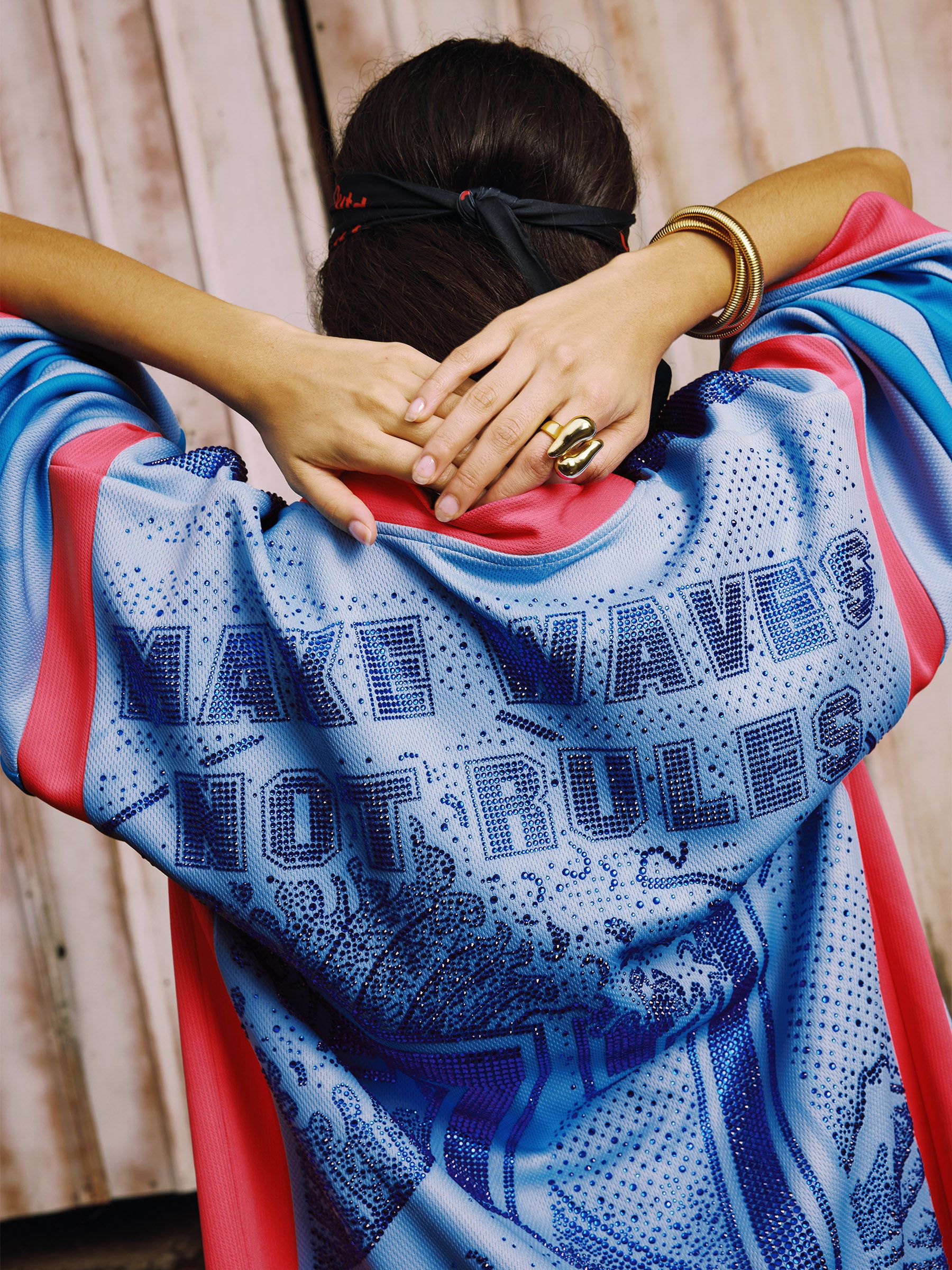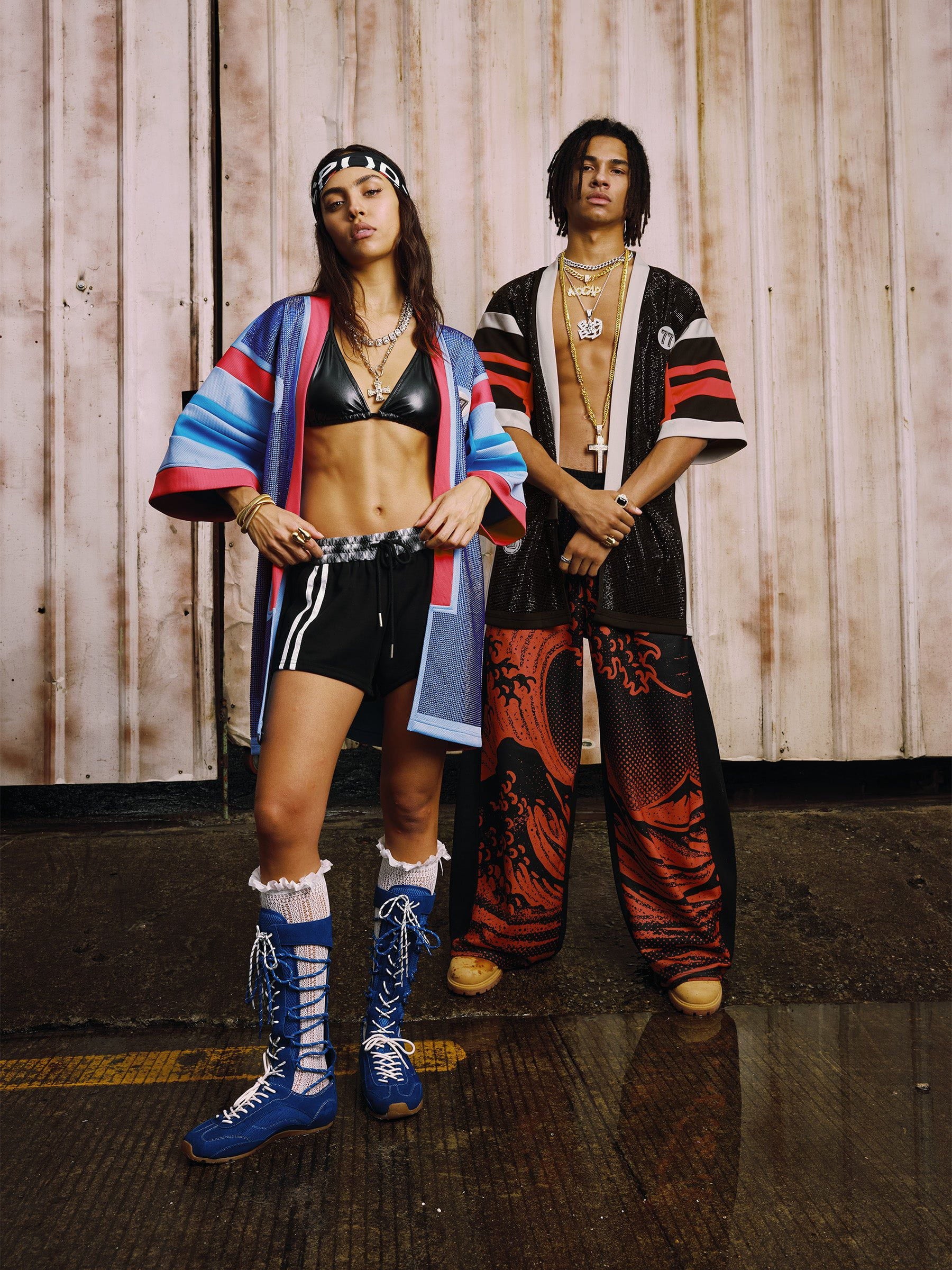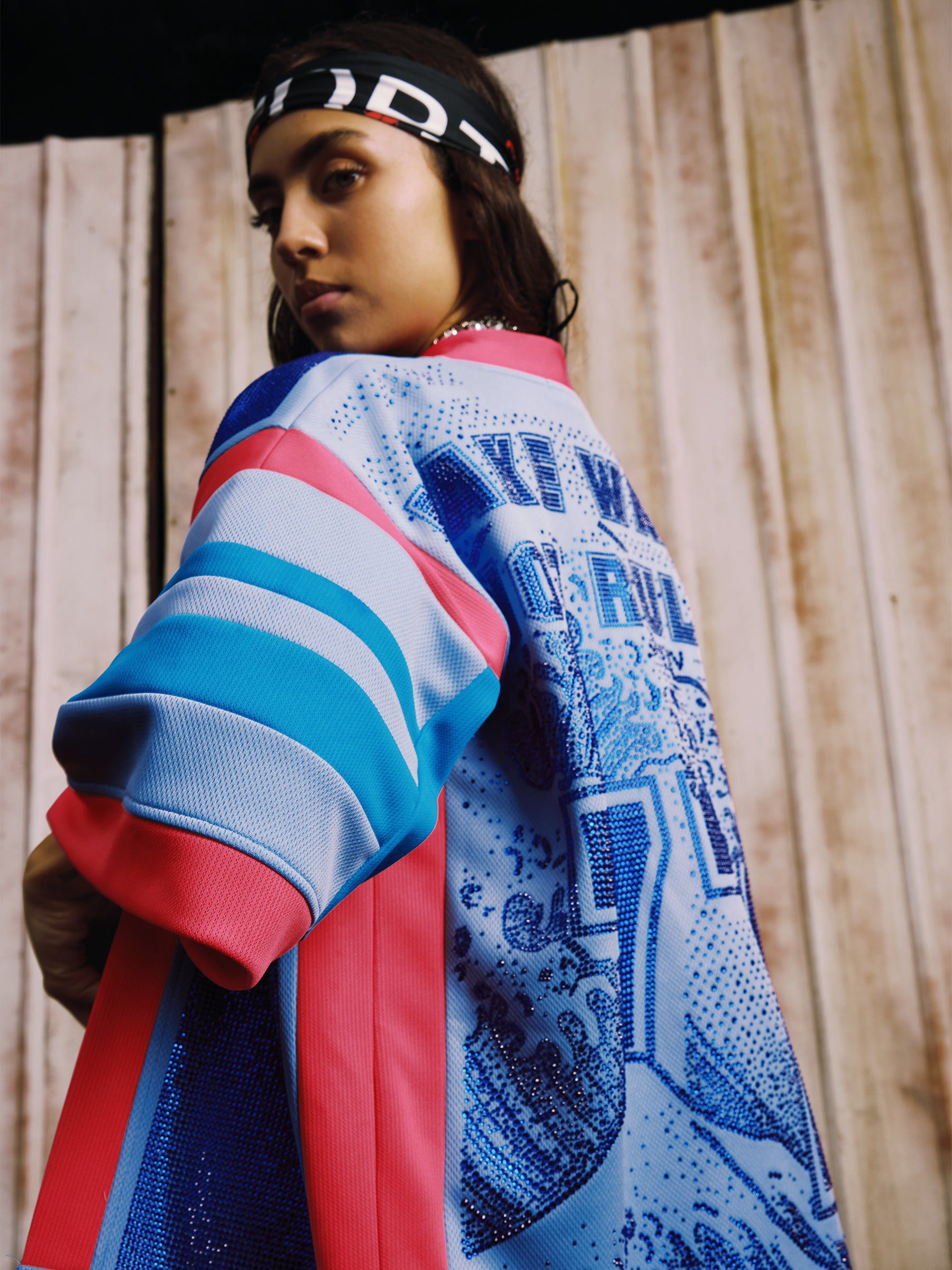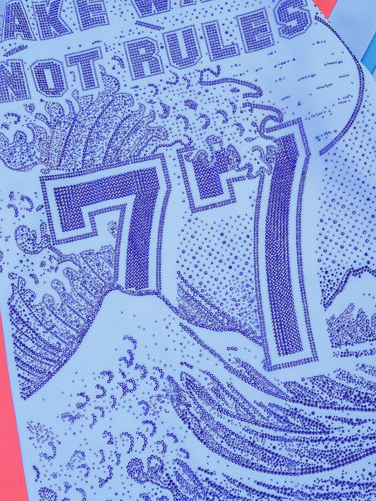 This oversized robe channels the bold. flowing silhouette of a classic kimono. elevated with an all-over Ukiyo-e print a?? vivid. emotional. and unmistakably Japanese. Hand-applied rhinestones in 40256 add dimension and shine. catching the light with every movement. A limited-edition piece that feels more like wearable art than outerwear.