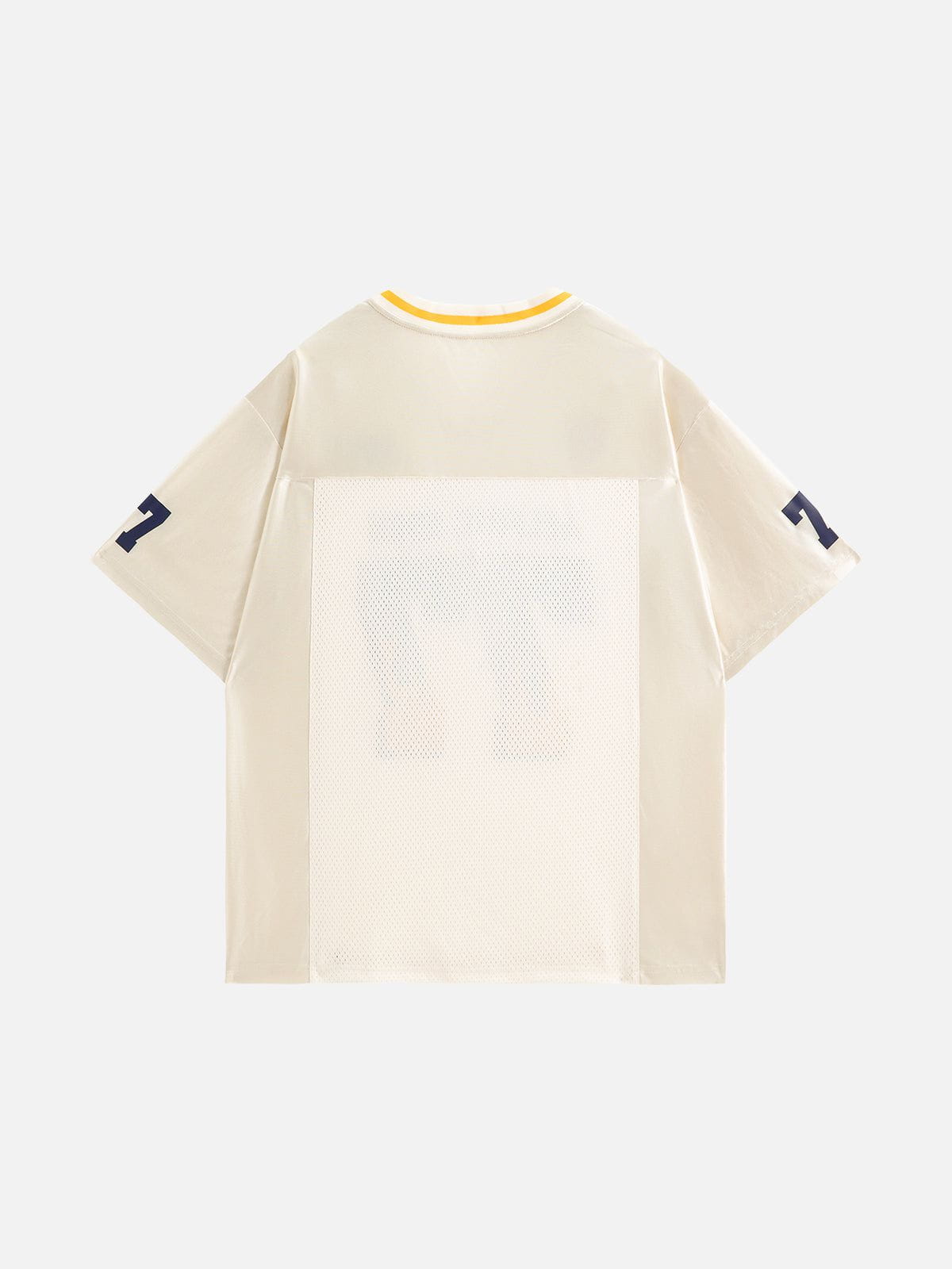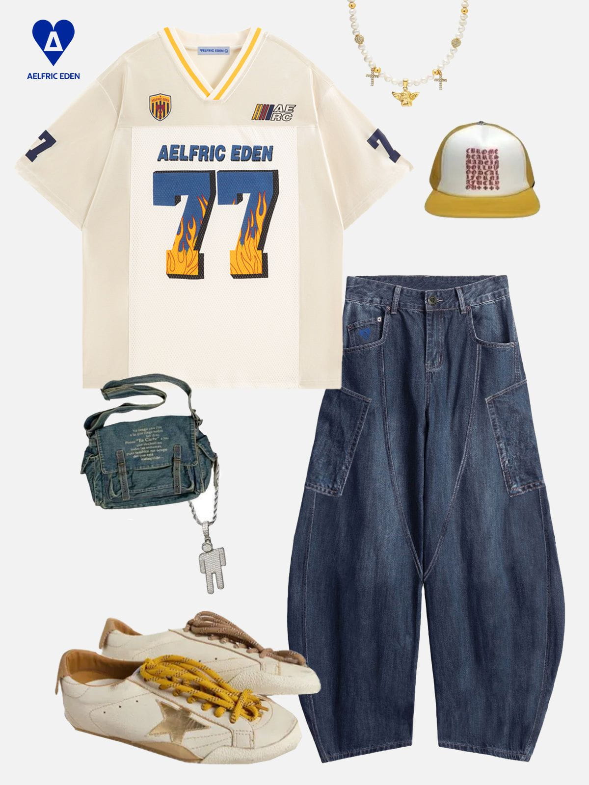 This mesh tee delivers retro sports vibes with a bold twist. Featuring a fiery 77 graphic and vibrant patch details. it blends athletic energy with streetwear attitude. The breathable fabric and oversized fit make it perfect for standout. laid-back styling.