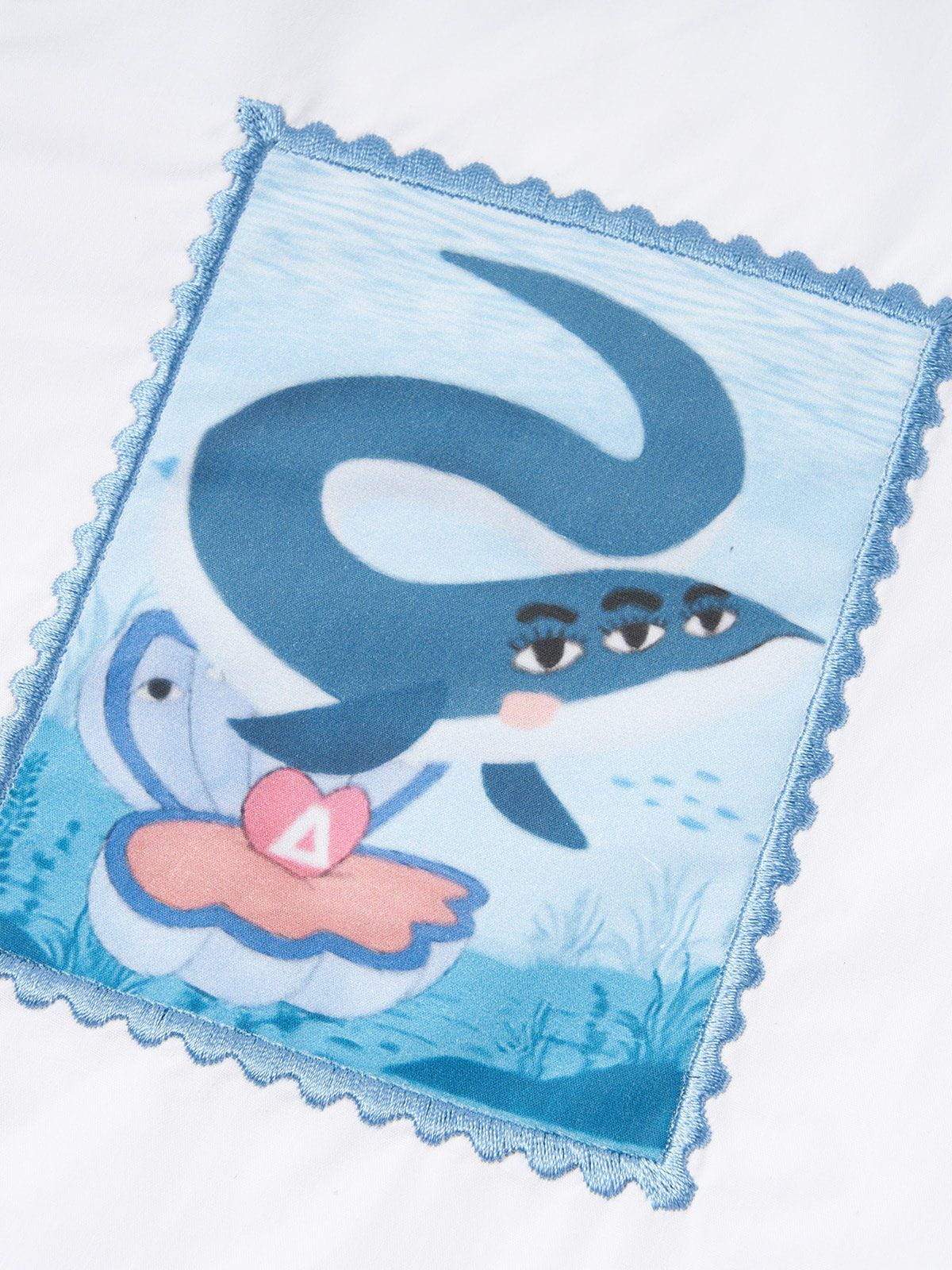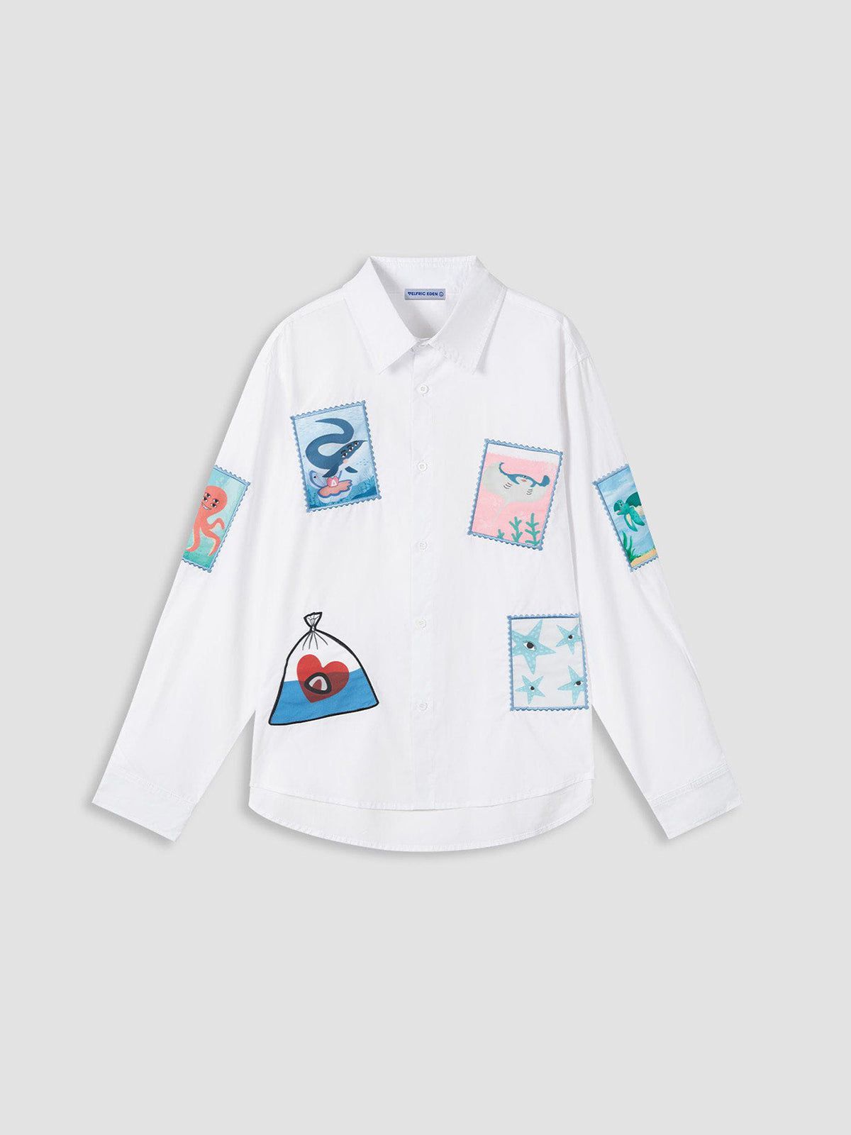 This white polo shirt is like a marvelous piece of art. adorned with abstract cartoon patterns inspired by the Wonderland theme. Octopuses. starfish. and other mysterious creatures dance across every inch of the fabric. creating a garment filled with imaginative and enchanting fantasy vibes.