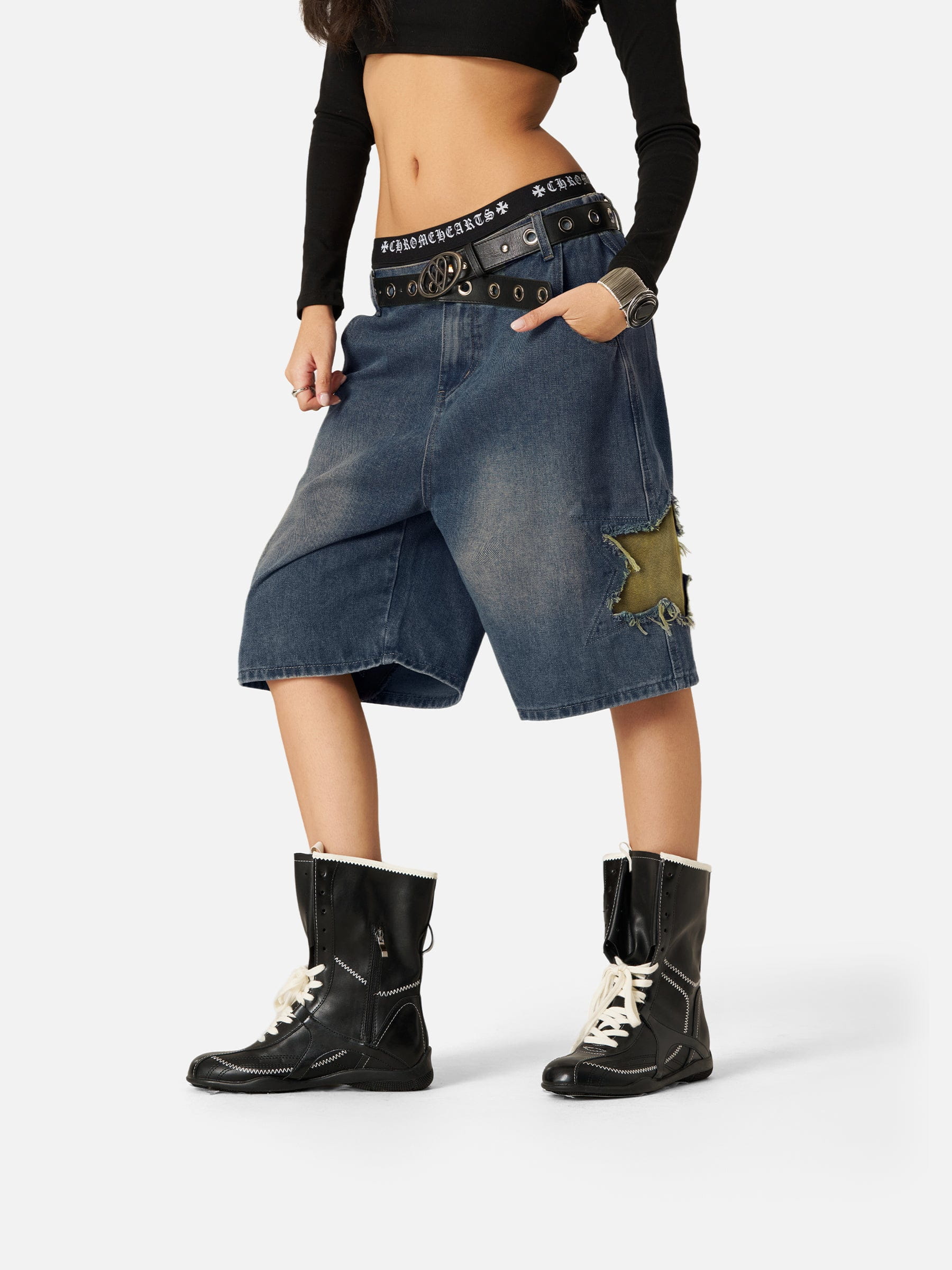 Featuring a constellation of stars stitched onto distressed denim. Not just denim. This is patched rebellion. with raw-edged stars that channel vintage DIY spirit and street-born confidence.