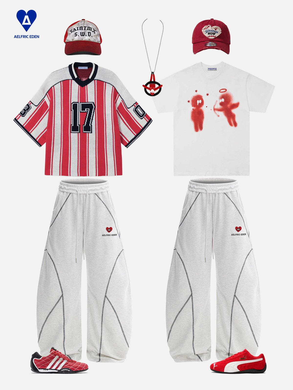 These baaggy sweatpants feature an inside-out exposed seam design. turning basic loungewear into a statement piece. Crafted from soft heather grey cotton fabric. the exaggerated curved seam lines create dynamic structure and movement. A small red heartie logo adds a pop of contrast and brand identity.