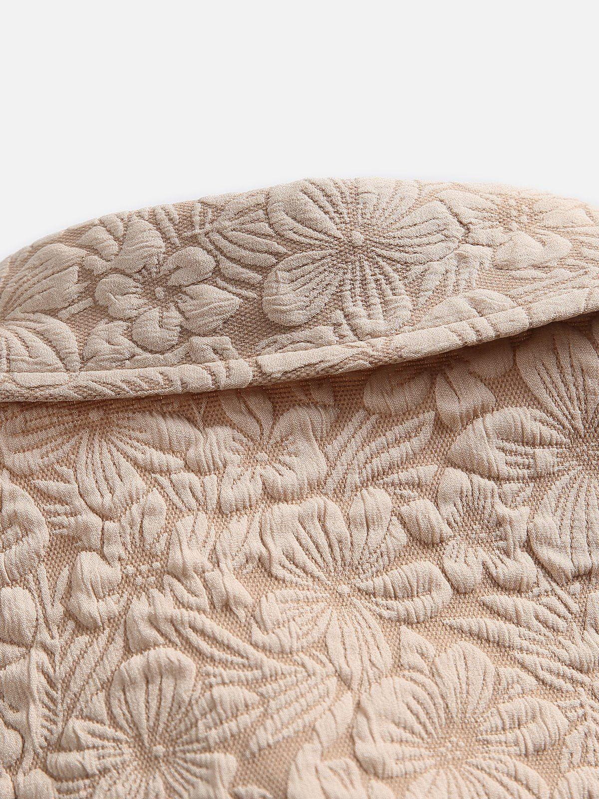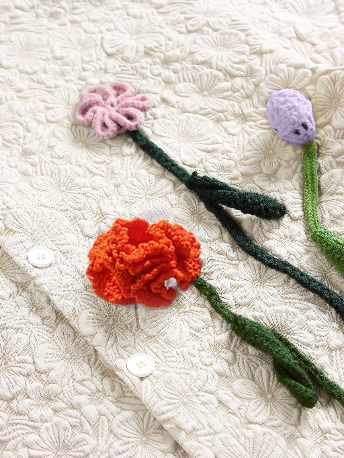 The shirt showcases intricate design elements. Its fabric boasts a subtle floral patterned texture. adding depth and dimension to the overall look. Additionally. the handcrafted woven floral bouquet design on one side of the shirt adds a touch of sophistication and refinement. This clever design not only demonstrates the designer’s attention to detail but also imbues the shirt with a sense of luxury and elegance.
