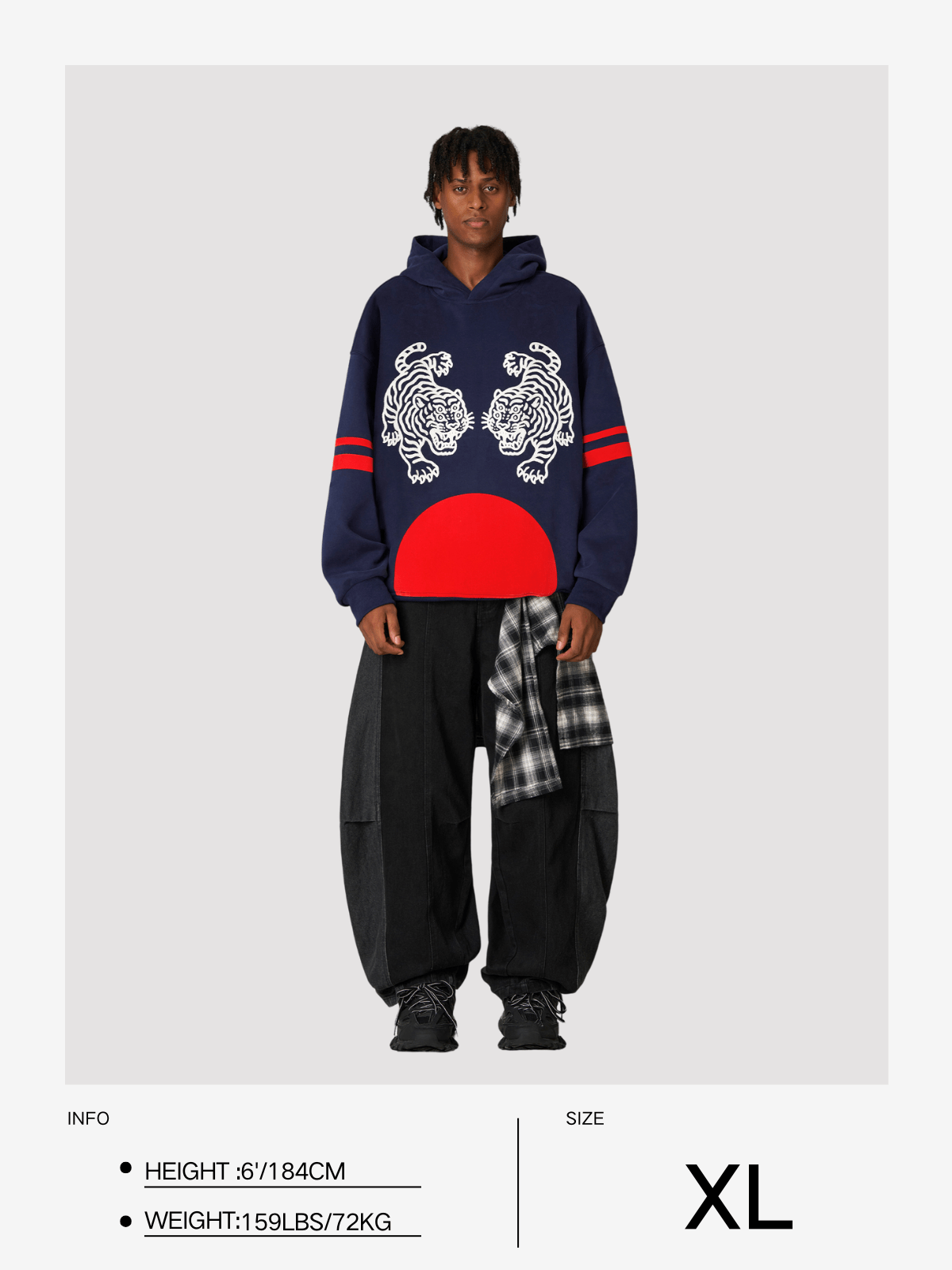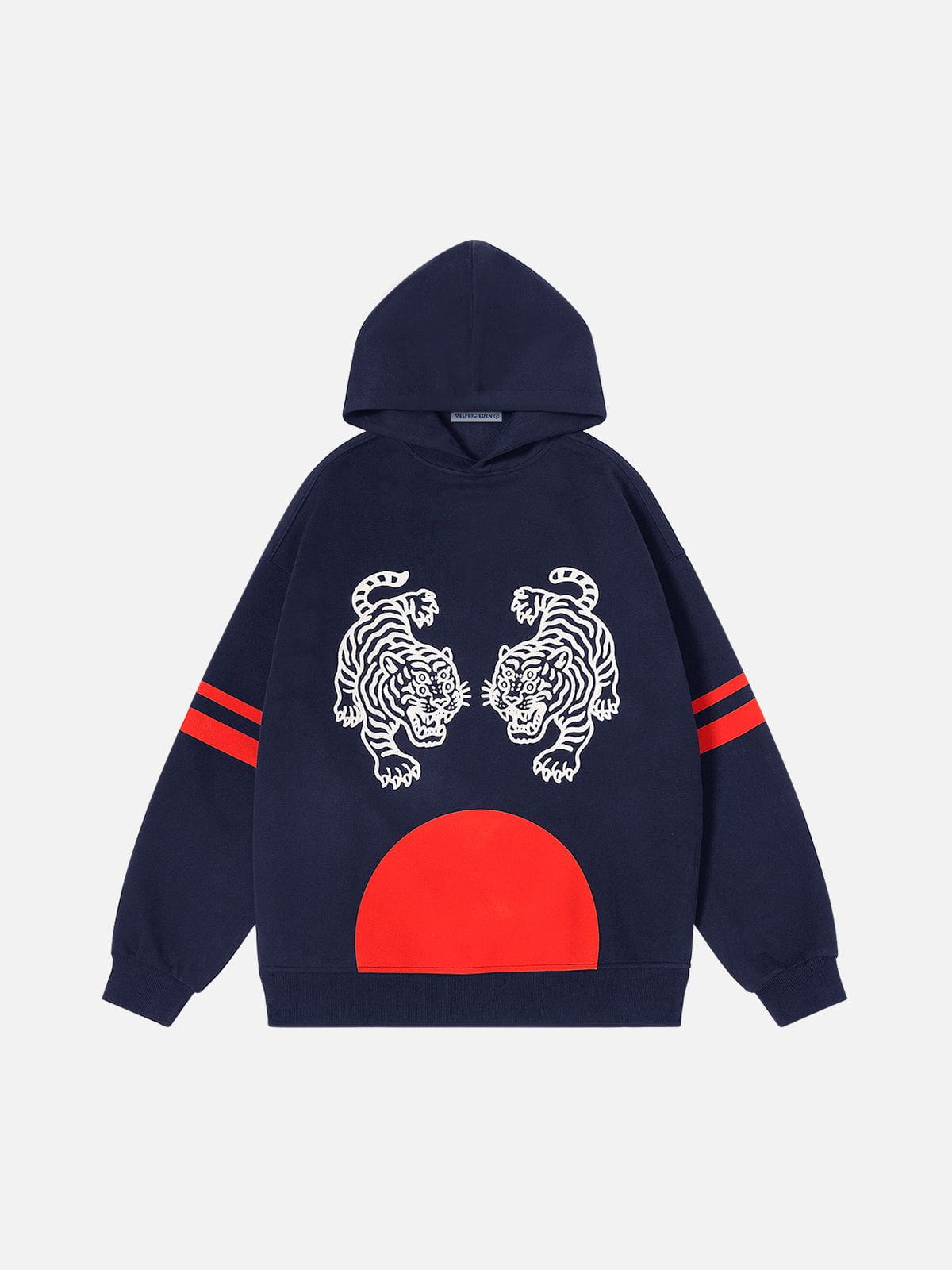 Roar with style in our bold tiger-print hoodie. Rule the urban jungle like the fearless kinga??MAKE WAVES NOT RULES. Defy norms in striking red/navy or red/apricot. Unleash your rebel spirit. one fierce step at a time.
