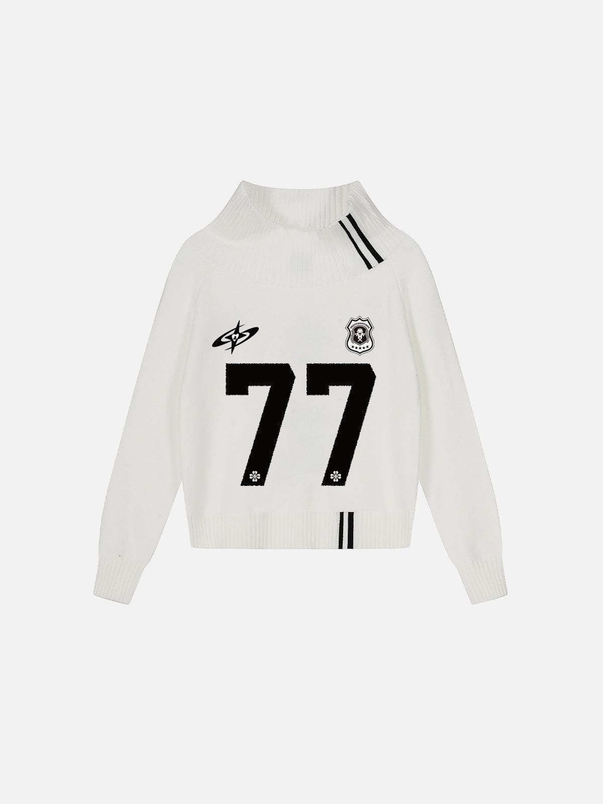 The 77 One Shoulder Sweater features bold graphic detailing and an asymmetric one-shoulder design. blending modern street aesthetics with effortless individuality.