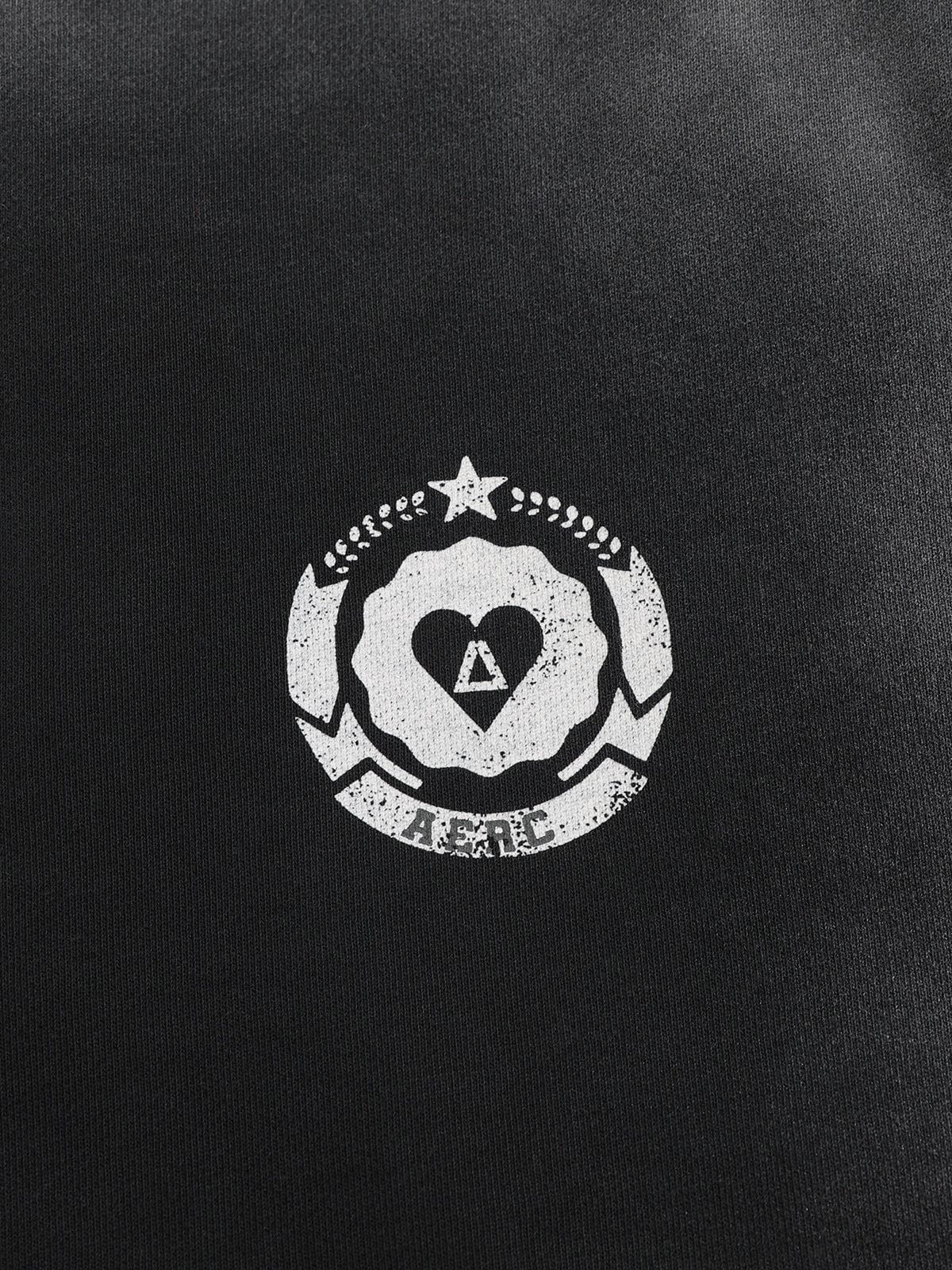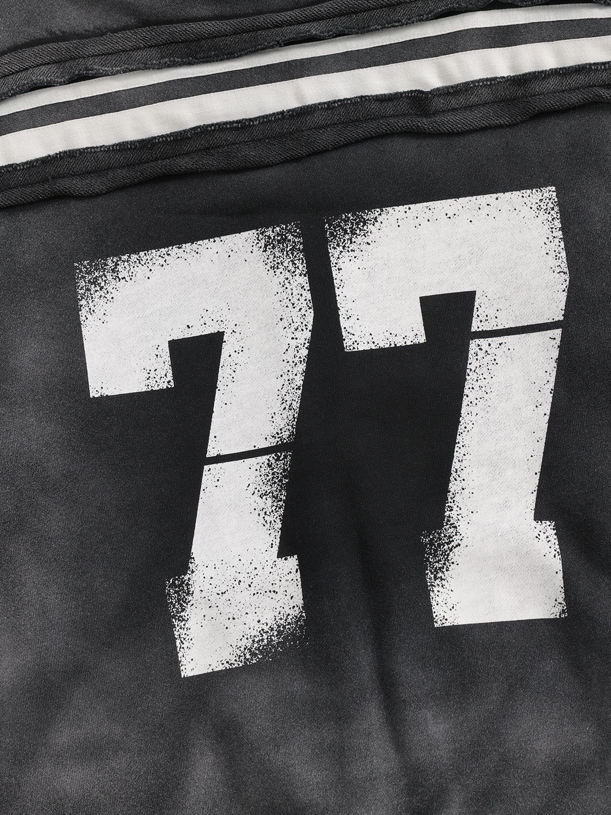 Crafted in a bold black acid-wash finish. this statement zip-up features dual zipper closure. varsity-style badge logos. and contrasting athletic stripes down both sleeves. The oversized fit and structured hood bring a retro-sport meets street-ready aesthetic.