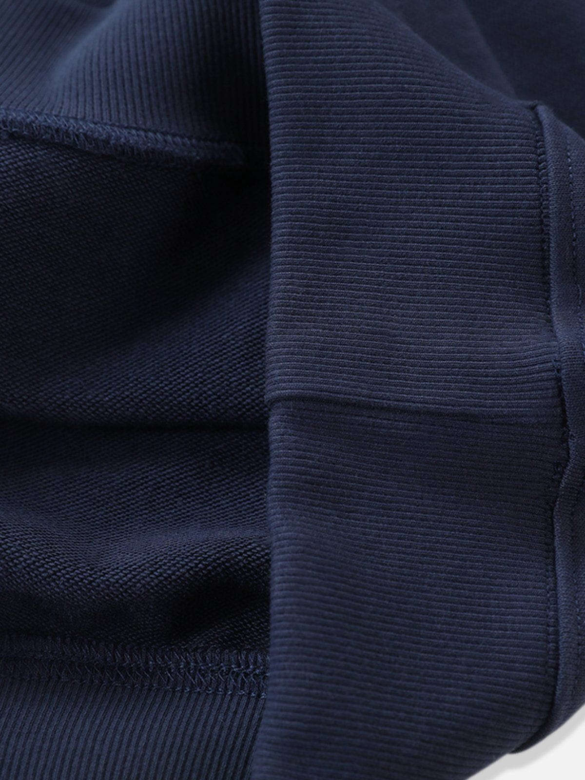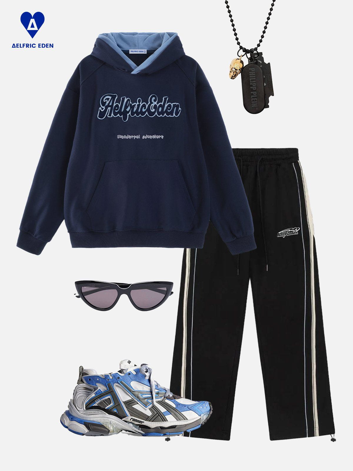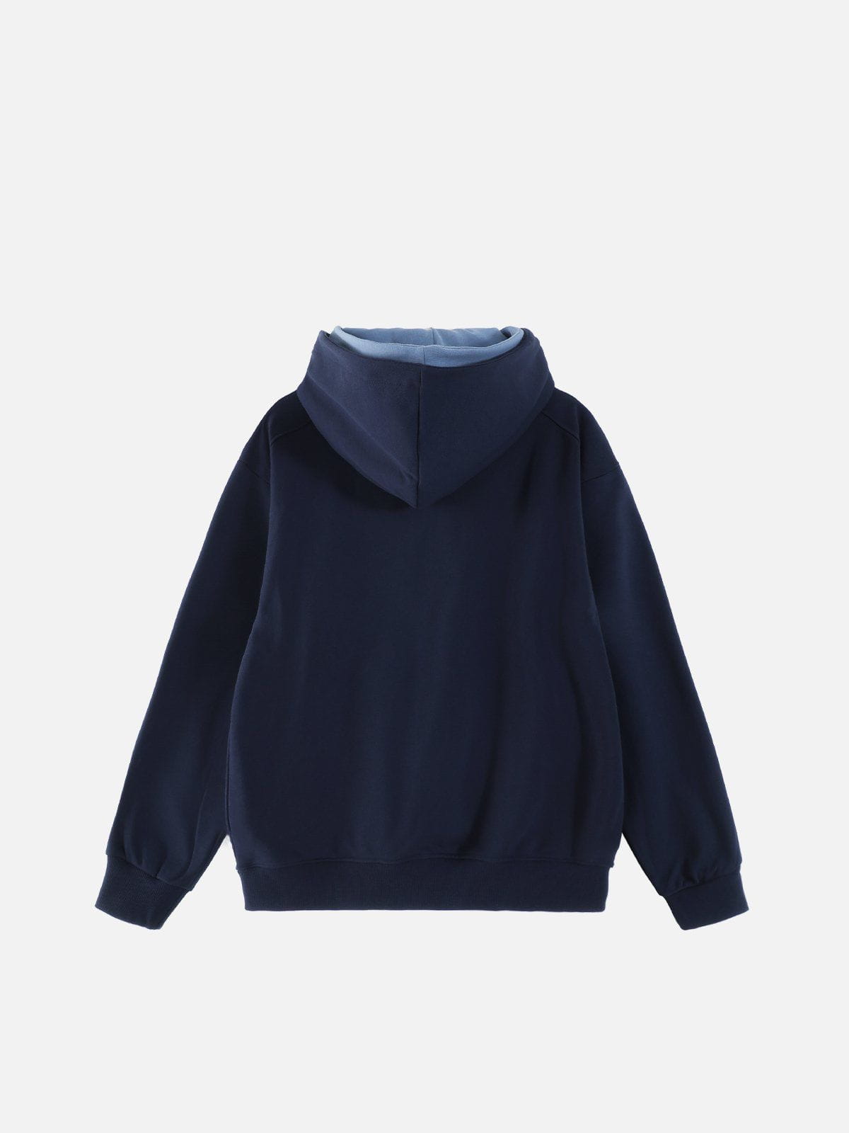 Featuring a unique double-hood design in contrasting deep blue and light blue. At the center. the hoodie showcases a brand logo patch. adding texture and style.