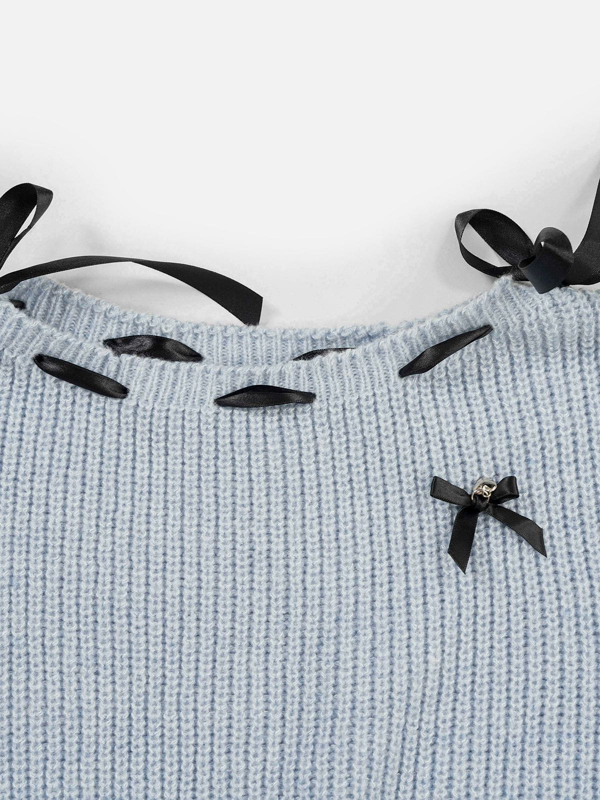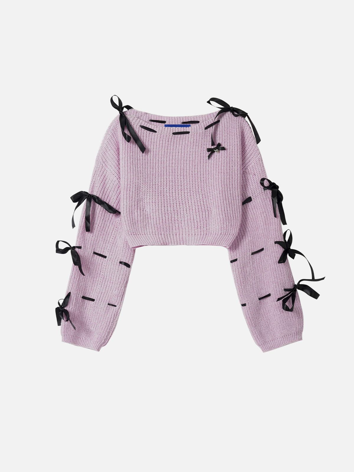 Bow Cropped Sweater features delicate ribbon bow details that add a soft. feminine touch to its modern cropped silhouette. blending playful charm with effortless style.