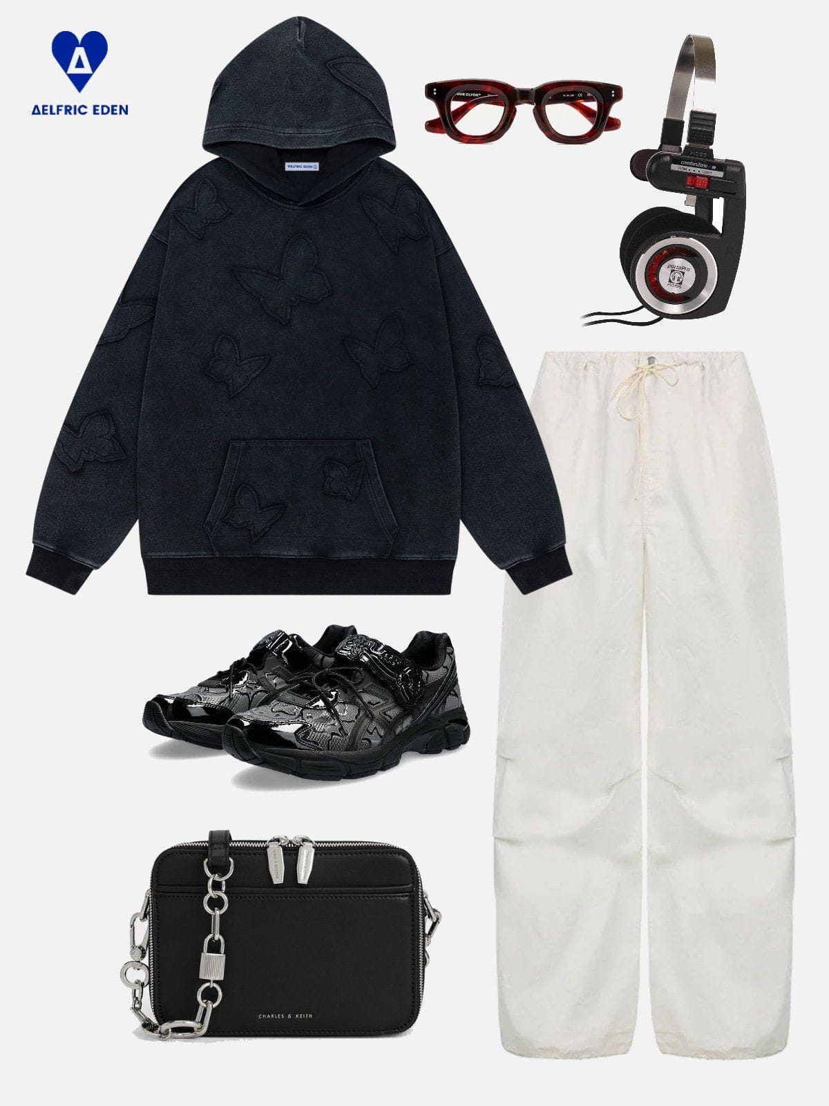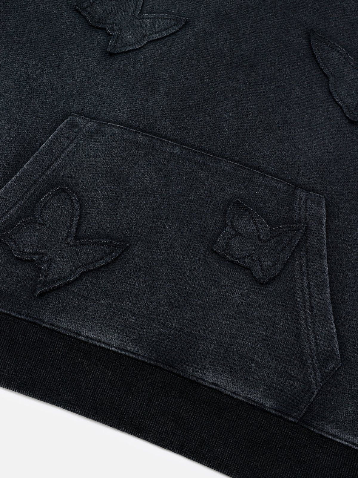 Effortlessly stylish and comfortable. the Aelfric Eden Butterfly Graphic Washed Pullover Hoodie is a black hoodie that features a unique butterfly patch. Made with a washed fabric. this hoodie is perfect for casual wear and adds a touch of charm to any outfit.
