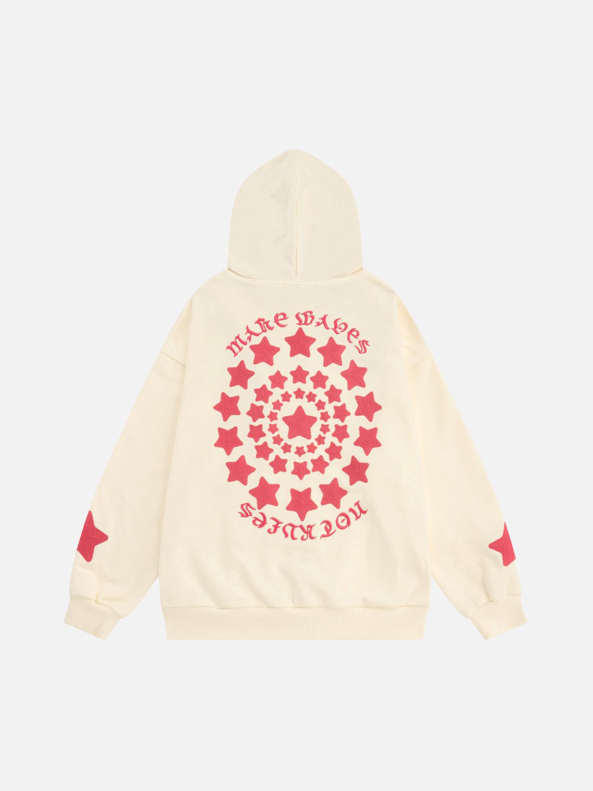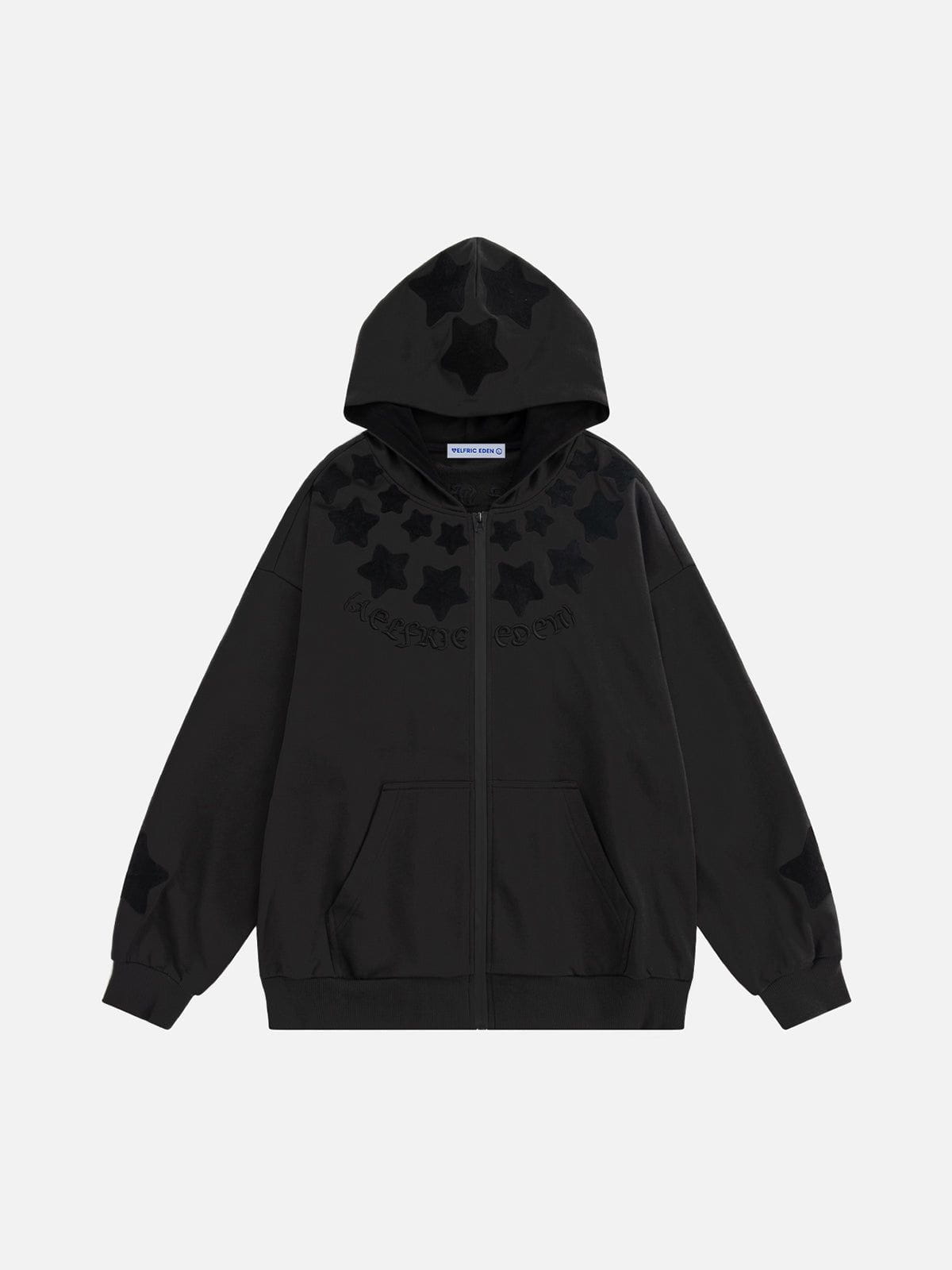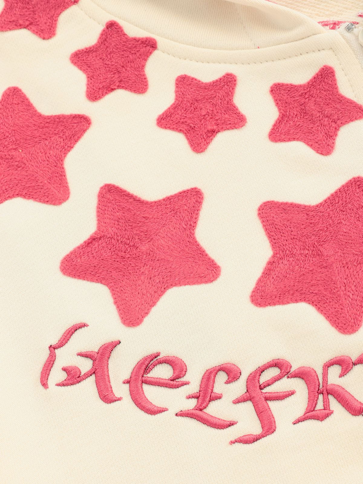 Crafted from soft. cozy fabric. it features bold star designs on both the front and back. making it a statement piece that turns heads coming and going. The relaxed fit delivers all-day comfort. while the versatile design pairs effortlessly with jeans. cargos. or skirts.