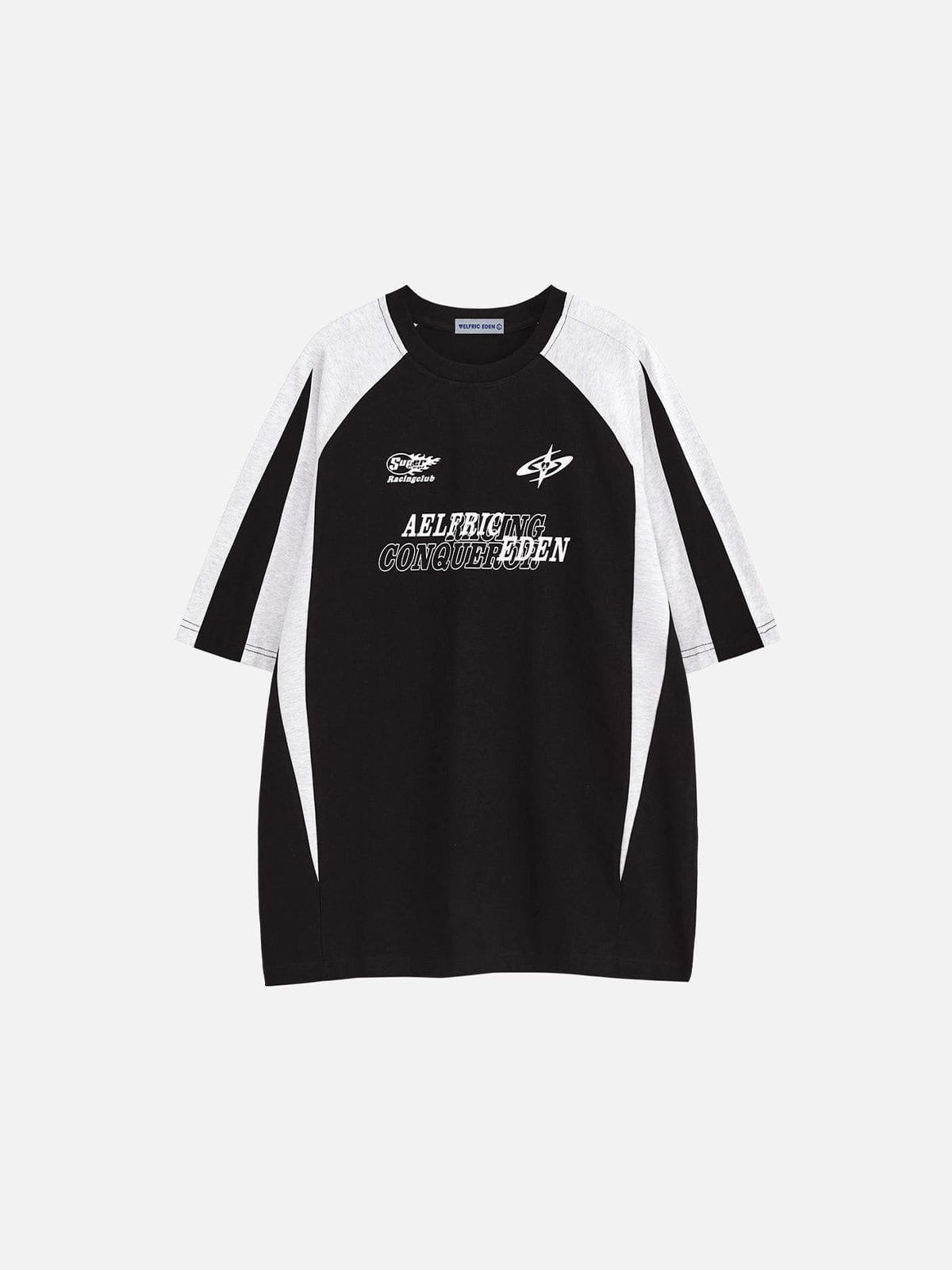 The Aelfric Eden Color Blocking Racing Print Tee exudes dynamic energy with its vibrant colors and abstract racing-inspired design. making it a bold statement piece for confident individuals.