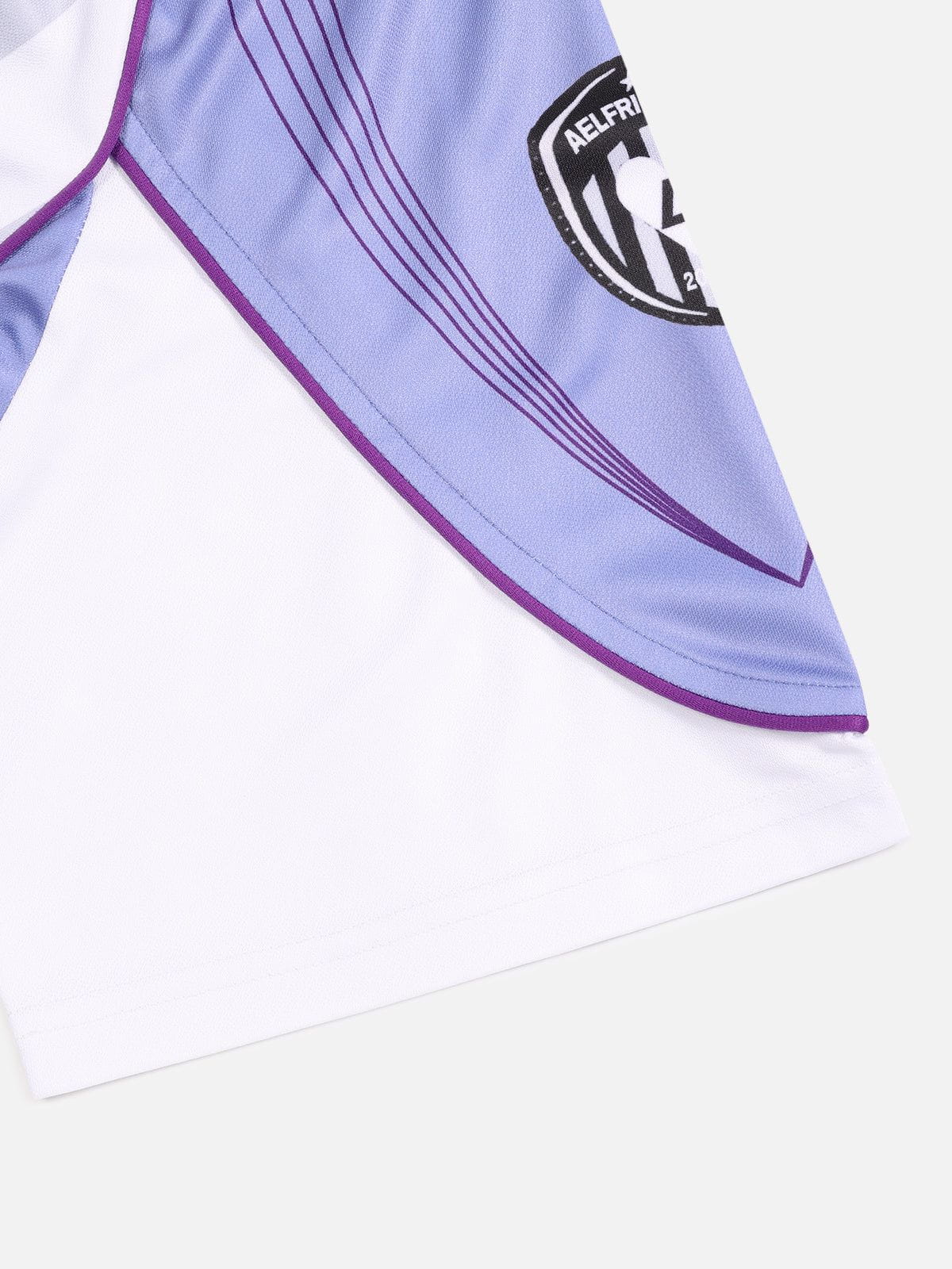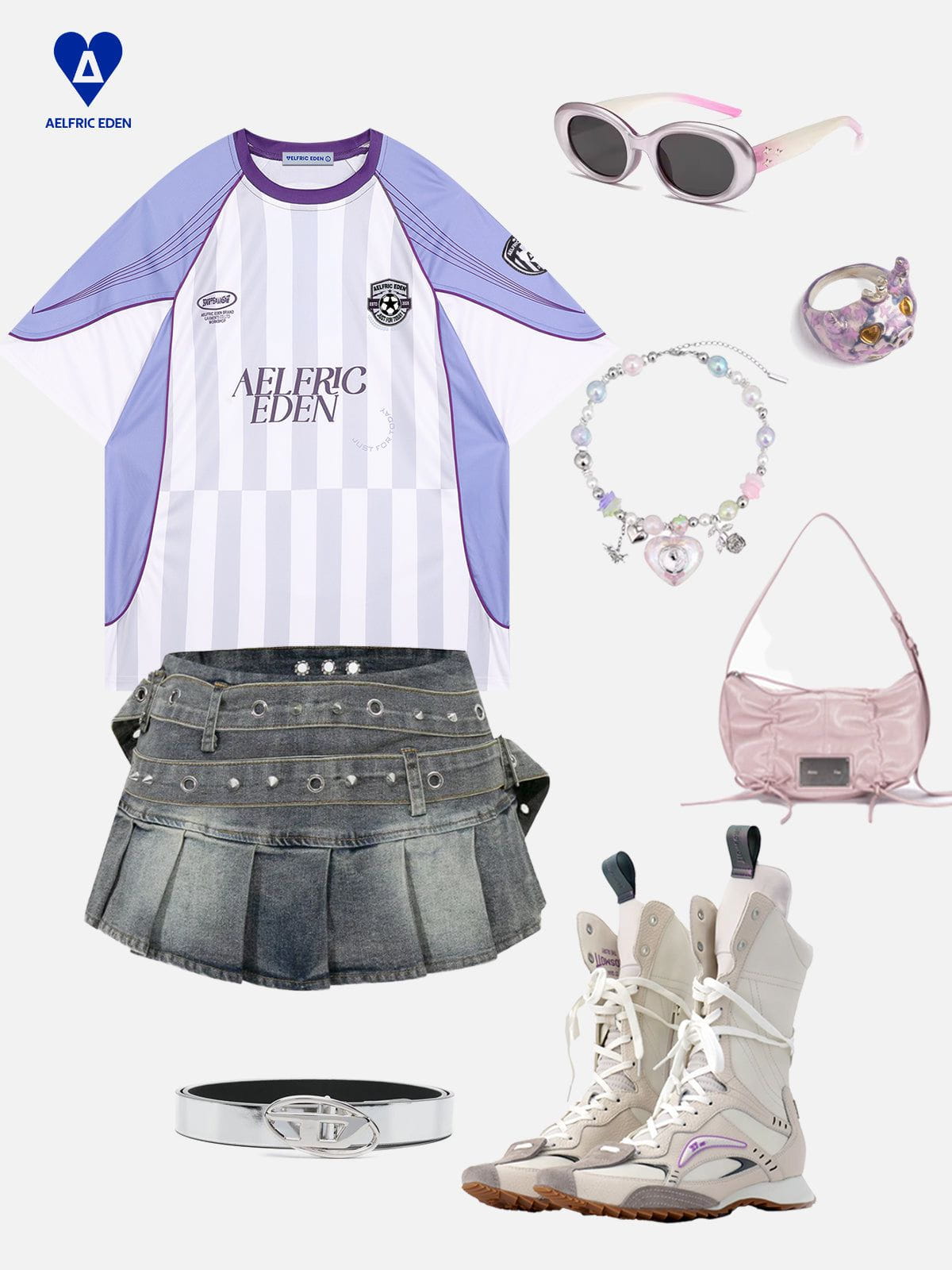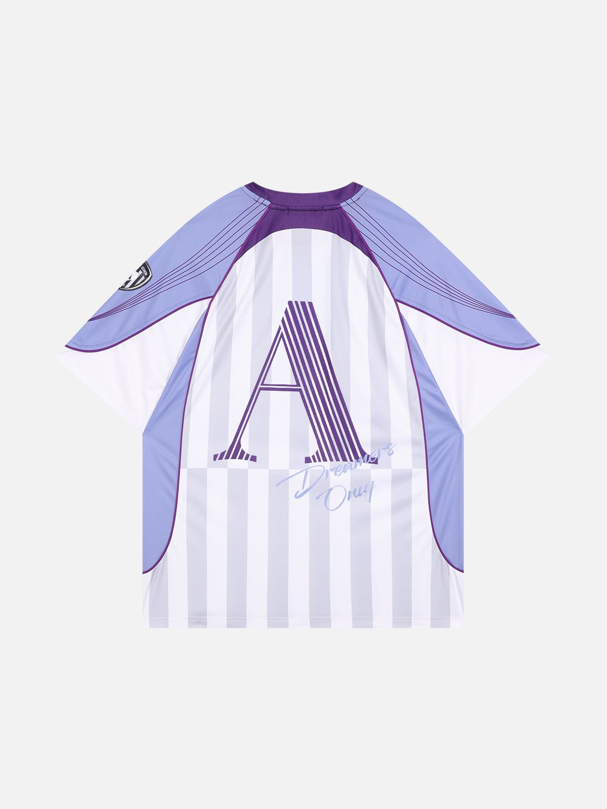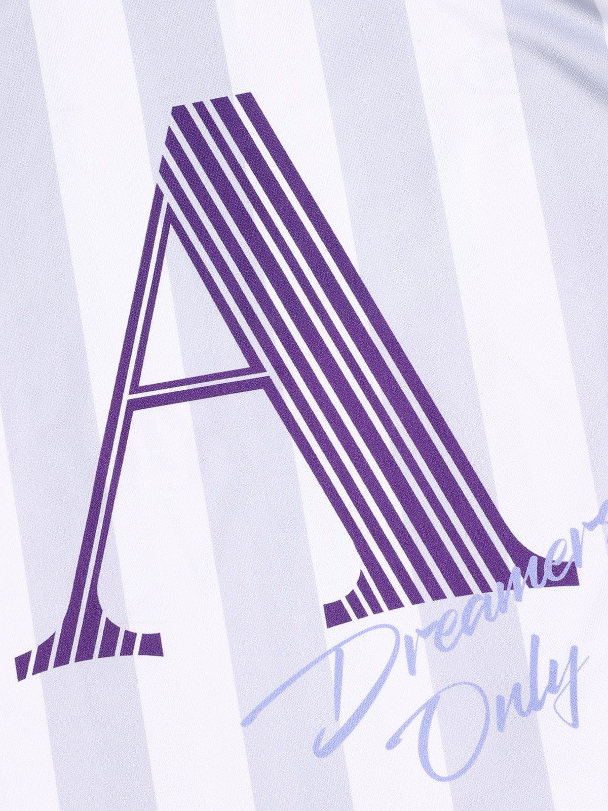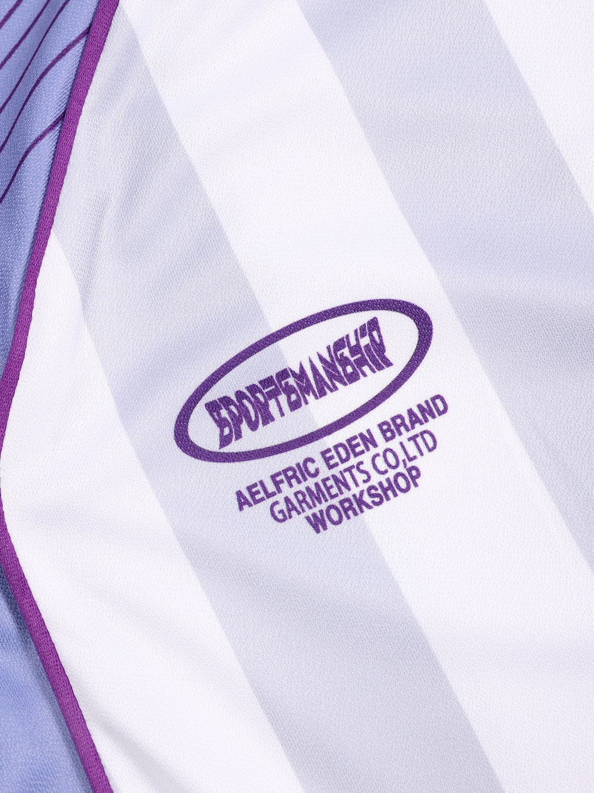 This Aelfric Eden jersey reimagines the classic soccer silhouette with a pastel twist. Featuring soft lavender and white vertical stripes. contrast paneling. and vintage-inspired patches. it’s a statement piece that balances sport and style. The relaxed fit and breathable fabric make it a go-to for both comfort and edge.