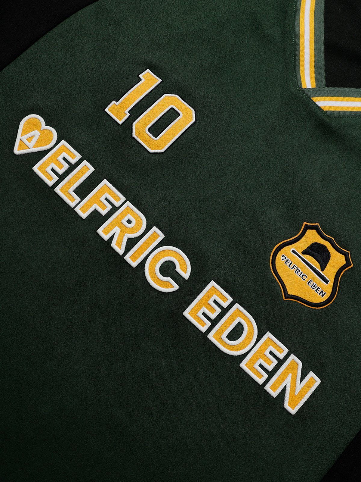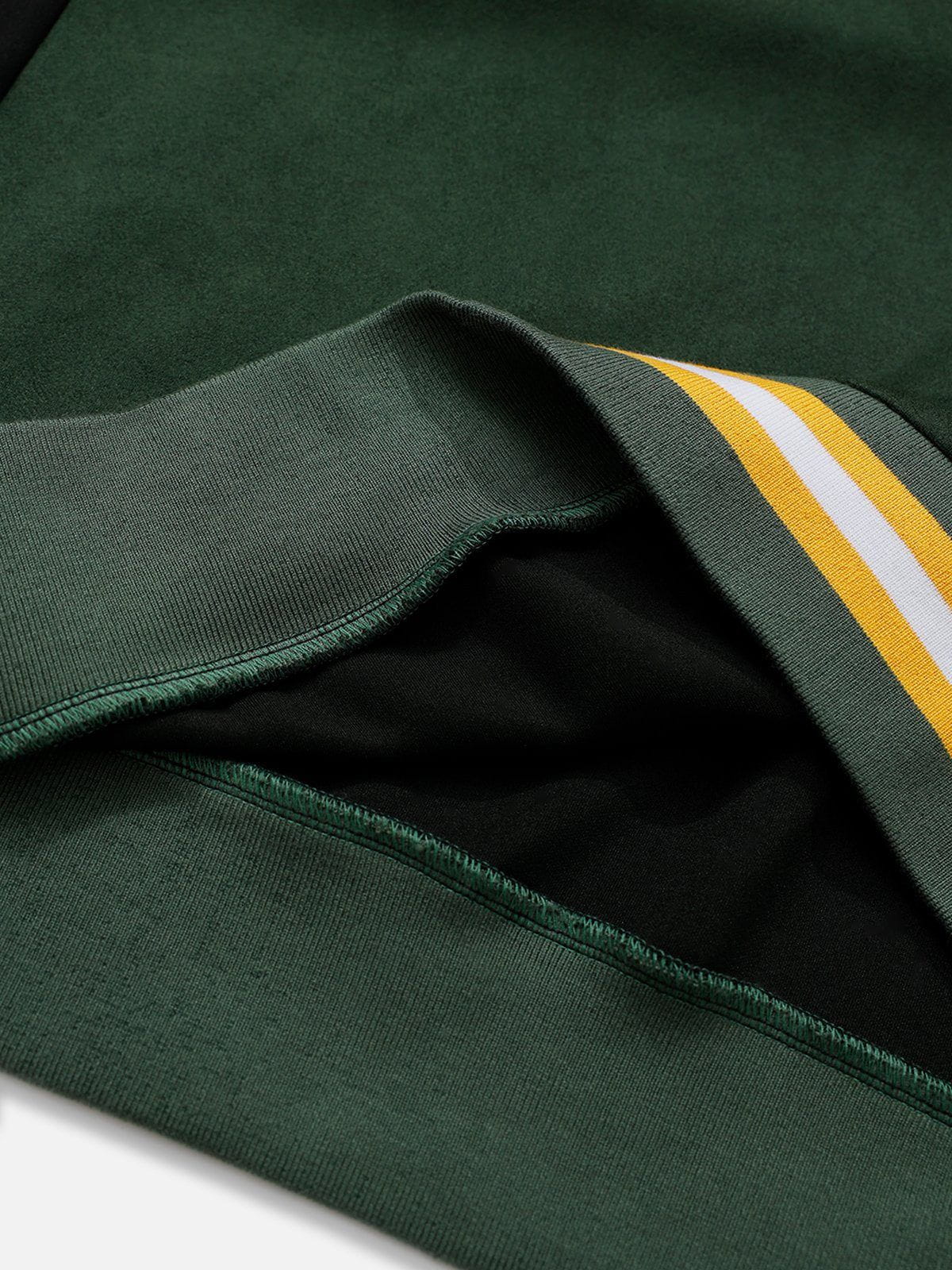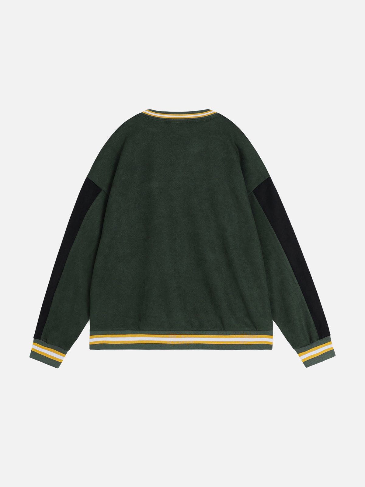 This sweatshirt features a bold color-blocking design with contrasting green and black tones. complemented by embroidered details for added texture and style. Crafted from soft suede fabric. it offers a luxurious feel and a relaxed fit.
