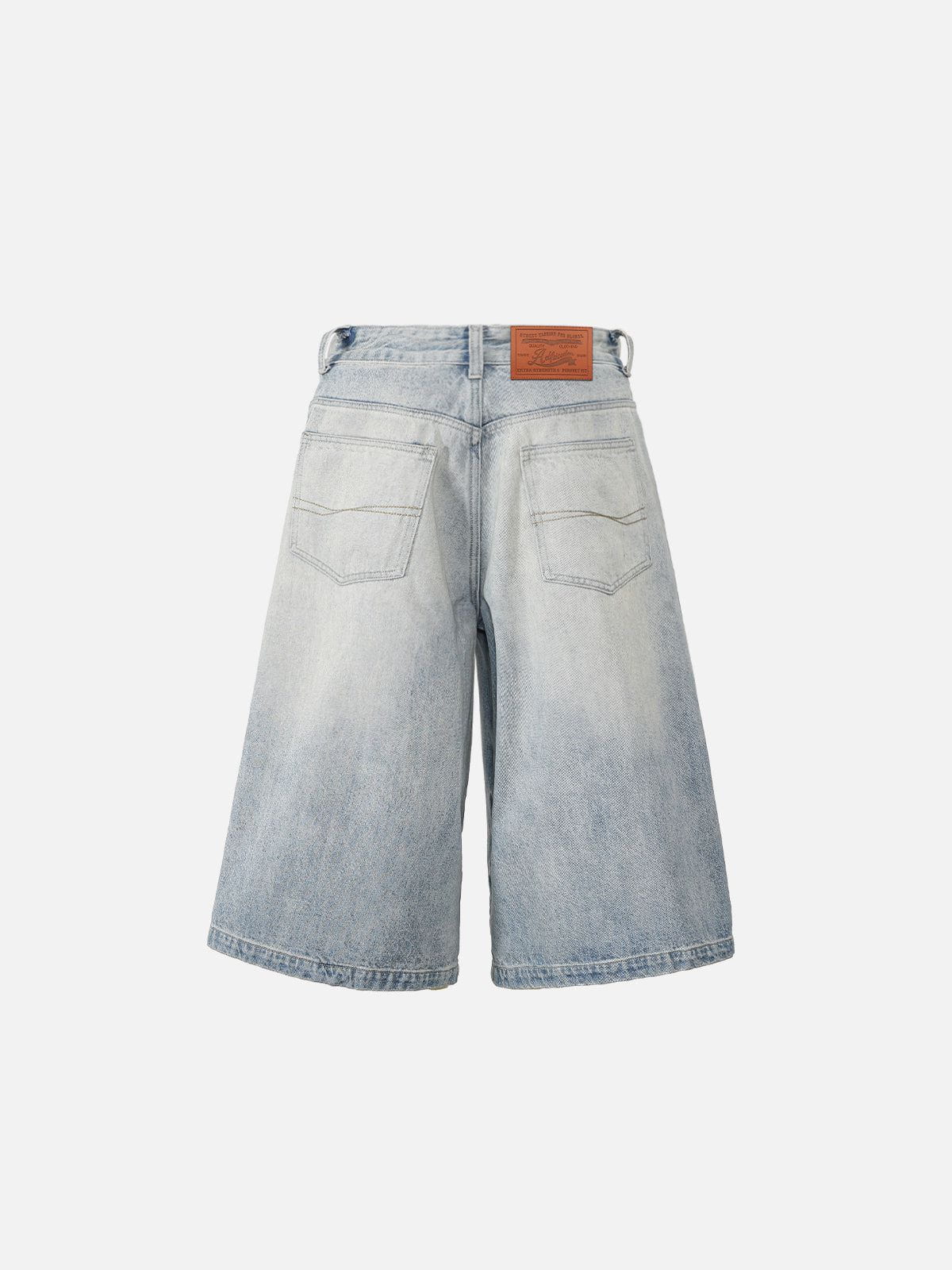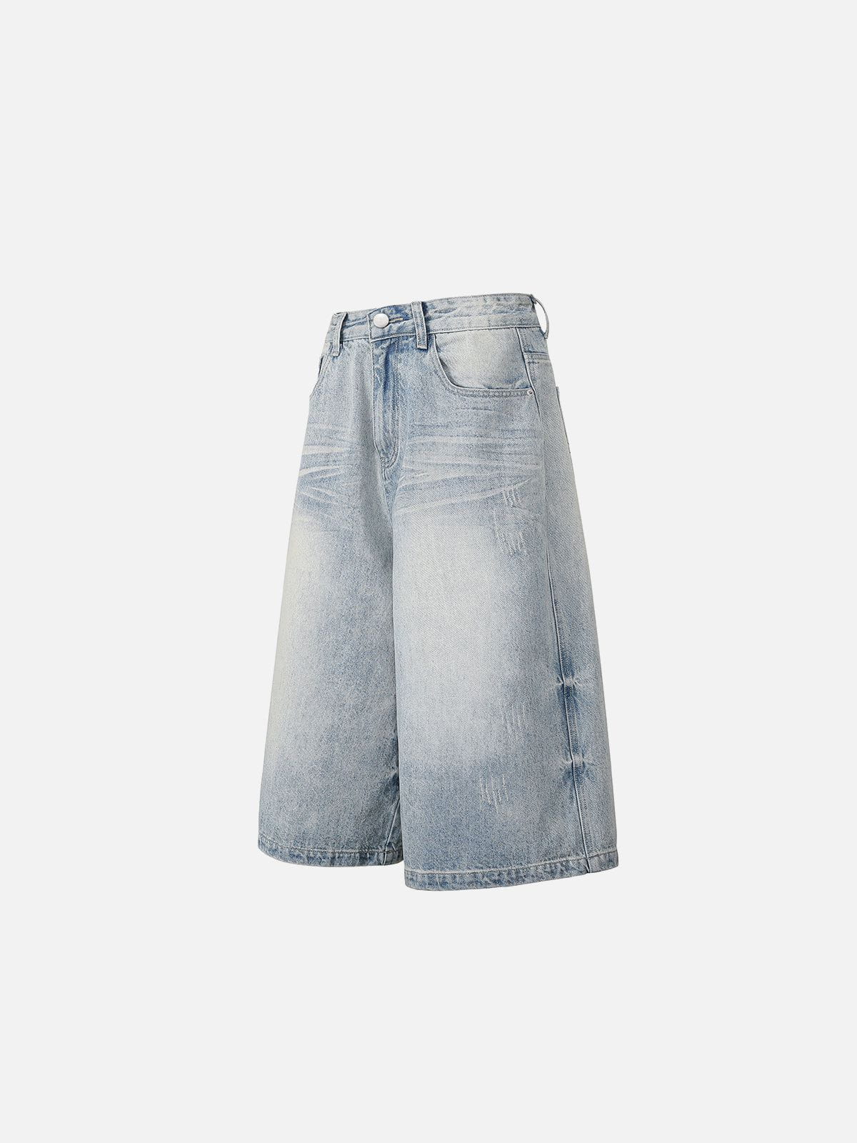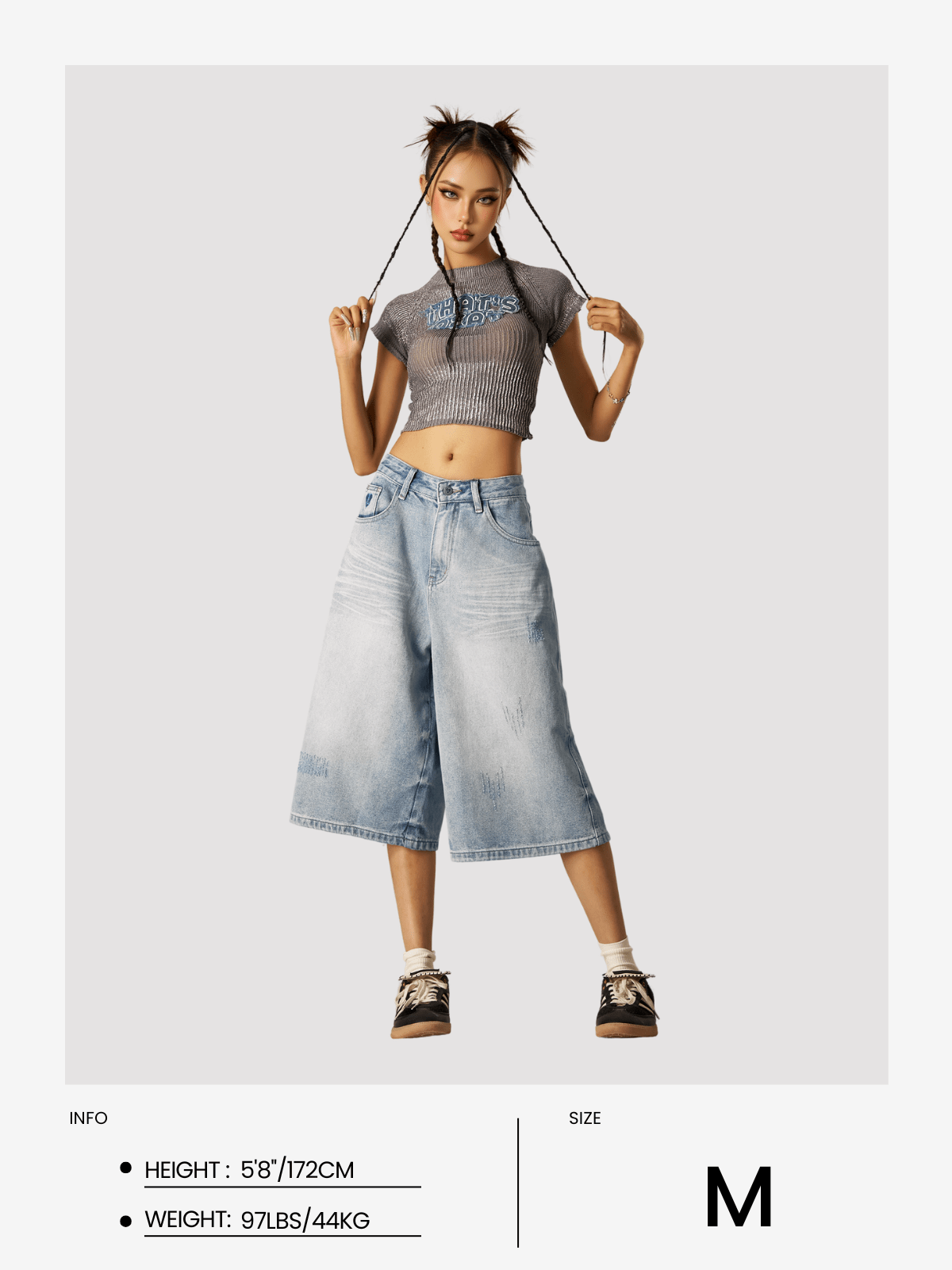 These loose-fitting longline jorts bring a vintage-inspired edge with their distressed. washed denim finish. Designed for a relaxed and effortless vibe. they feature subtle whiskering and fading for a naturally worn-in look.