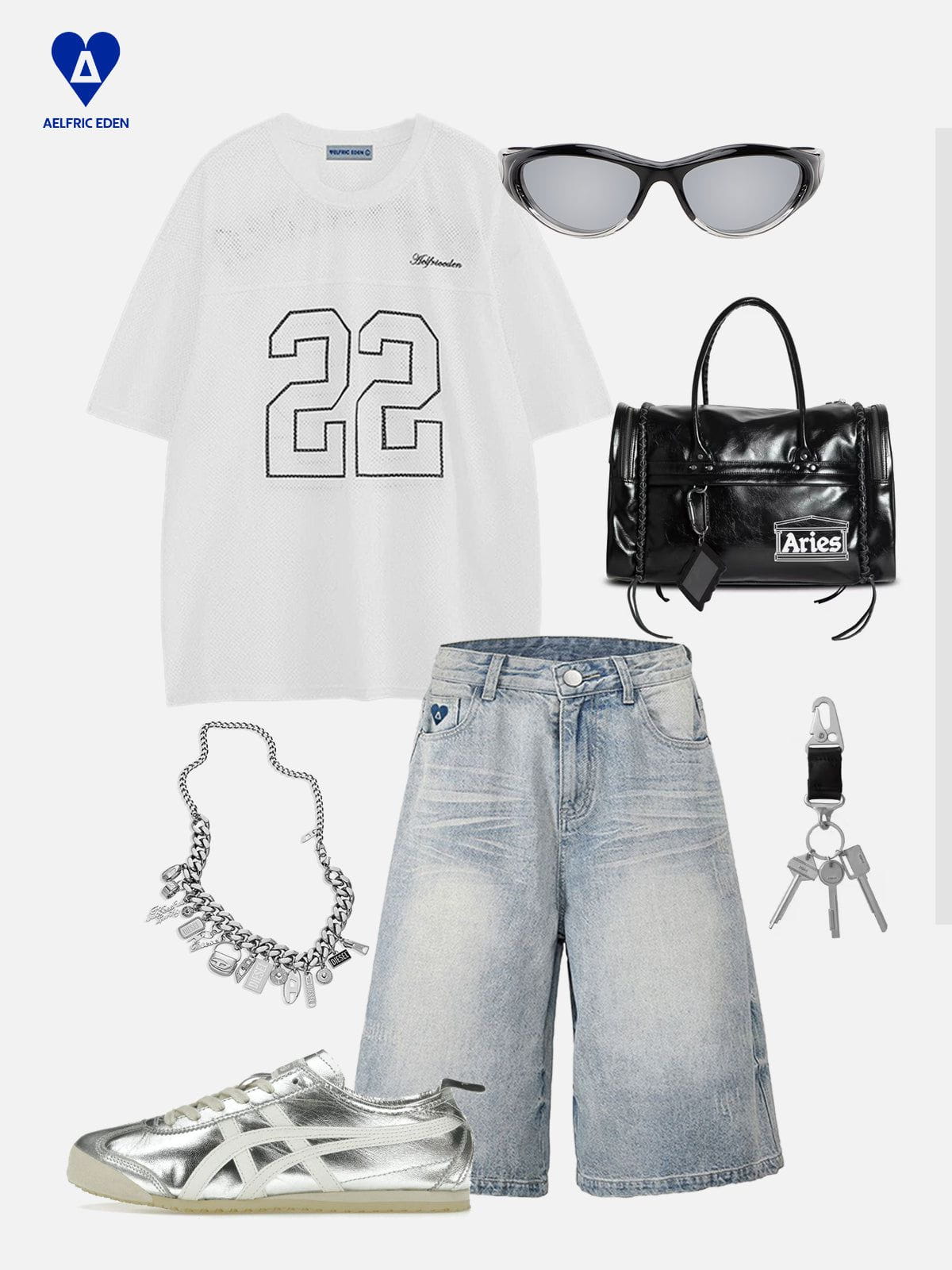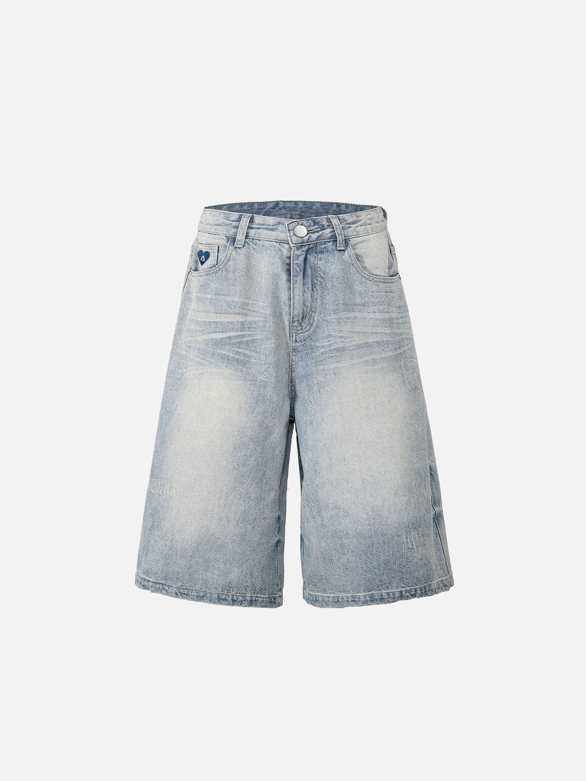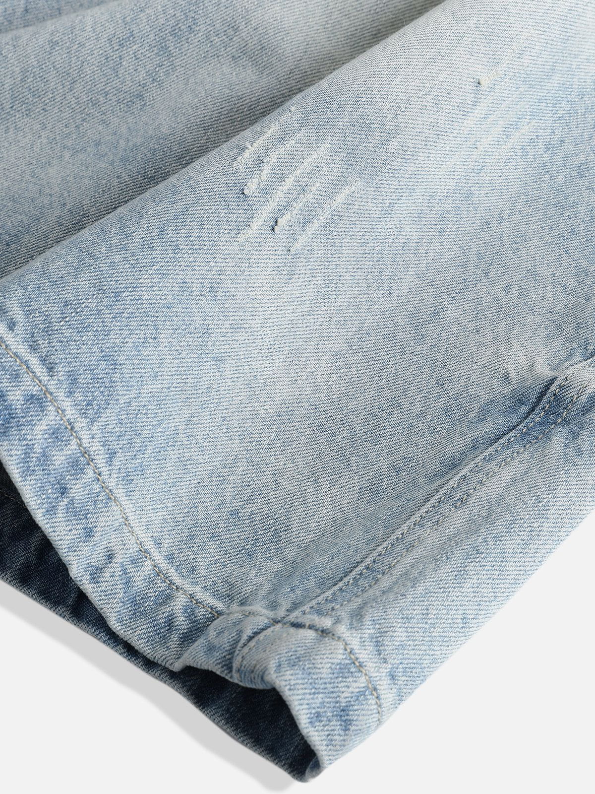 These loose-fitting longline jorts bring a vintage-inspired edge with their distressed. washed denim finish. Designed for a relaxed and effortless vibe. they feature subtle whiskering and fading for a naturally worn-in look.