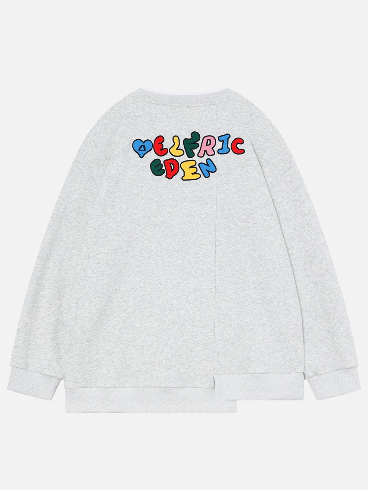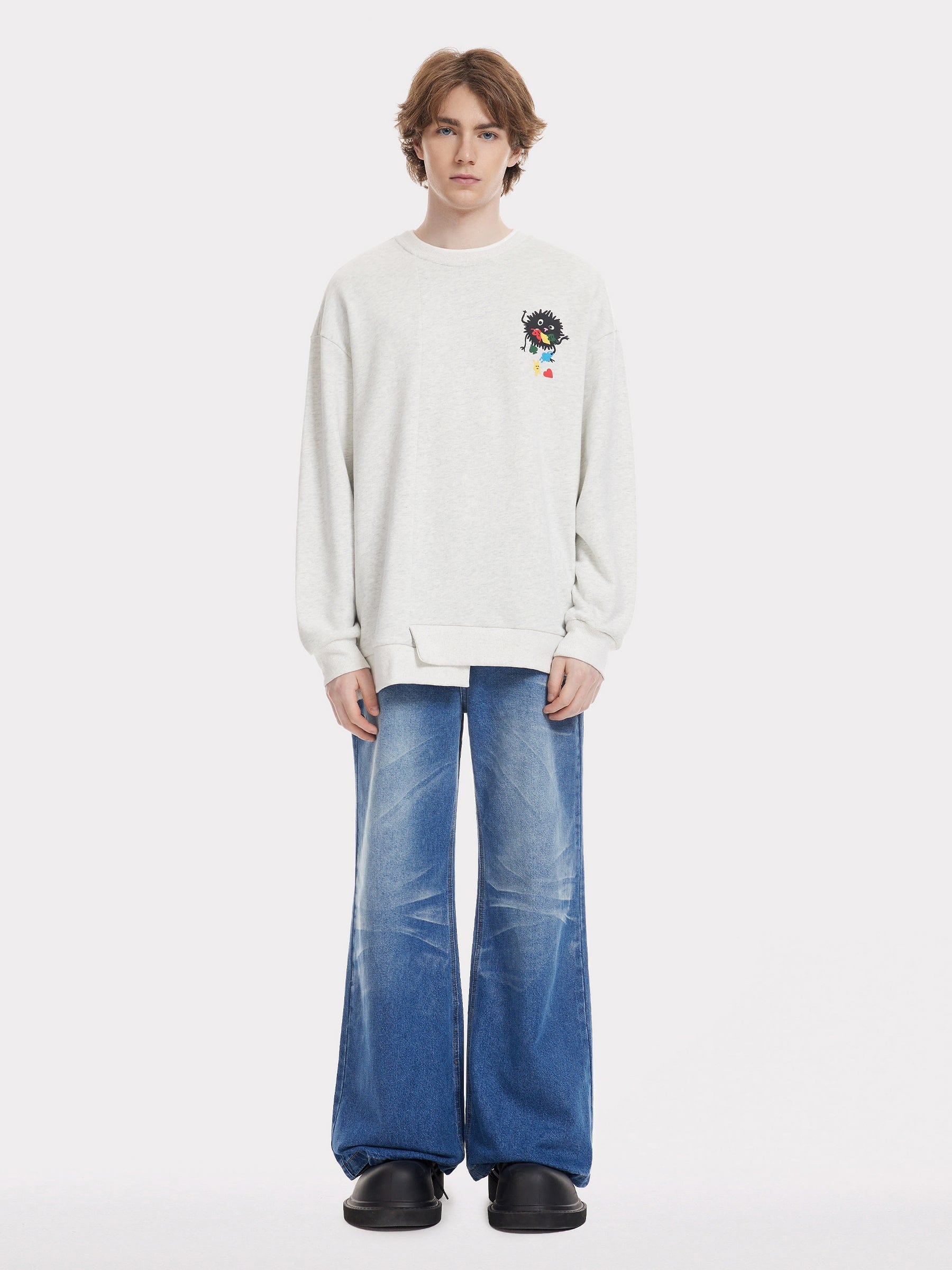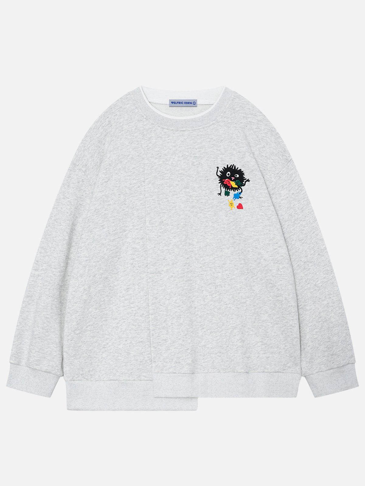 Step into the realm of solid colors with our round-neck sweatshirt. where the dreamweaver. brings a vibrant bunch of little monsters called Dottie to this unexplored territory. Adding cuteness and magic to this newfound land.