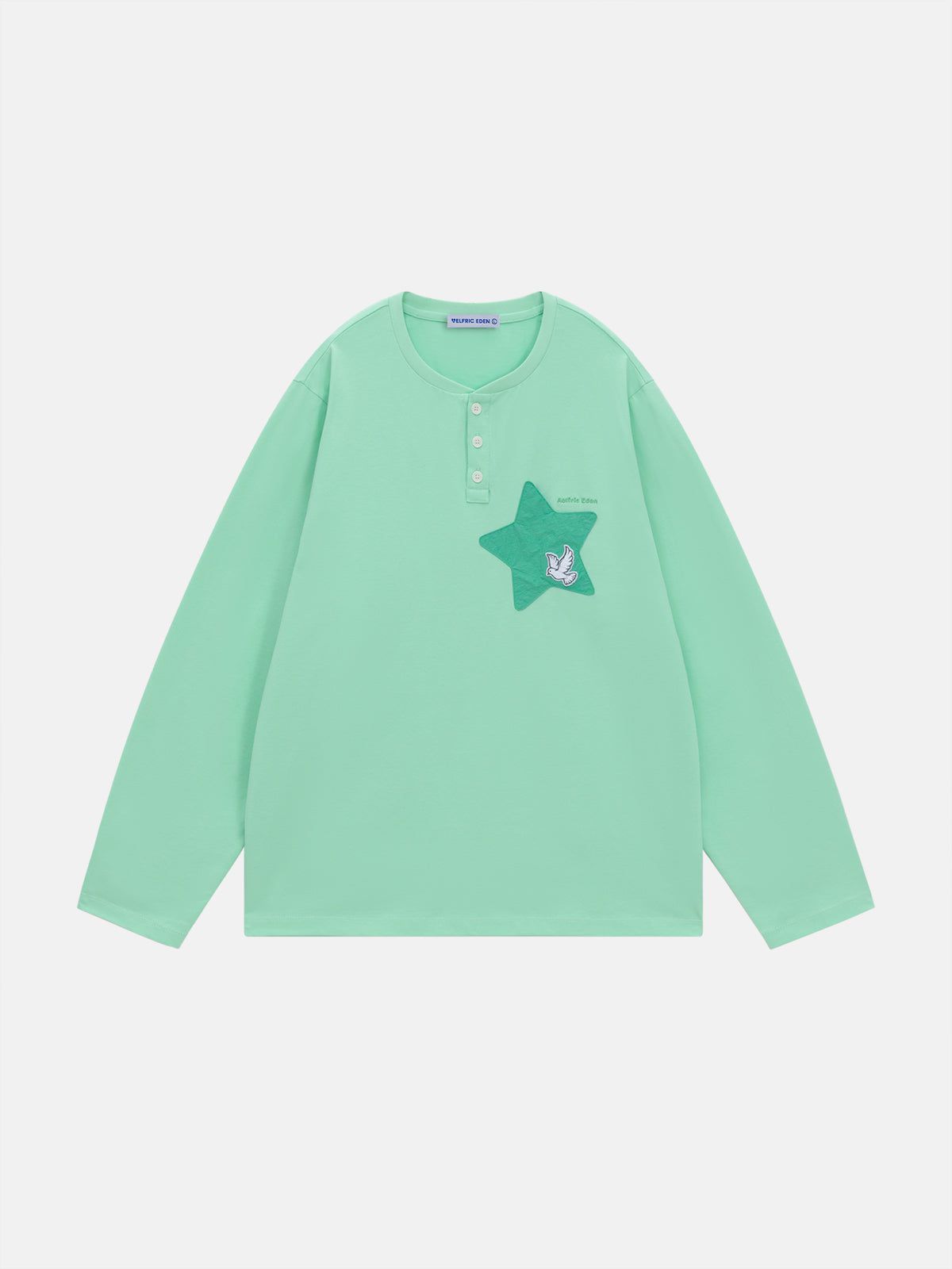 Rendered in a playful mint green. this tee features a star patch with an embroidered dove for a soft streetwear twist. The henley neckline adds a classic touch to its youthful charm. Light and breezy. it’s a laid-back essential with character.