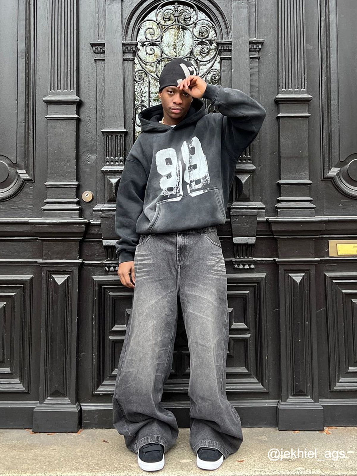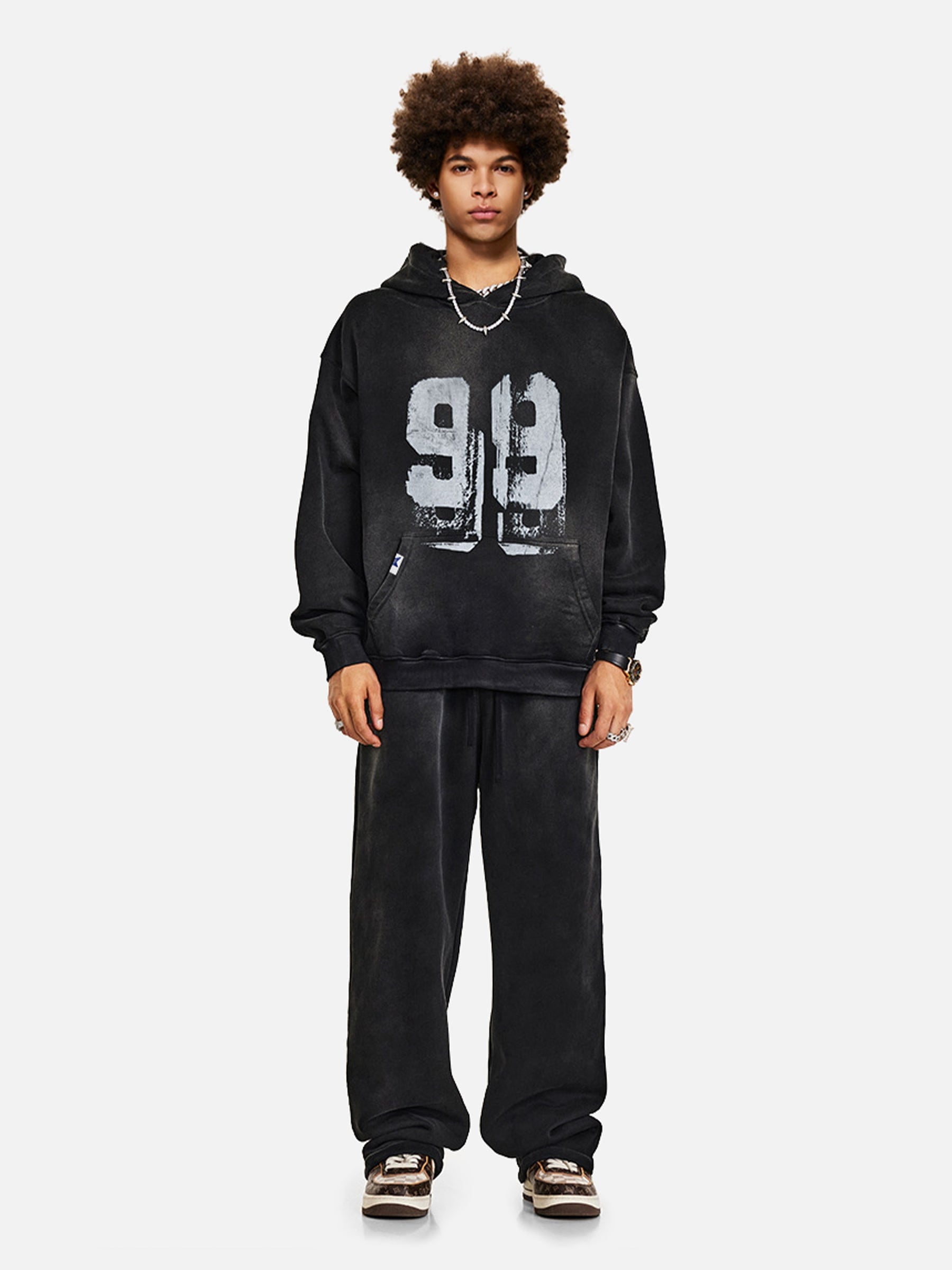 Featuring a striking 99 graffiti design on the front. this hoodie is accented with a distressed. washed finish that gives it a vintage edge. The thick interior provides extra warmth. while the relaxed fit. kangaroo pocket. and hood offer comfort and functionality. making it a great choice for colder days with a bold. street-style vibe.
