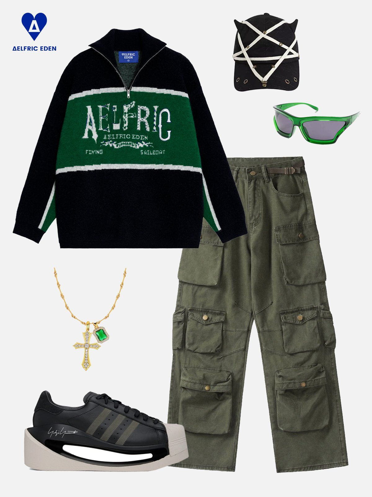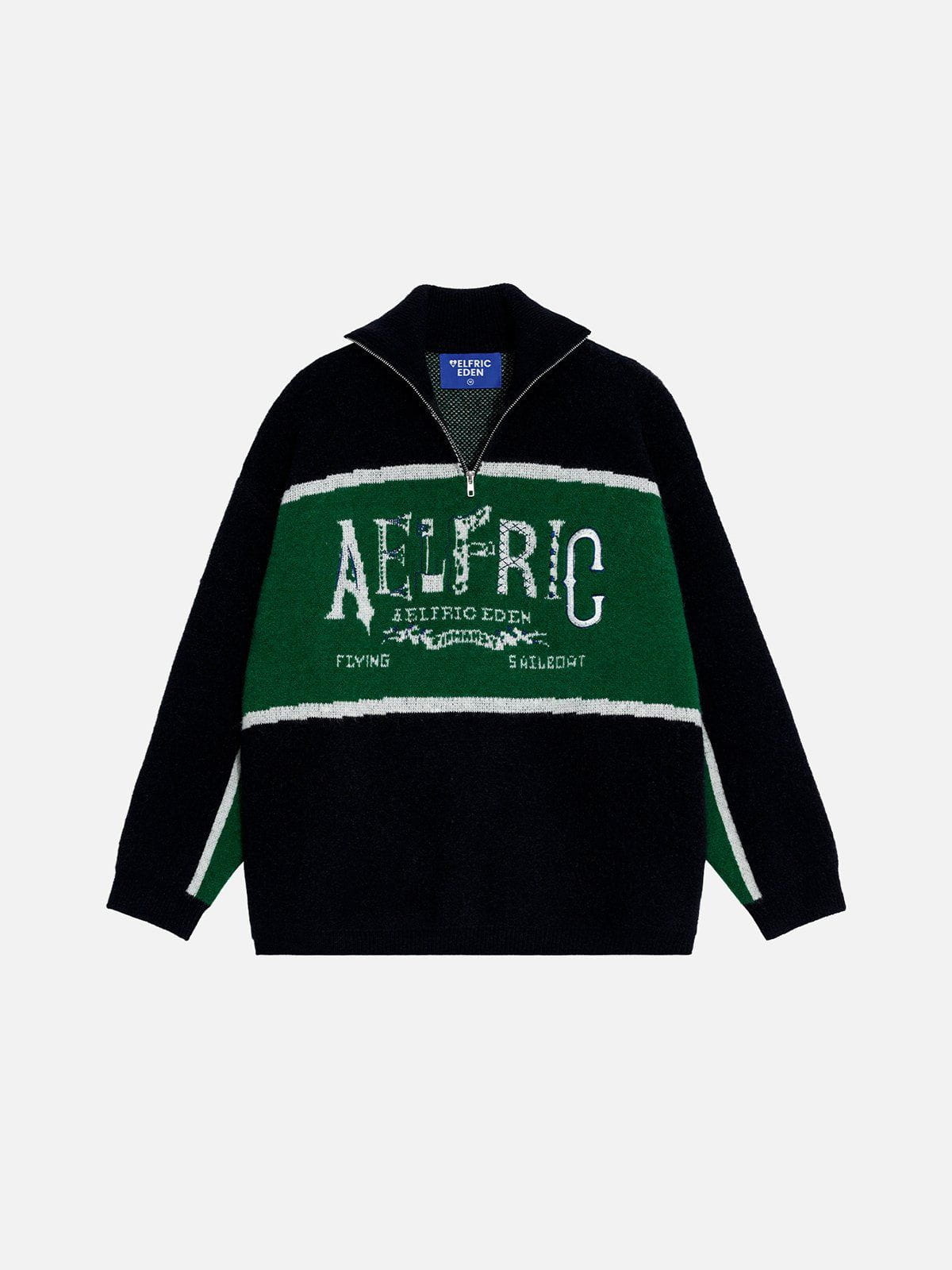 Bold and Unique with our Half Zip Sweater! Featuring a striking black and green color-block design. this sweater brings effortless edge to your look. The jacquard brand pattern on the chest adds a signature touch. making it a perfect fusion of style and individuality. true to Aelfric Eden’s bold spirit.