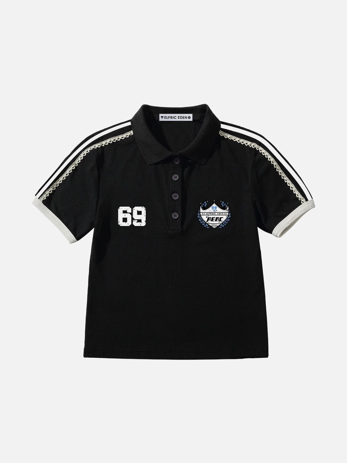 Old school varsity meets new wave flair. This isn’t your average polo??shaking things up with lace-up shoulders. colorblock cuffs. and racing-inspired badge embellishments.