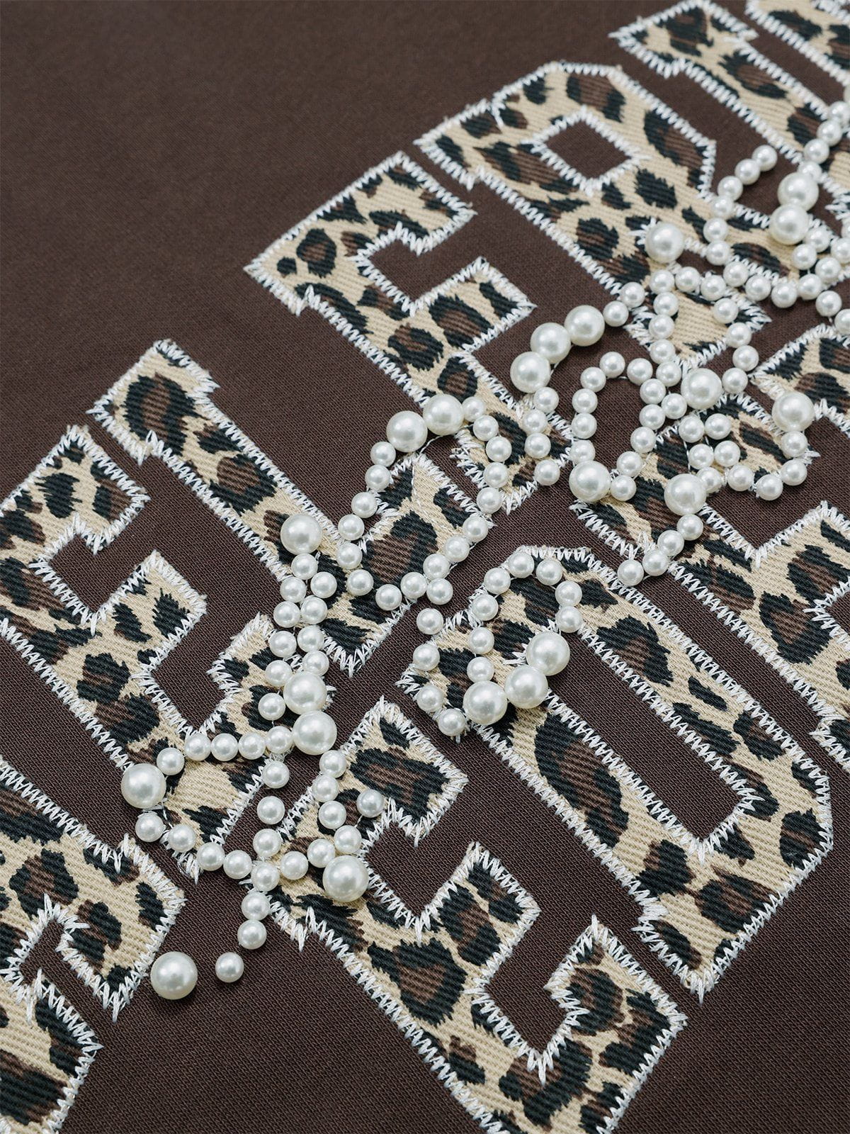 The Leopard Print Pearl Hoodie blends edgy animal print with elegant pearl embellishments. creating a bold yet chic style. Its comfortable fit and unique design make it a standout piece. perfect for adding a touch of glamour to casual wear.