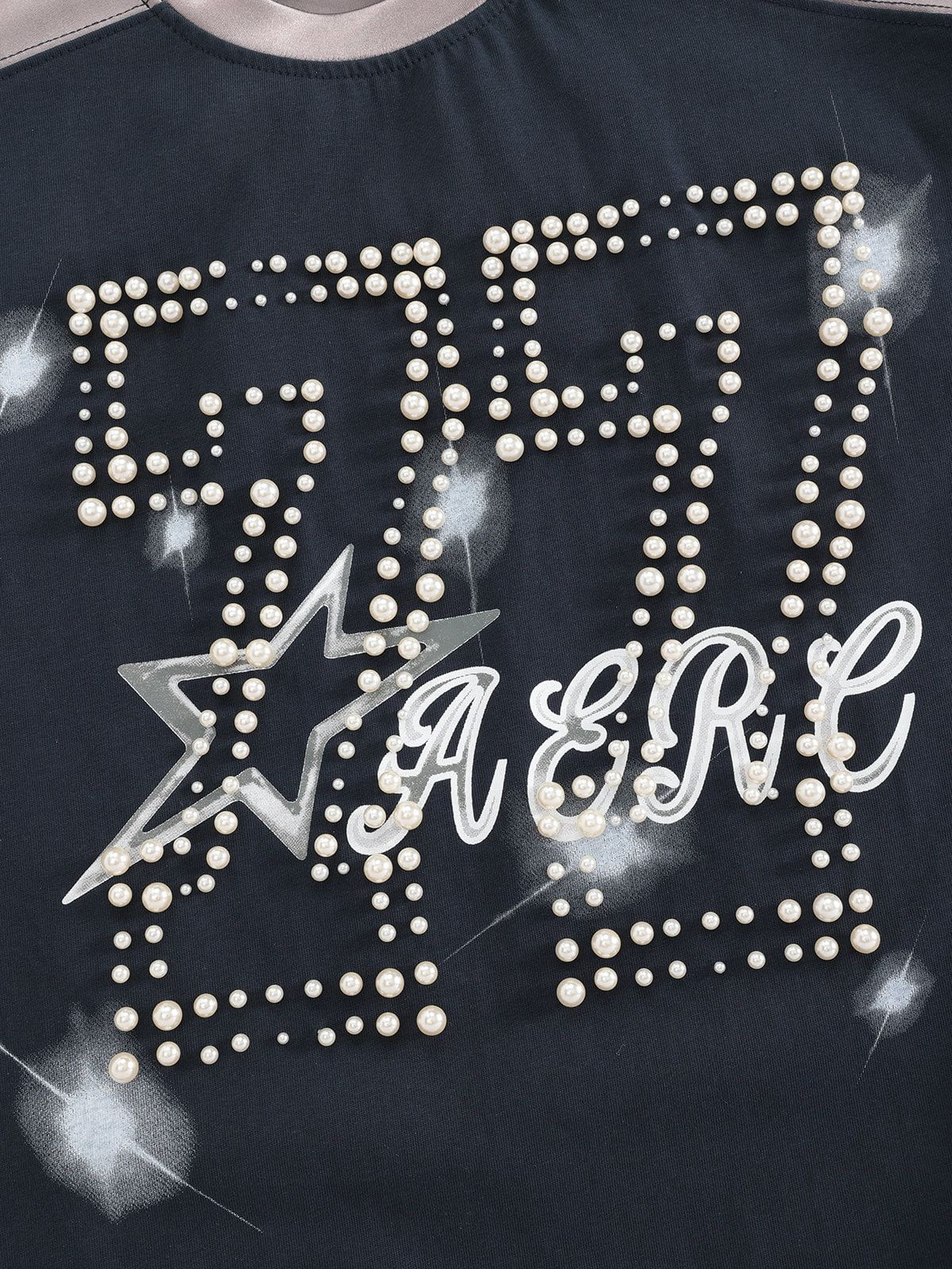 This street-smart crewneck tee dazzles with the bold 77 crafted from shimmering faux pearls a?? pure eye candy. Made from 100% breathable cotton. it blends luxe flair with all-day comfort. perfect for sporty. casual cool vibes.
