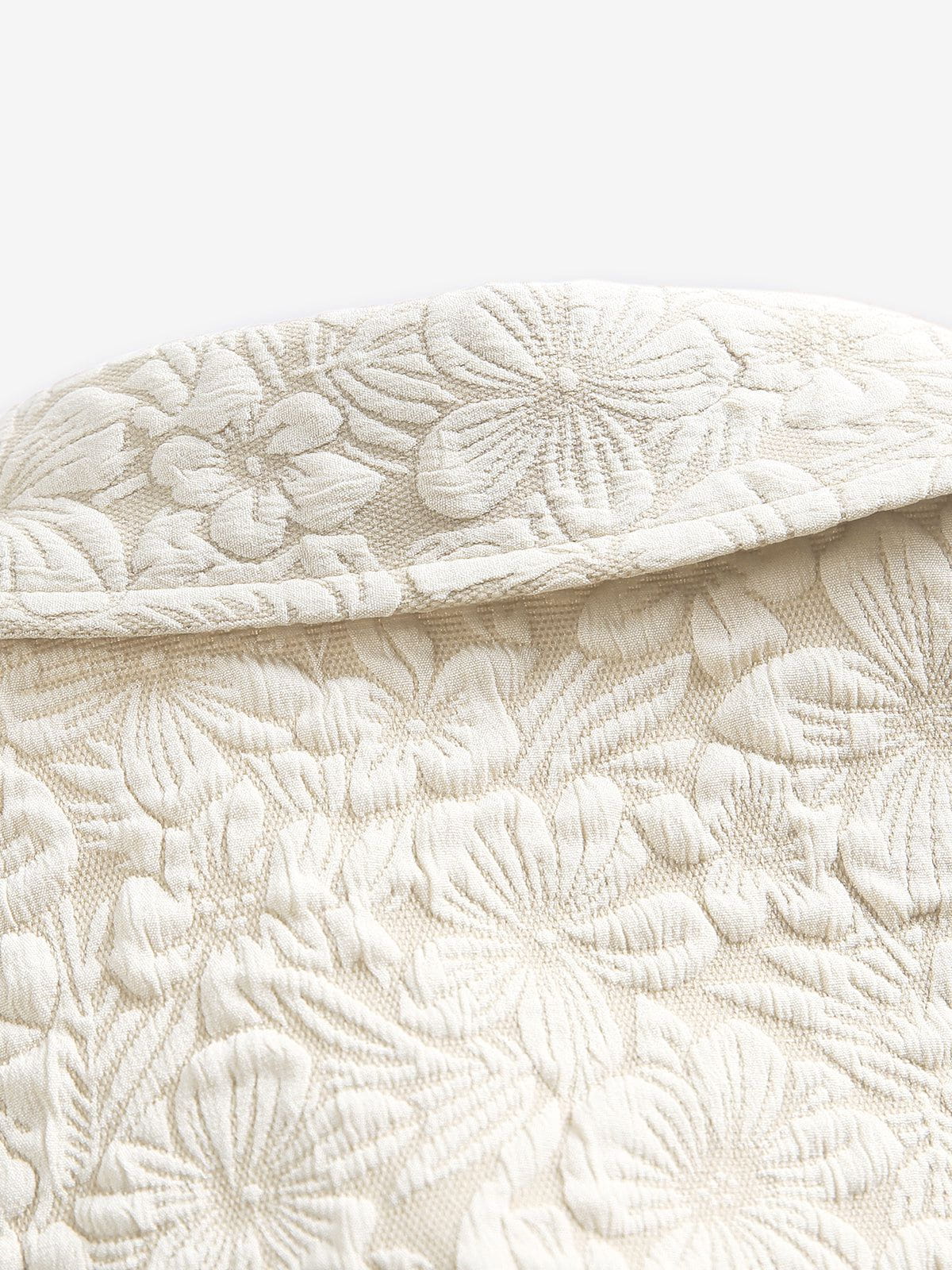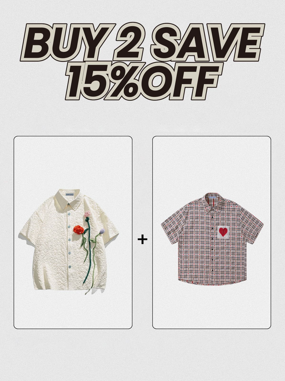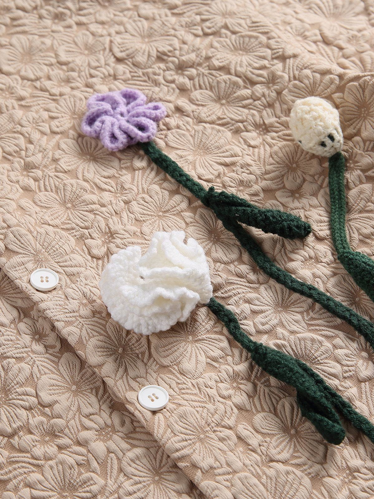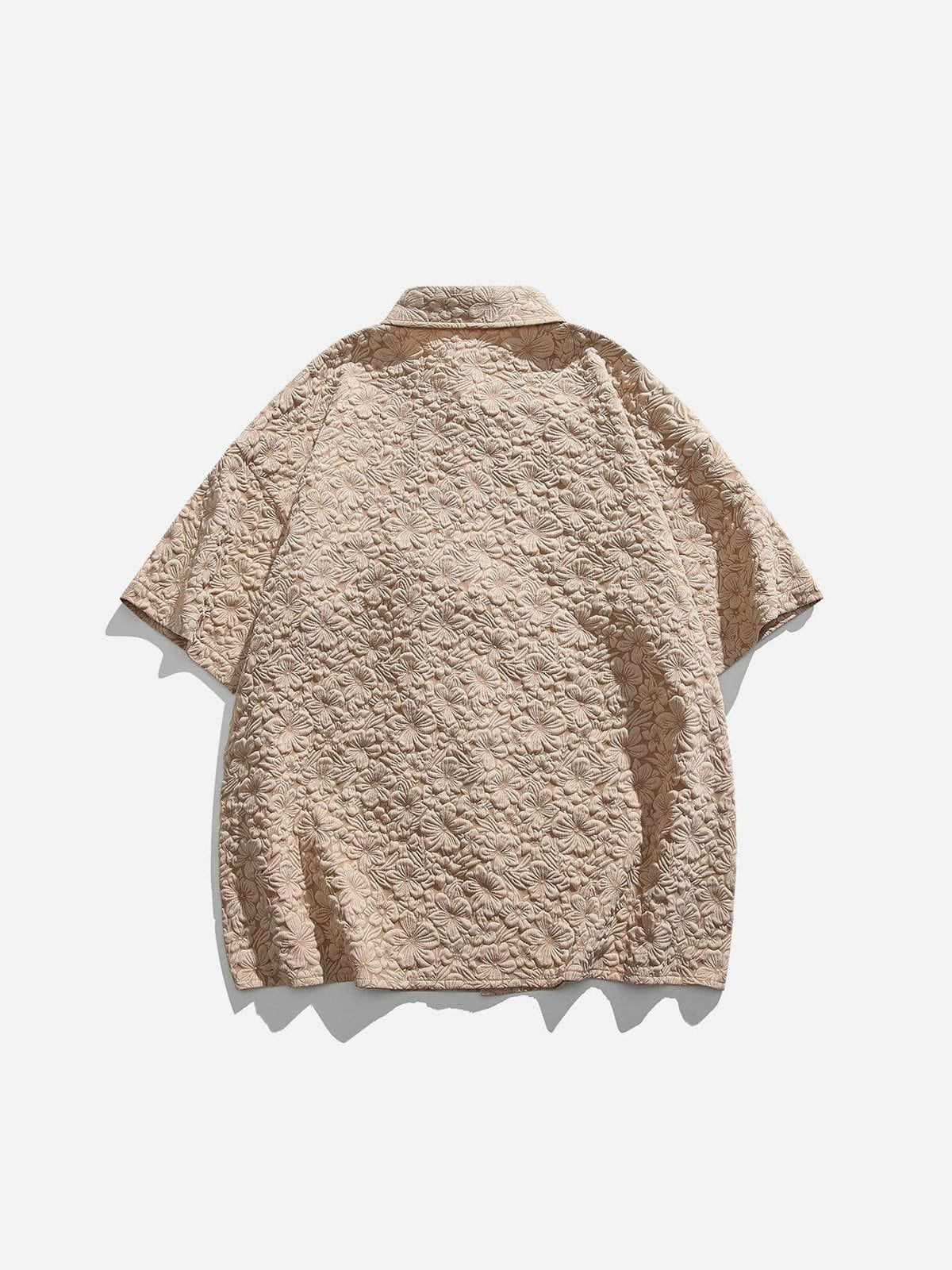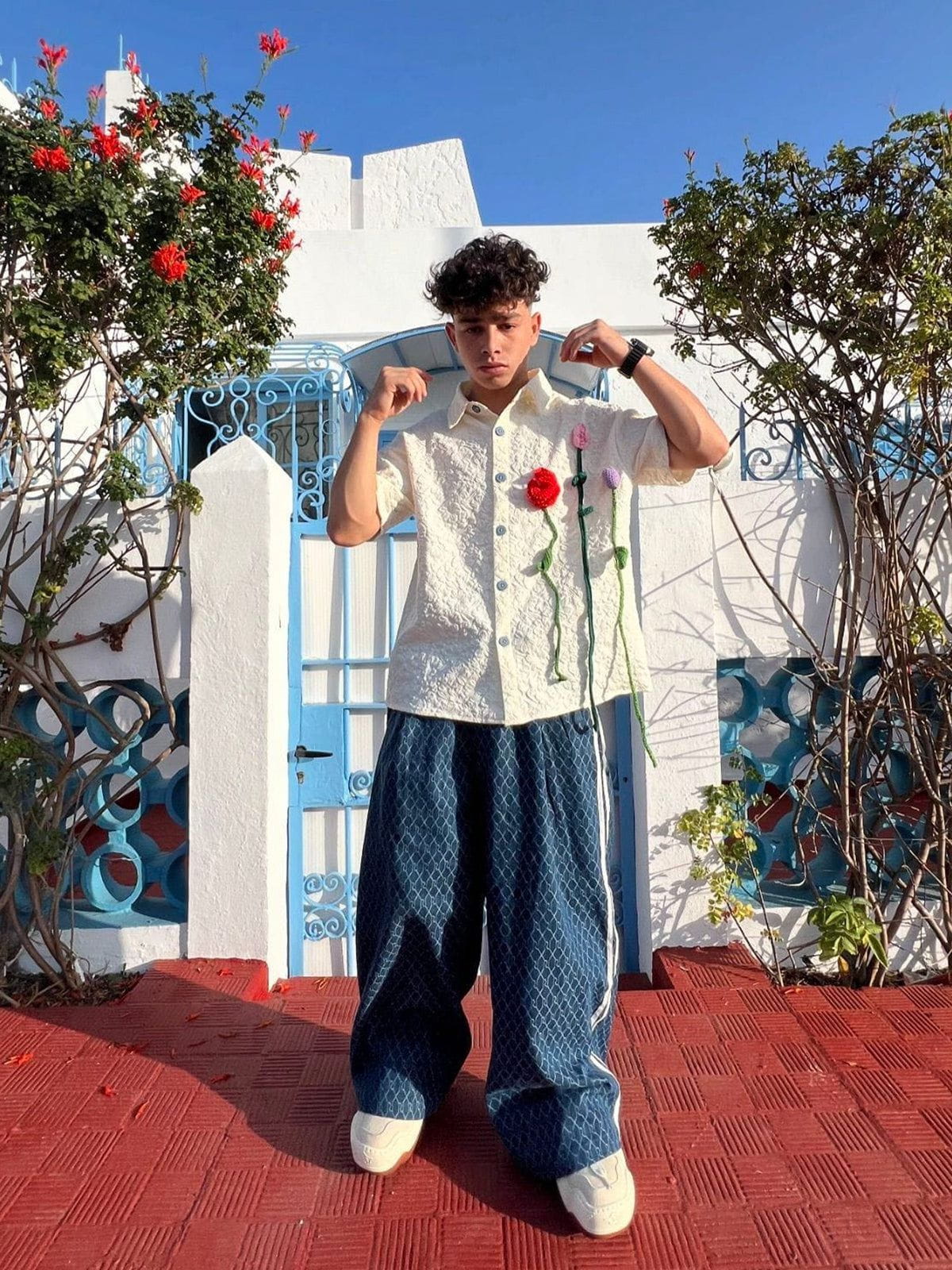 The shirt showcases intricate design elements. Its fabric boasts a subtle floral patterned texture. adding depth and dimension to the overall look. Additionally. the handcrafted woven floral bouquet design on one side of the shirt adds a touch of sophistication and refinement. This clever design not only demonstrates the designer’s attention to detail but also imbues the shirt with a sense of luxury and elegance.