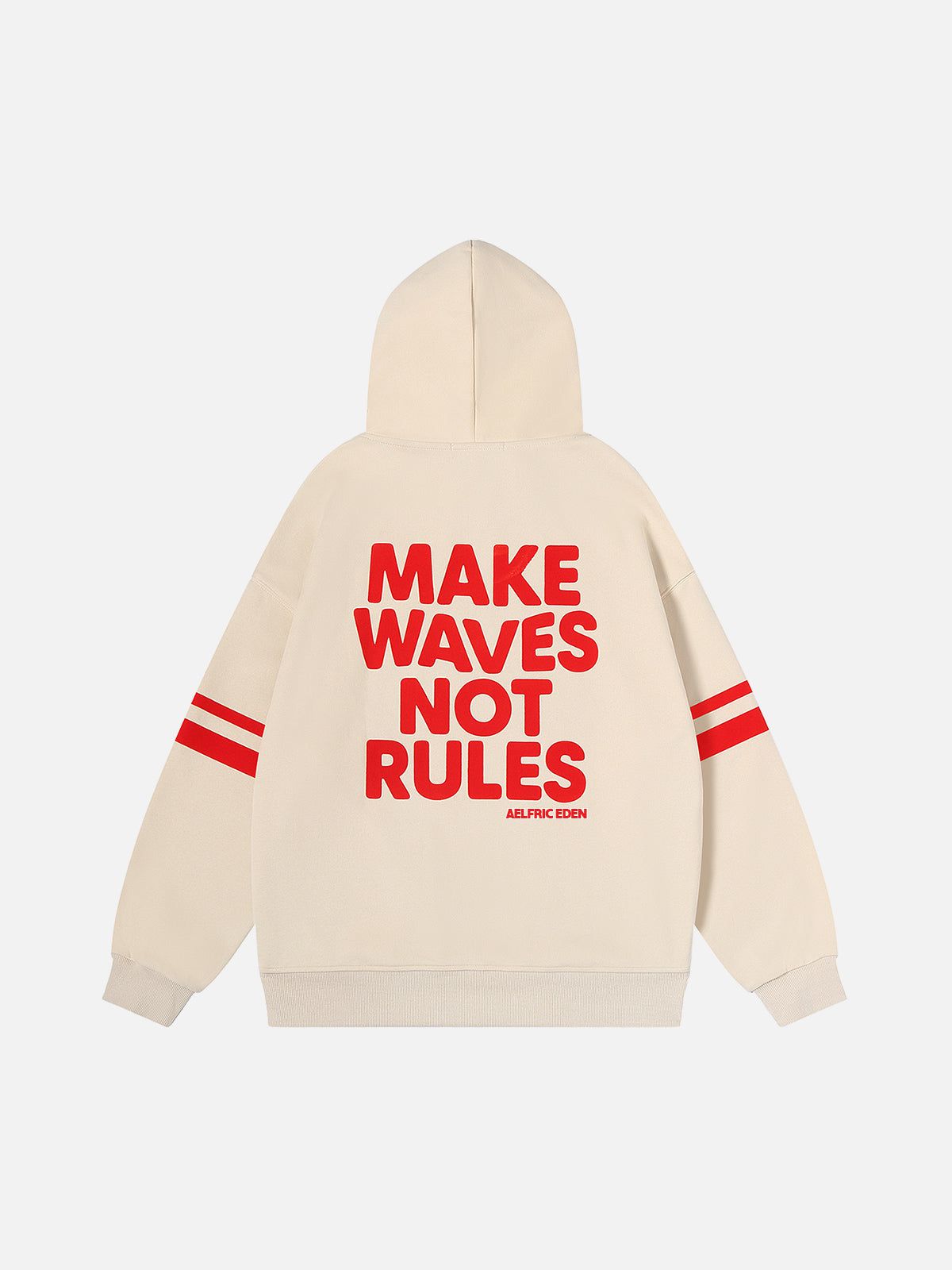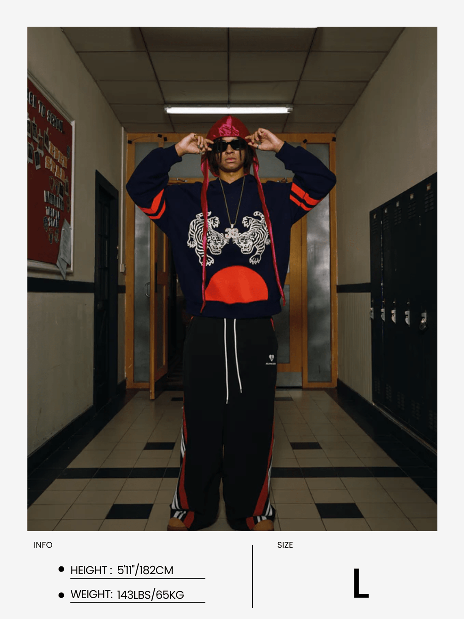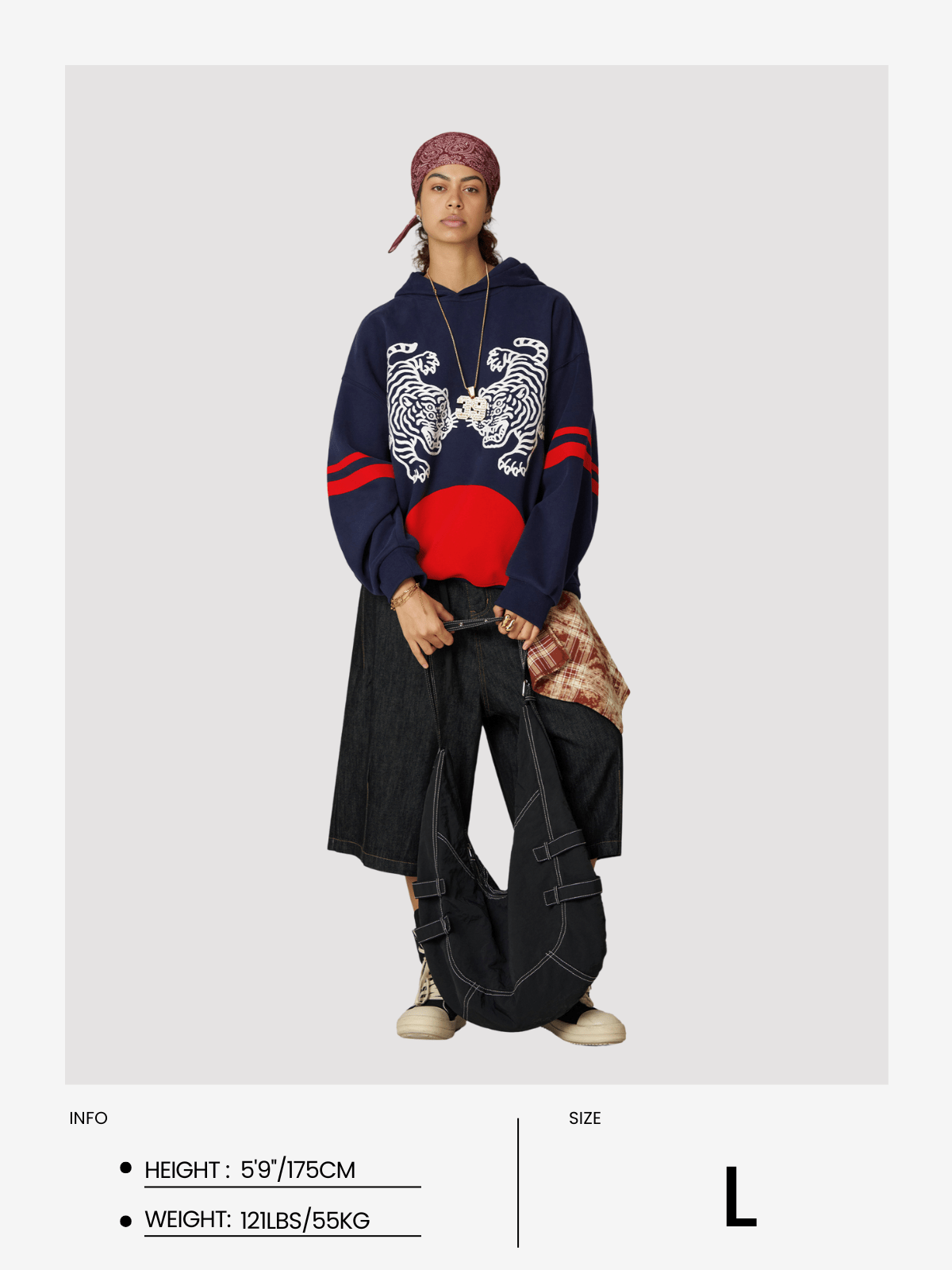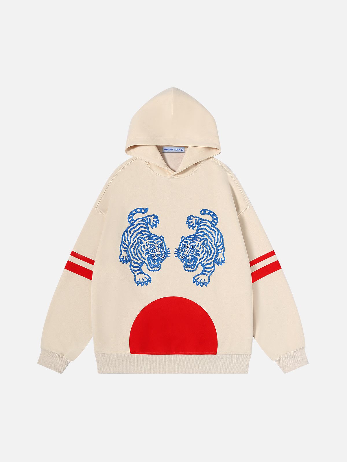 Roar with style in our bold tiger-print hoodie. Rule the urban jungle like the fearless kinga??MAKE WAVES NOT RULES. Defy norms in striking red/navy or red/apricot. Unleash your rebel spirit. one fierce step at a time.