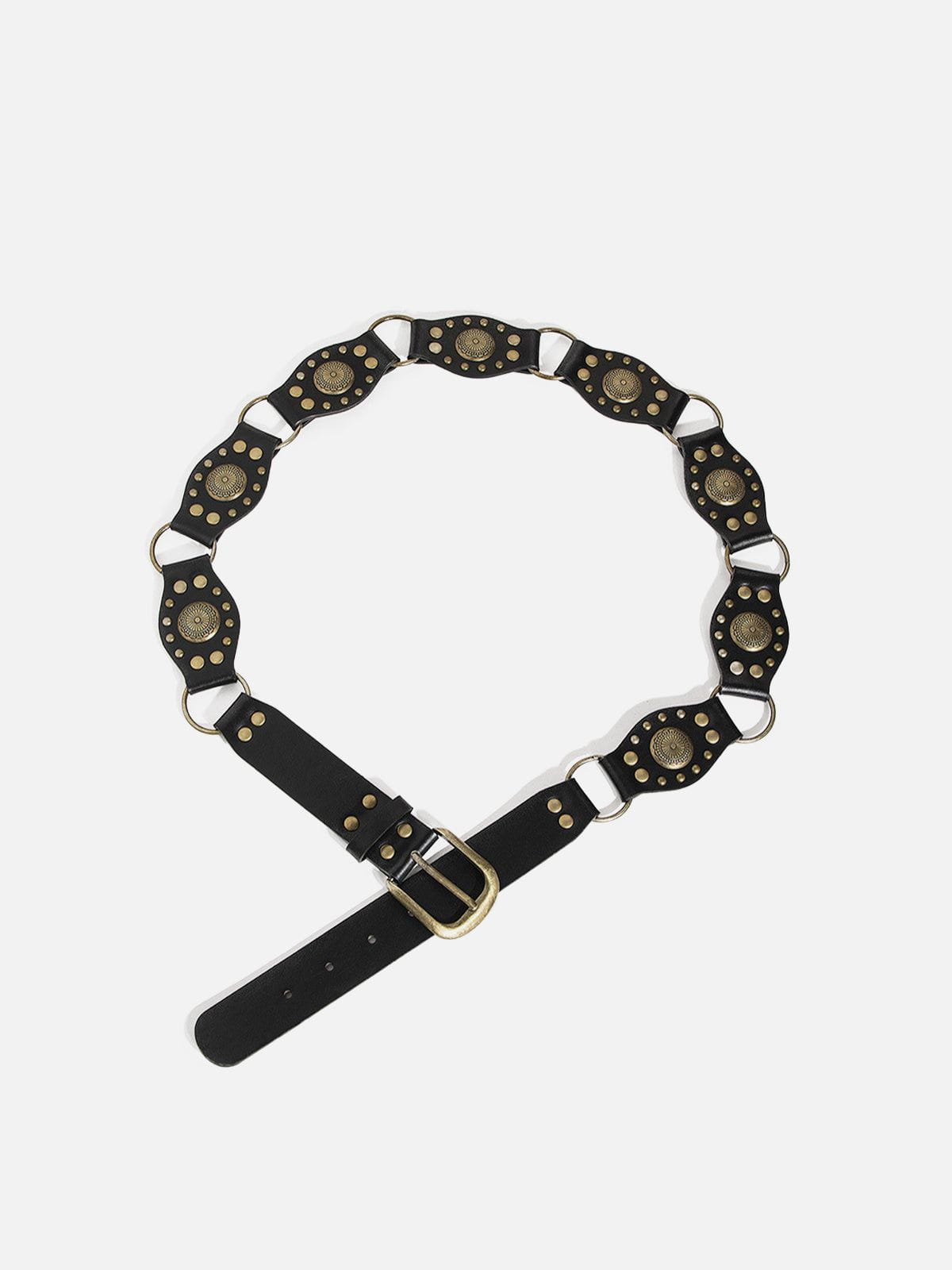 Crafted from faux leather with intricate cutout details and stud embellishments. this belt is a statement piece. Whether you’re rocking a street-retro. denim vintage. or boho-chic look. it adds the perfect finishing touch.